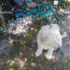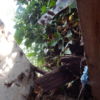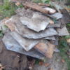 Das alte Dach musste erstmal runter. Da das Dach komplett mit Efeu zugewachsen war, habe ich zuerst die Pflanze entfernt. Letzlich ist da nichts geblieben außer einem Balken direkt am Haus, der noch verwendbar war. Der Rest war eine Mischung aus vermorschtem Holz, stückchenweise runtergezupfter alter Dachpappe und kaputten Eternitplatten.
