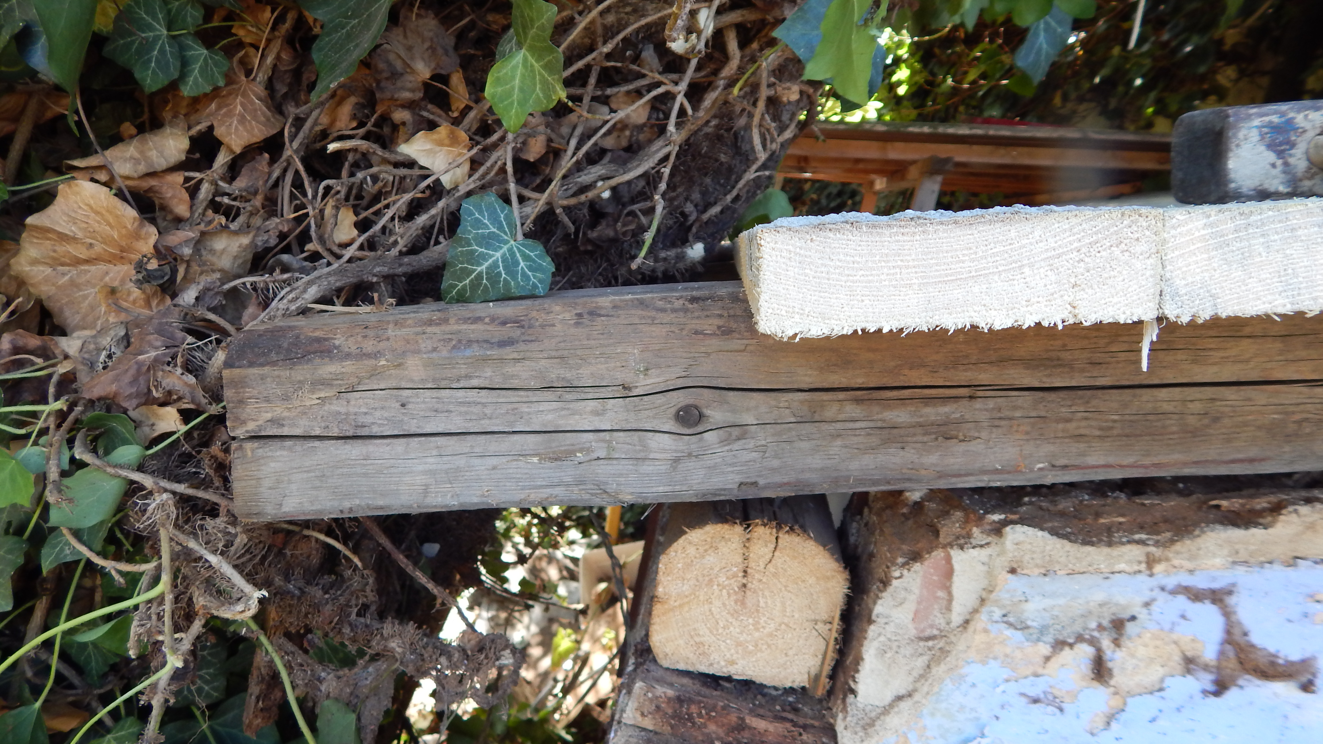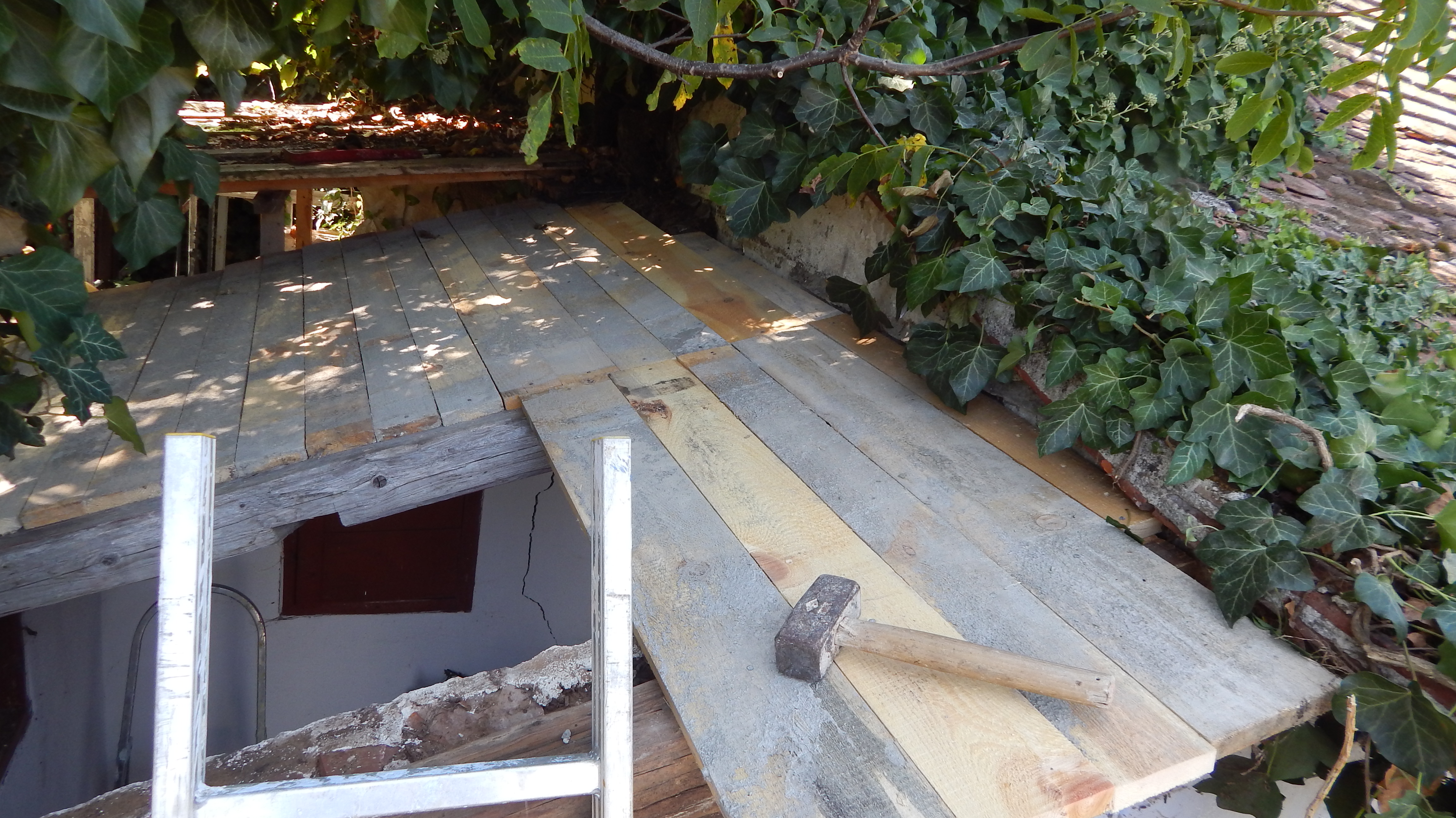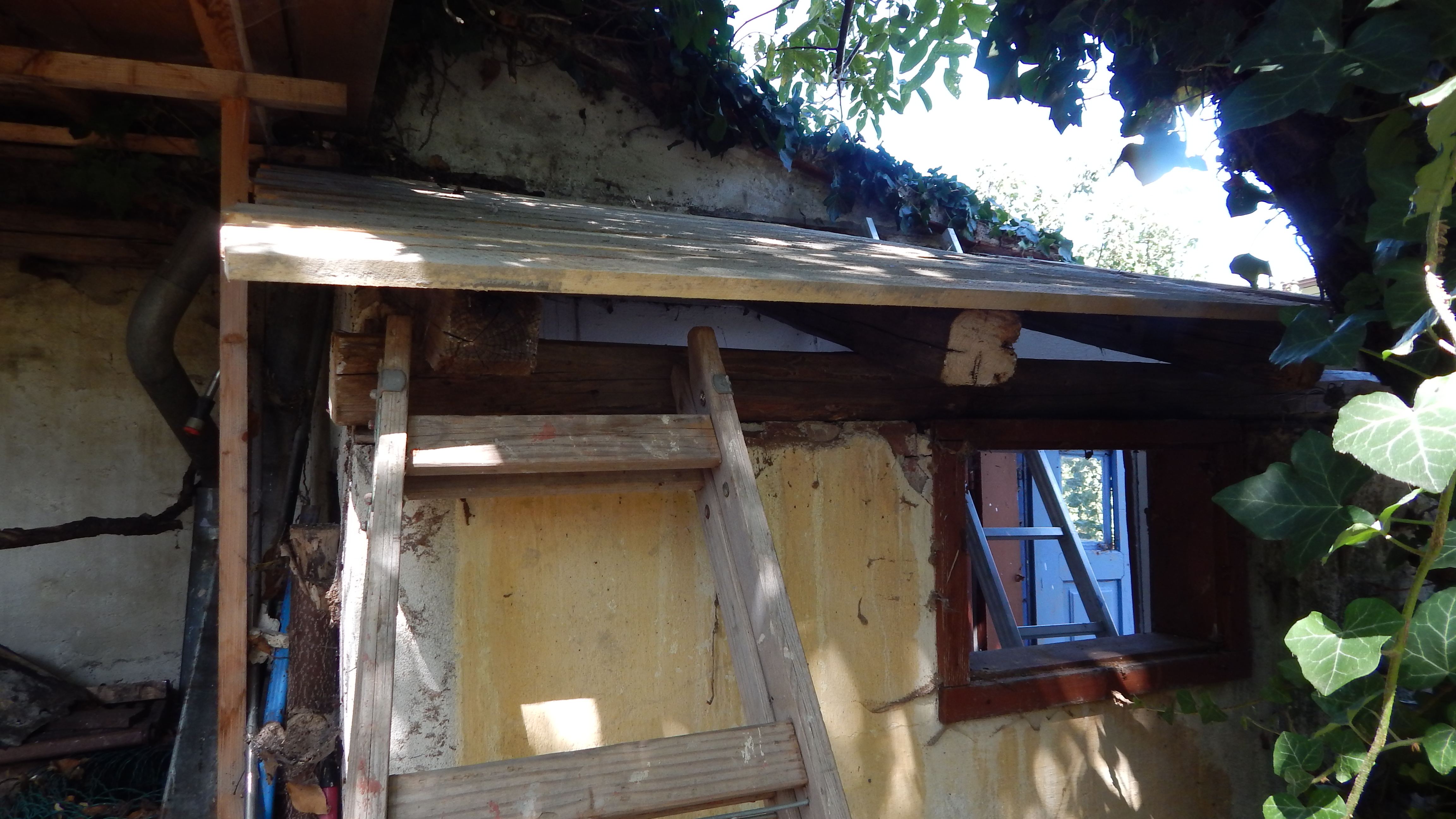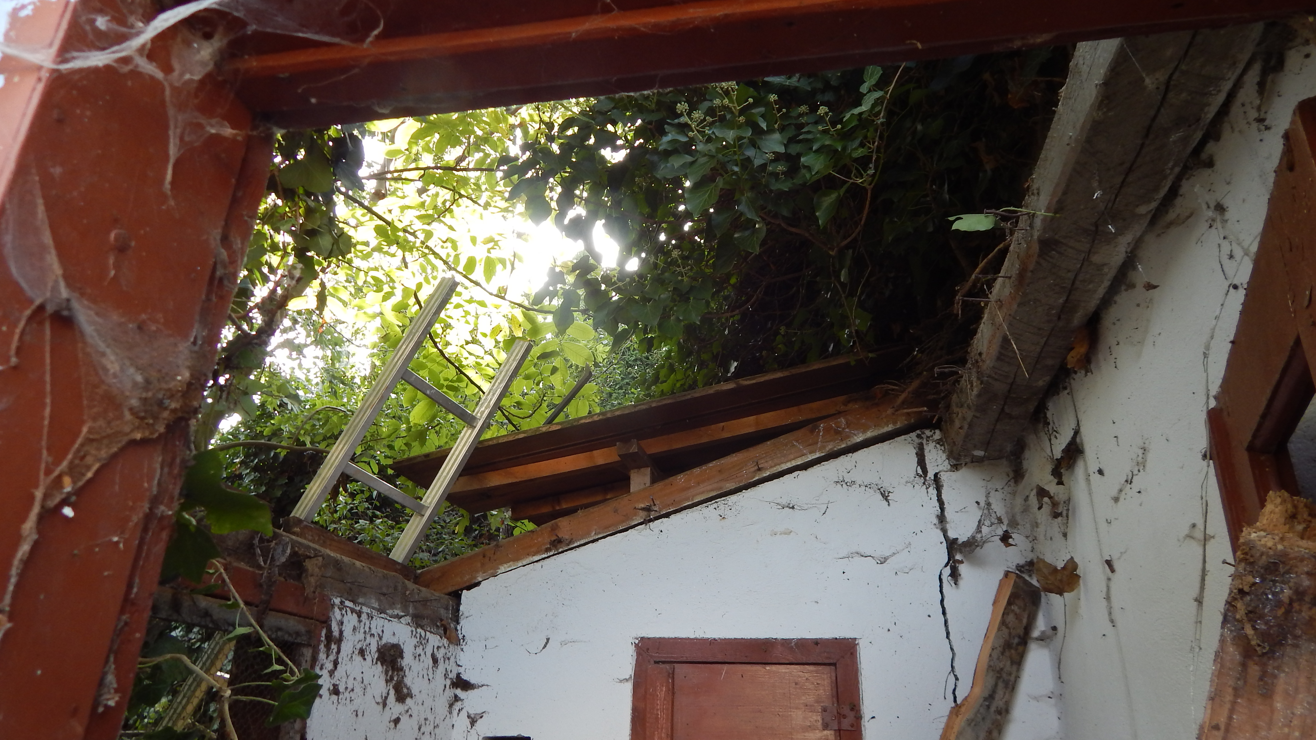 Das alte Dach musste erstmal runter. Da das Dach komplett mit Efeu zugewachsen war, habe ich zuerst die Pflanze entfernt. Letzlich ist da nichts geblieben außer einem Balken direkt am Haus, der noch verwendbar war. Der Rest war eine Mischung aus vermorschtem Holz, stückchenweise runtergezupfter alter Dachpappe und kaputten Eternitplatten.