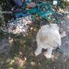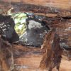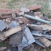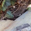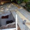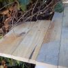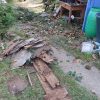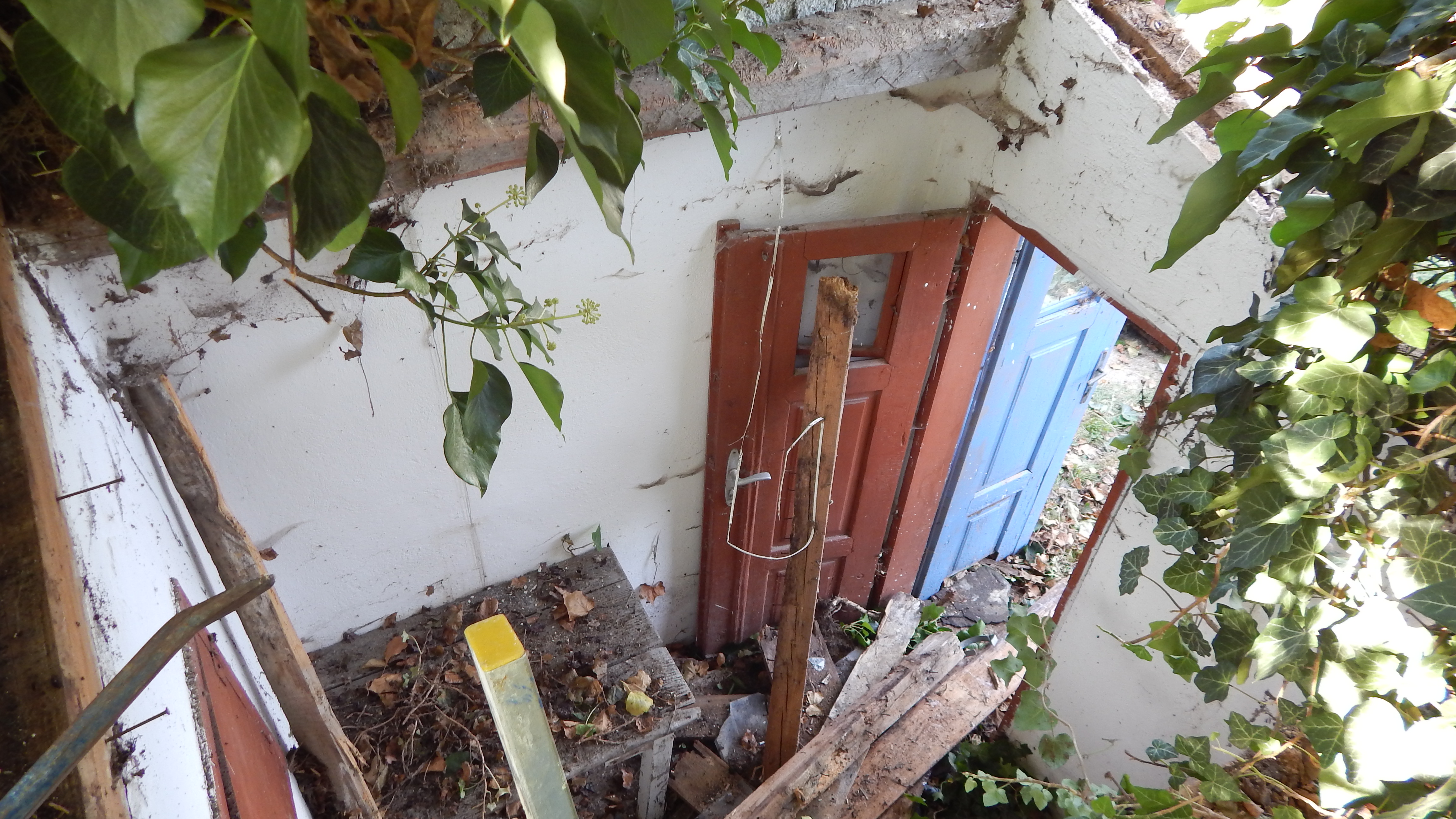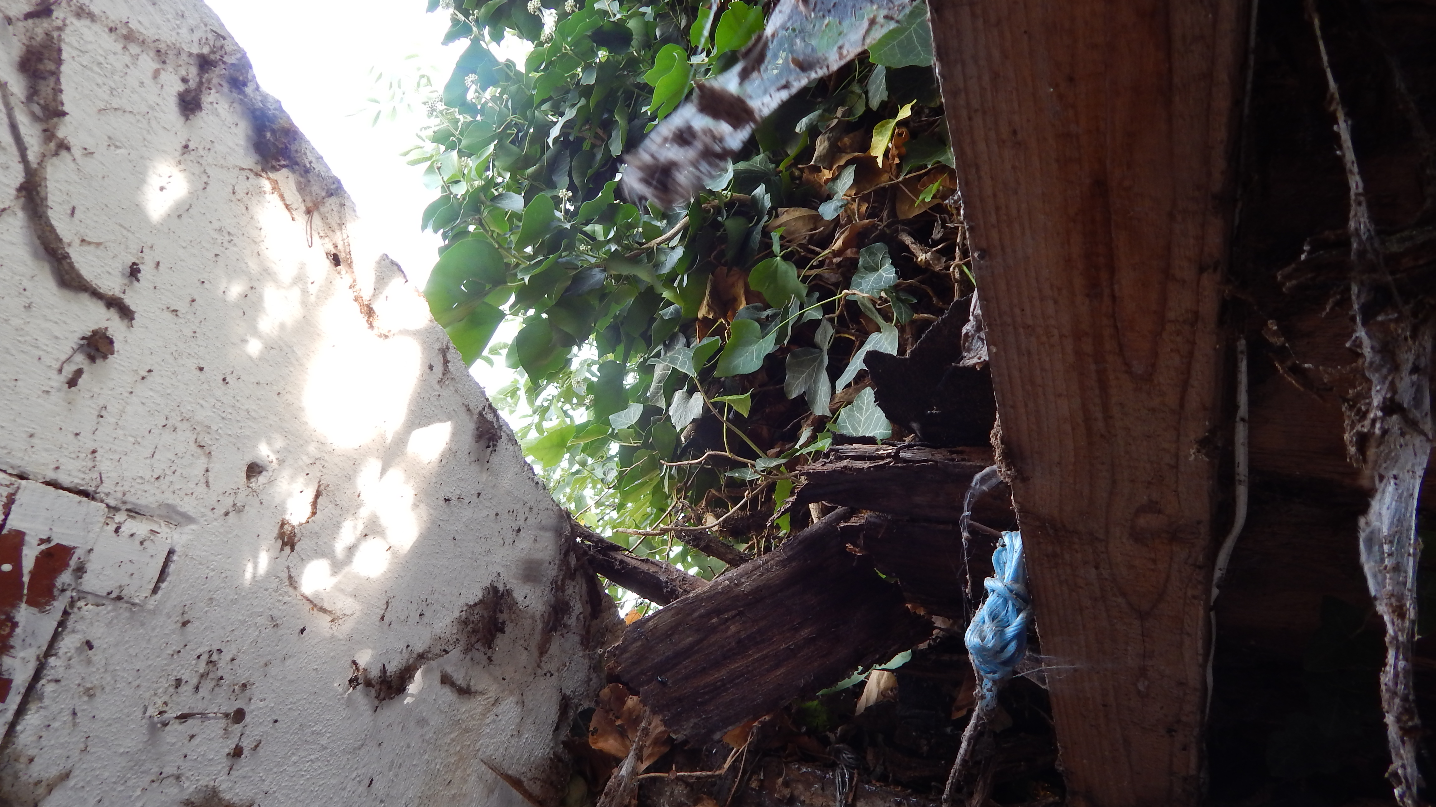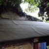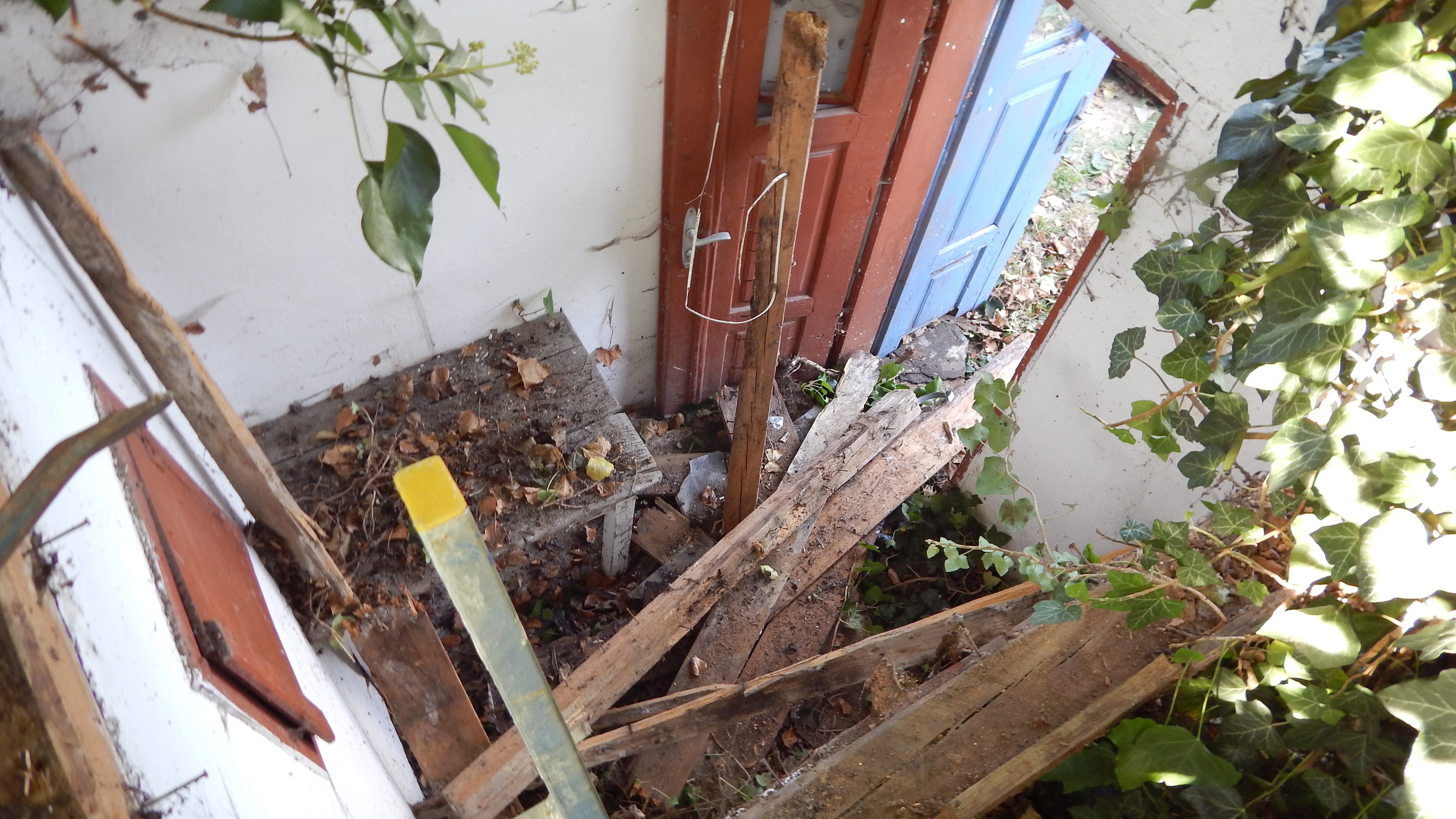 Das alte Dach musste erstmal runter. Da das Dach komplett mit Efeu zugewachsen war, habe ich zuerst die Pflanze entfernt. Letzlich ist da nichts geblieben außer einem Balken direkt am Haus, der noch verwendbar war. Der Rest war eine Mischung aus vermorschtem Holz, stückchenweise runtergezupfter alter Dachpappe und kaputten Eternitplatten.