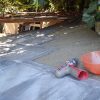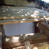 Zuerst wurden die tragenden Tram erneuert. Im nächsten Schritt wurden quer über die neuen Tram lückenlos Bretter geschraubt. Lediglich die Stelle um den Baum, der schräg zur Werkezeughütte steht, erwies sich als etwas problematisch (aber nicht unmöglich). Auf die Bretter habe ich dann Dachpappe genagelt. Und auf die Dachpappe kamen die Etnernitplatten. Ich habe von unten angefangen, die Platten anzunageln. Da ich mir nicht sicher war, wie Eternit gelegt wird, habe ich einfach beim Gartenhaus des Nachbarn abgeschaut, das einige Meter weiter stand, bei uns sind solche Dächer einfach noch üblich. Eternit zu sägen, ist kein Vergnügen, das staubt wie Hölle und wenn die Säge zu grob ist, kann das Eternit dabei auch brechen.
