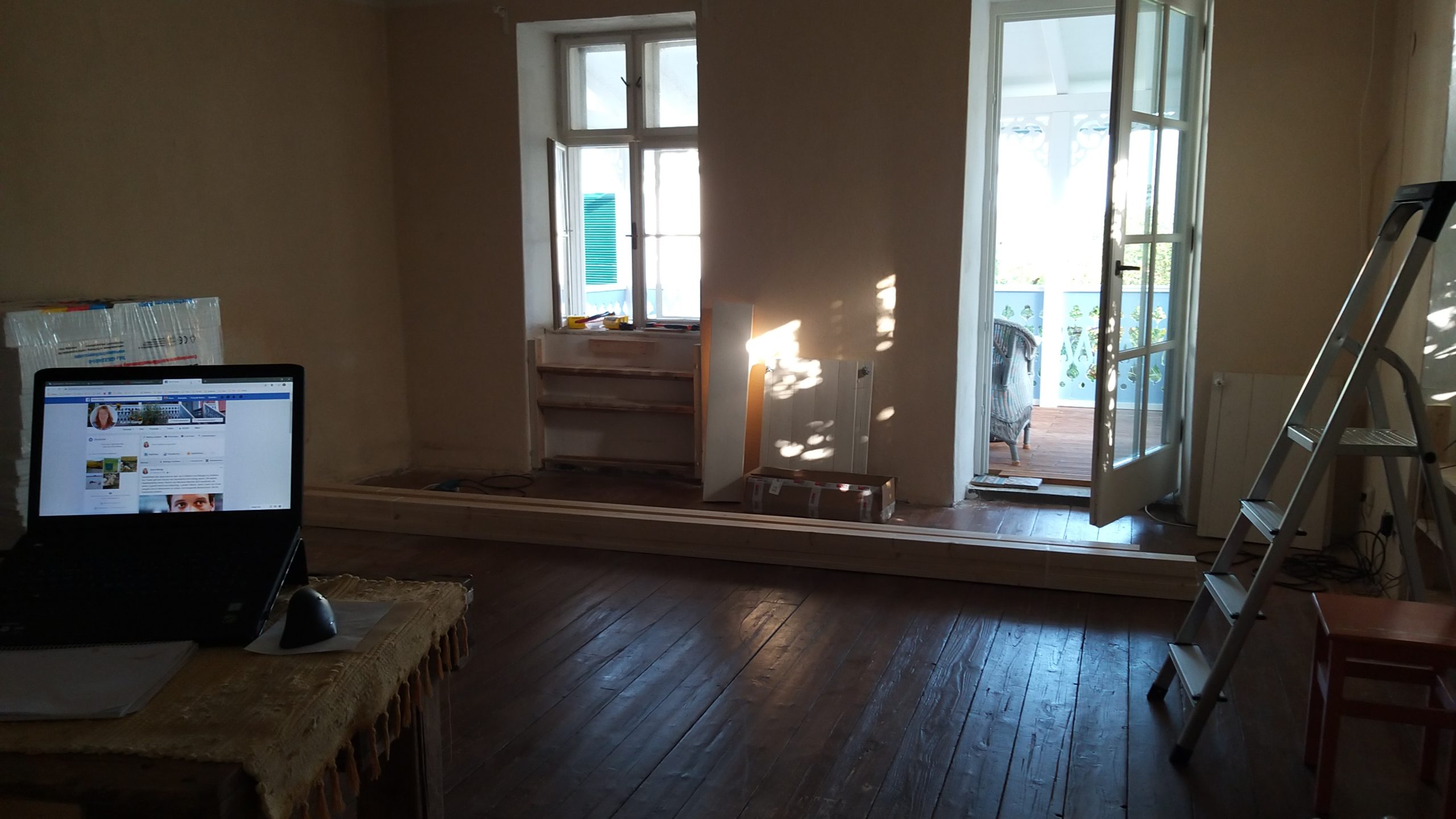 Der Dielenboden im Wohnzimmer war zumindest 60-70 Jahre alt, wenn nicht älter. Dielen waren sehr stark verwittert, teilweise tief gefurcht und zwischen den Dielen hatten sich Spalte gebildet. In einigen Dielen war auch einmal ein Holzwurm drin, den habe ich aber vor Jahren behandelt. Der Boden war insgesamt eher uneben. Der Untergrund ist ein klassischer Schüttboden, so wie man es früher gemacht hat. Das Ziel bei der Erneuerung war, den Boden gut gegen den direkt darunter befindlichen Keller zu dämmen. Insgesamt sollte der Boden auf das Niveau der Veranda gebracht werden, die im Jahr zuvor fertig gestellt worden war. Dort ist auch nachzulesen, wie beim Verandabau bereits auf die Erneuerung des Bodes abgestellt wurde.