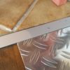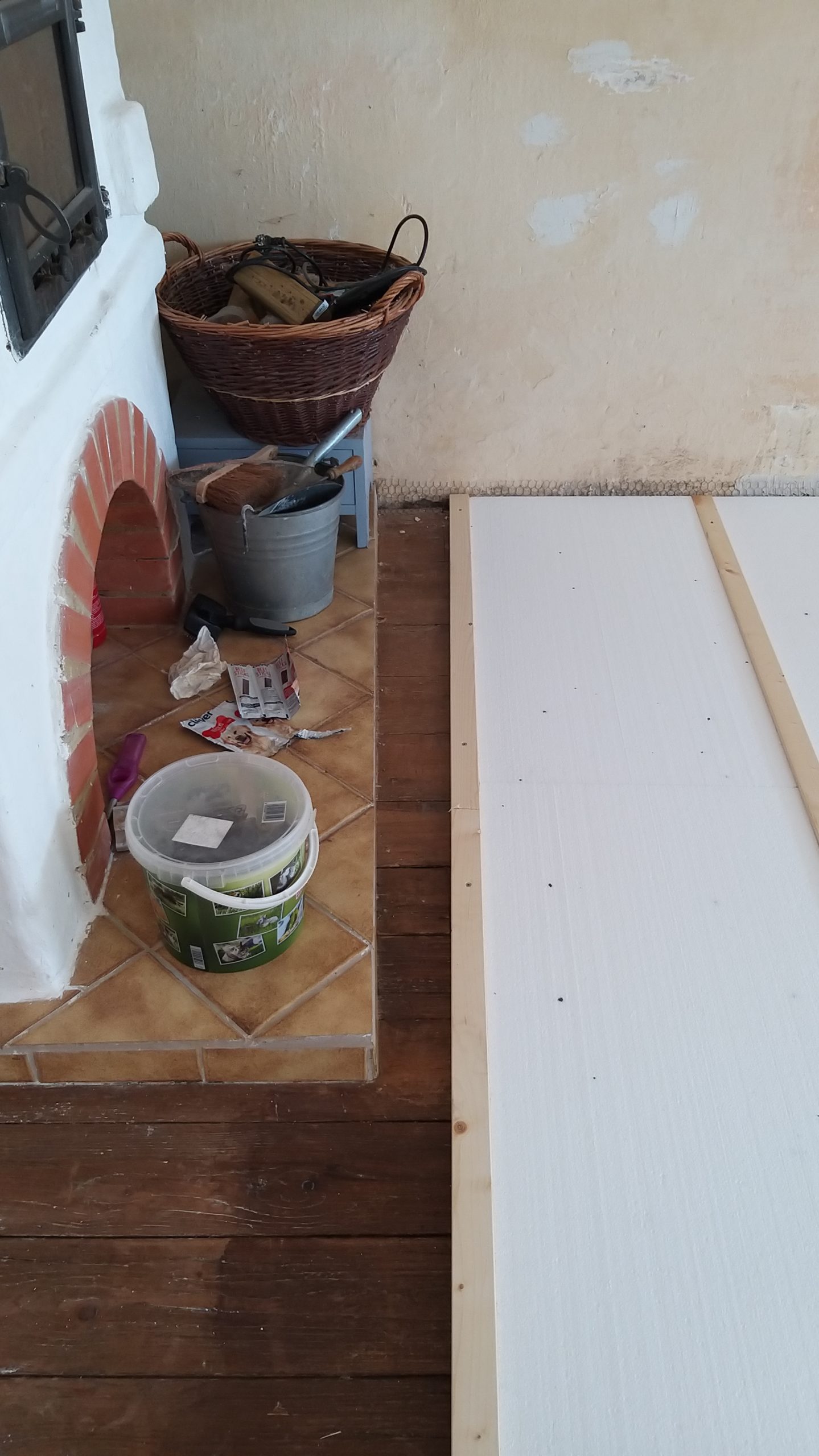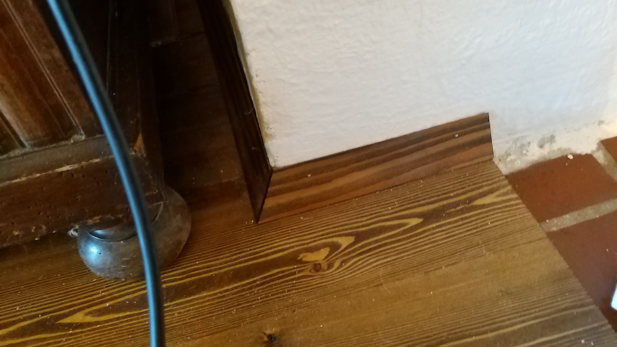An die Wände wurden Leisten verlegt, diese wurden davor ebenfalls geölt. Die Leisten müssen auf Gehrung zugeschnitten worden. Ich habe Dreiecksleisten verwendet, die eine kleine Tücke aufwiesen: Eine Leiste kann entweder etwas steiler direkt an der Wand aufgelegt werden ODER mit der flachen Seite auf dem Boden. Daraus ergibt sich ein unterschiedlicher Winkel für den Gehrungsschnitt. Spätestens, wenn man den zweiten Schnitt falsch gemacht hat, sind dann die nächsten Schritte richtig. Die Wandleisten habe ich mit kleinen Nägeln befestigt. Rund um den vorhandenen Kachelofen (der auf einem Fliesensockel steht, der bereits vor Jahren höher gebaut wurde, um später mit dem neuen Boden abzuschließen) wurde mit Aluleisten verblendet, eine Platte aus Riffelblech wurde unter die Leiste geschoben und dann verschraubt. Schutzplatten aus Metall oder Glas sind vor einem Ofen vorgeschrieben und Voraussetzung für die Betriebserlaubnis. Auch die Kante am Übergang zum Cotto wurde mit einer Aluleiste verblendet.