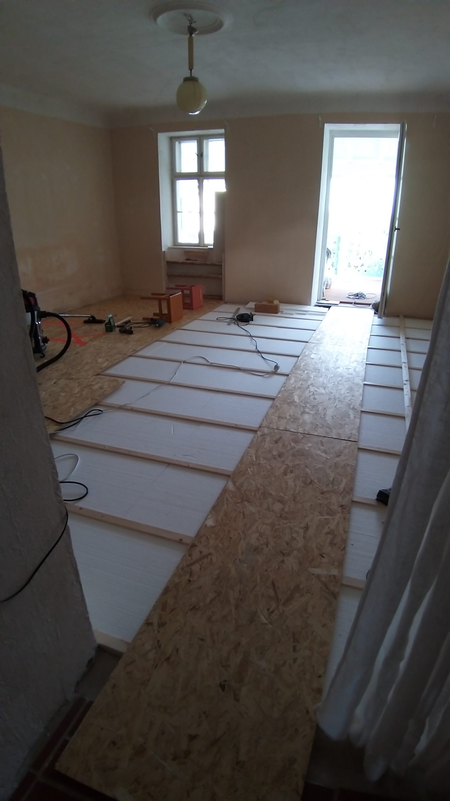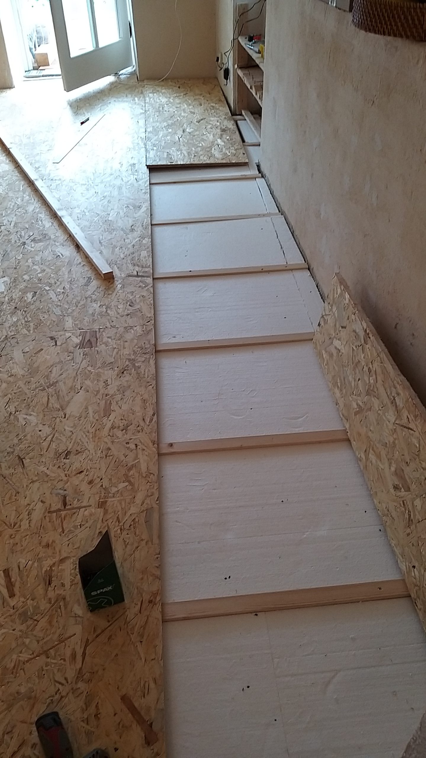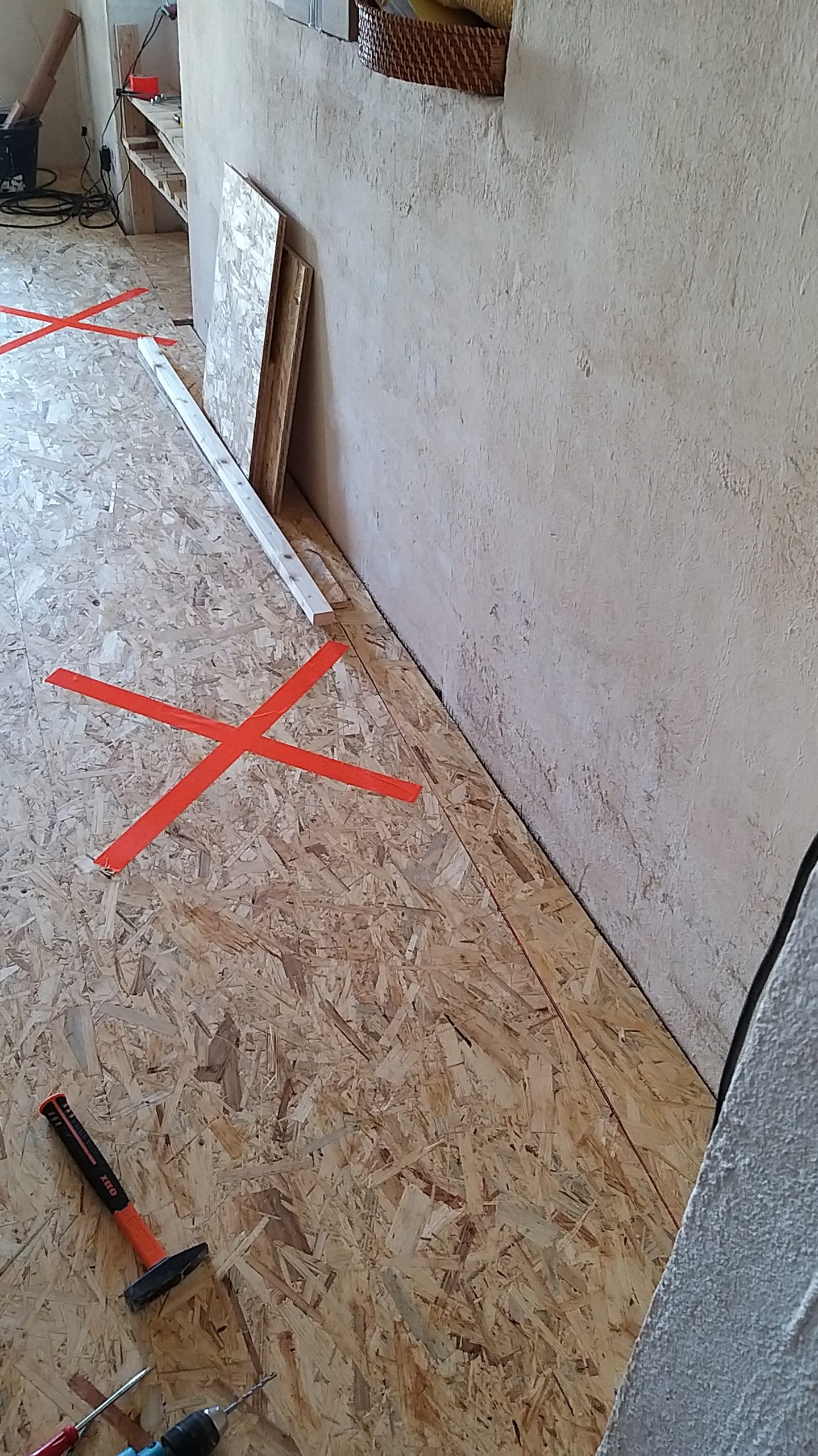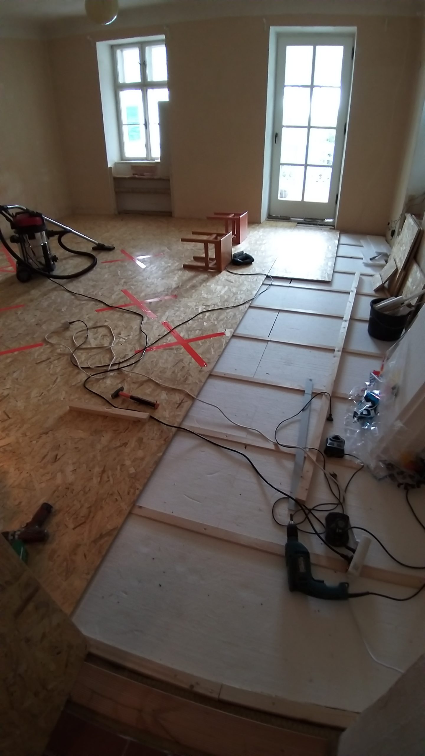 Quer zum bisherigen Boden wurden die Staffeln auf den alten Boden geschraubt, immer mit  einem Abstand zur Wand. Zwischen die einzelnen Staffeln wurden Dämmplatten direkt auf den alten Boden gelegt. Quer zu den Staffeln wurden danach die OSB-Platten verlegt und auf die Staffeln geschraubt. Dort, wo die OSB-Platten keine Unterlage fanden, weil die Nahtstelle nicht über einer Staffel lag, wurde zum Teil ein Extra-Stück Staffel auf den Boden geschraubt, um die Haltbarkeit zu verbessern. Wirklich nötig ist das nicht, denn sobald der Dielenboden auf den Platten verlegt ist, verteilt sich das Gewicht so, dass nichts mehr brechen kann. Während aber die Platten noch frei liegen, darf man auf nicht unterlegte Nahtstellen nicht treten, es besteht die Gefahr, dass sie dort brechen, deshalb habe ich diese Stellen mit Gaffaband gekennzeichnet. Da ich im selben Raum verlegt und gesägt habe, habe ich zwischendurch immer wieder die Sägespäne weggesaugt.