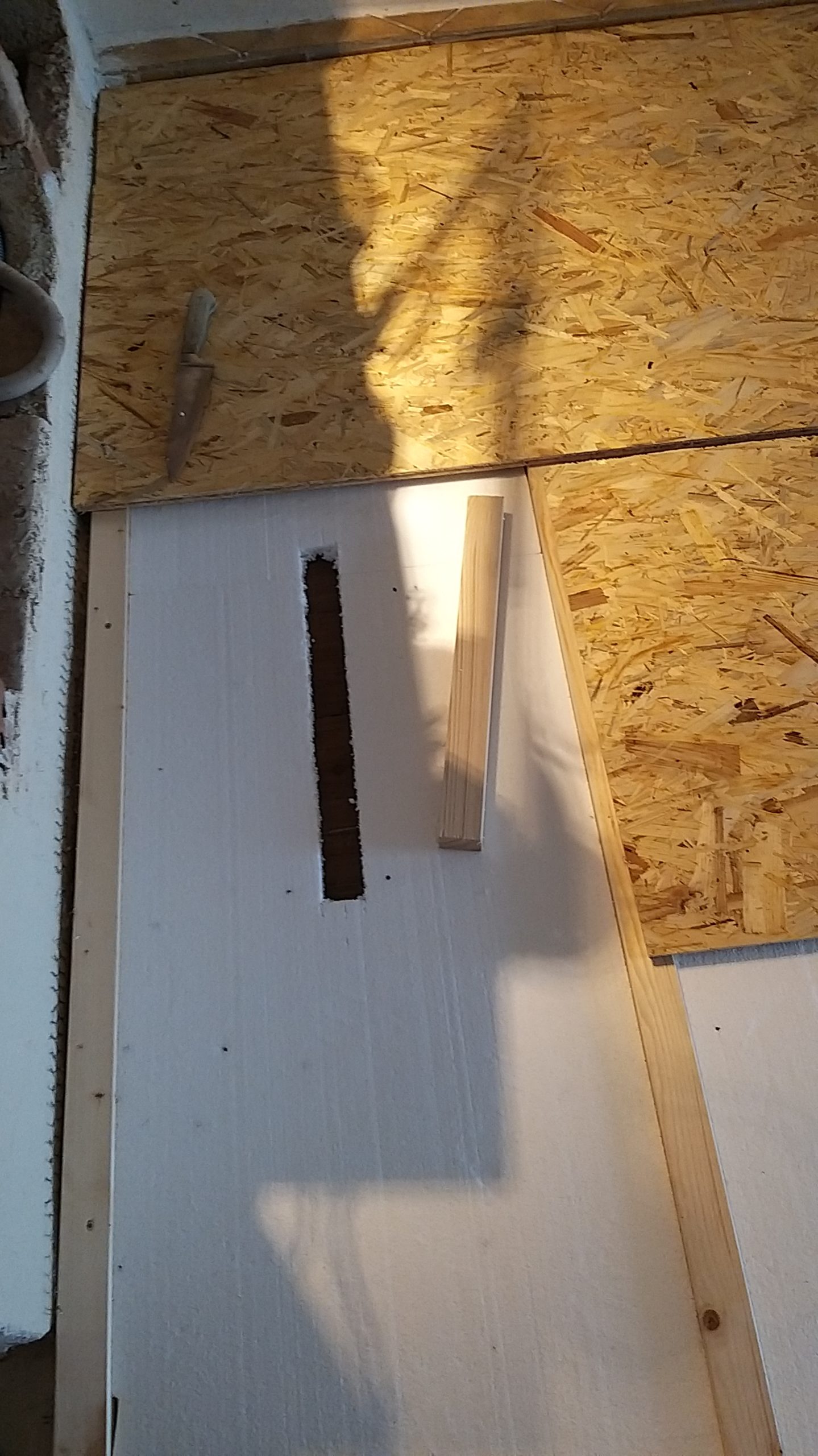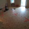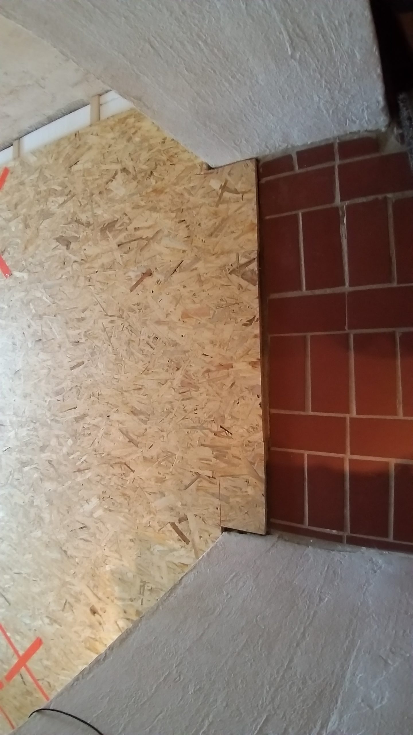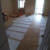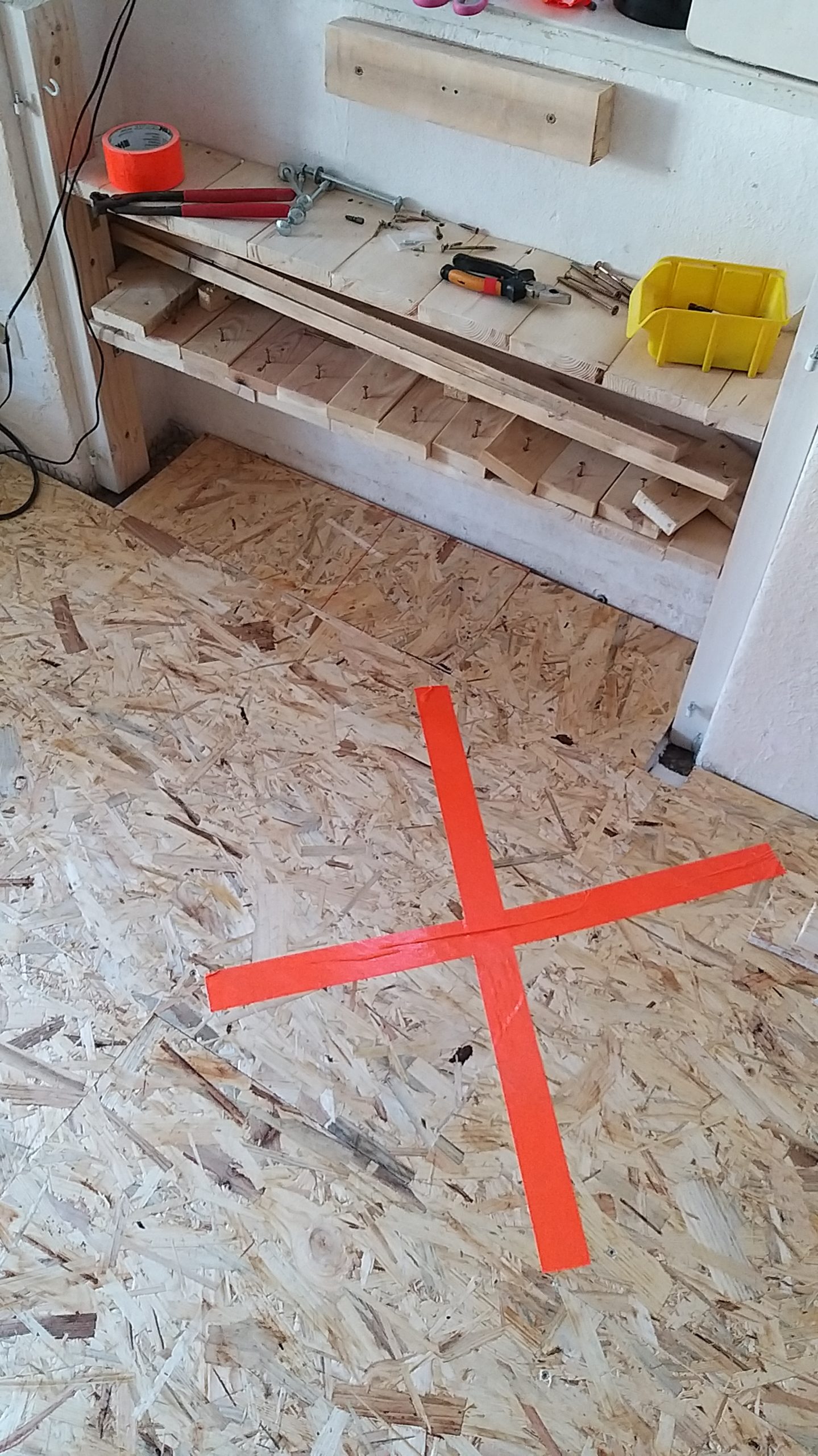 Quer zum bisherigen Boden wurden die Staffeln auf den alten Boden geschraubt, immer mit  einem Abstand zur Wand. Zwischen die einzelnen Staffeln wurden Dämmplatten direkt auf den alten Boden gelegt. Quer zu den Staffeln wurden danach die OSB-Platten verlegt und auf die Staffeln geschraubt. Dort, wo die OSB-Platten keine Unterlage fanden, weil die Nahtstelle nicht über einer Staffel lag, wurde zum Teil ein Extra-Stück Staffel auf den Boden geschraubt, um die Haltbarkeit zu verbessern. Wirklich nötig ist das nicht, denn sobald der Dielenboden auf den Platten verlegt ist, verteilt sich das Gewicht so, dass nichts mehr brechen kann. Während aber die Platten noch frei liegen, darf man auf nicht unterlegte Nahtstellen nicht treten, es besteht die Gefahr, dass sie dort brechen, deshalb habe ich diese Stellen mit Gaffaband gekennzeichnet. Da ich im selben Raum verlegt und gesägt habe, habe ich zwischendurch immer wieder die Sägespäne weggesaugt.