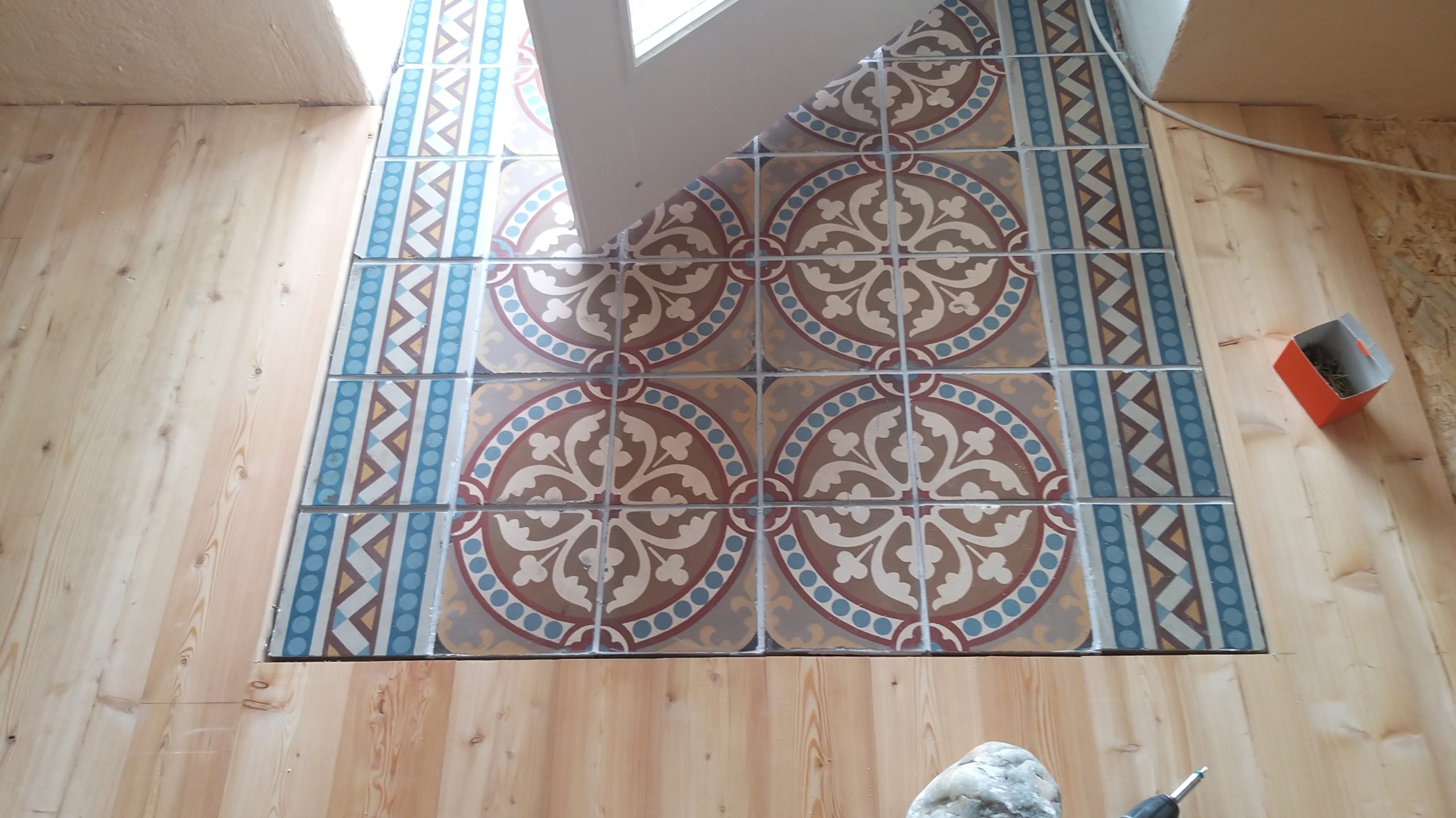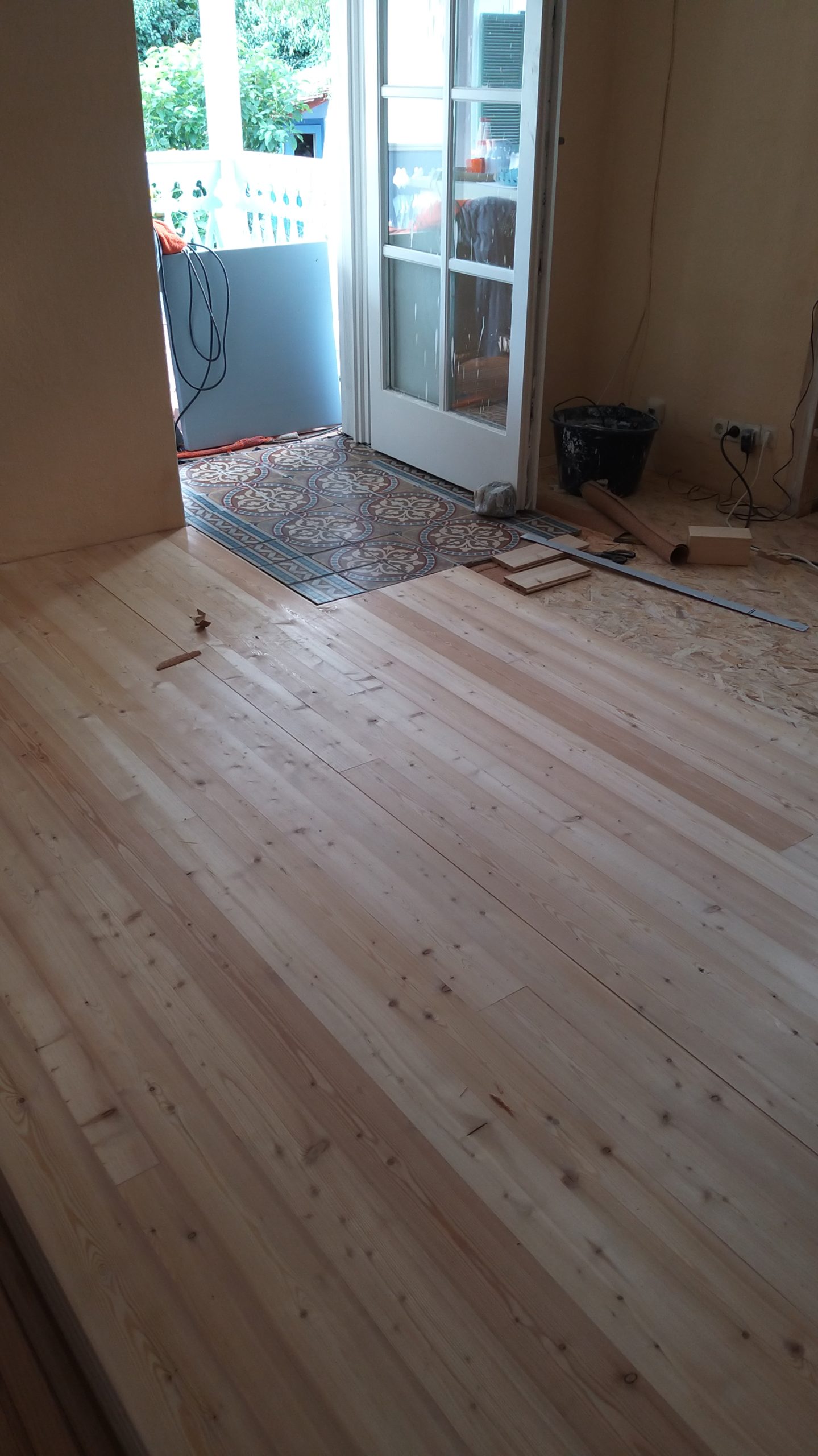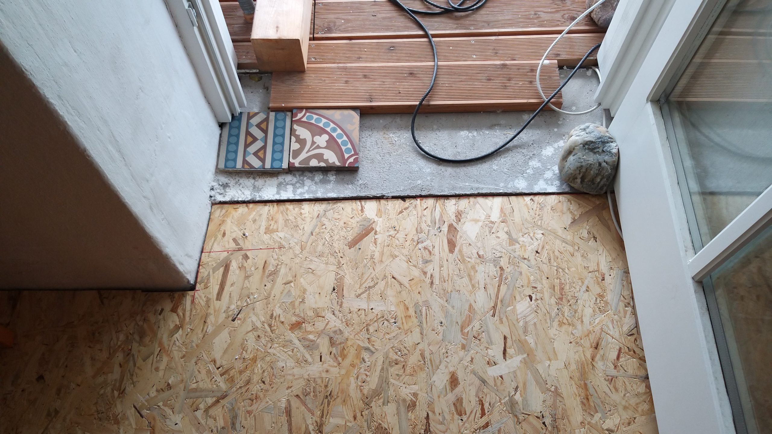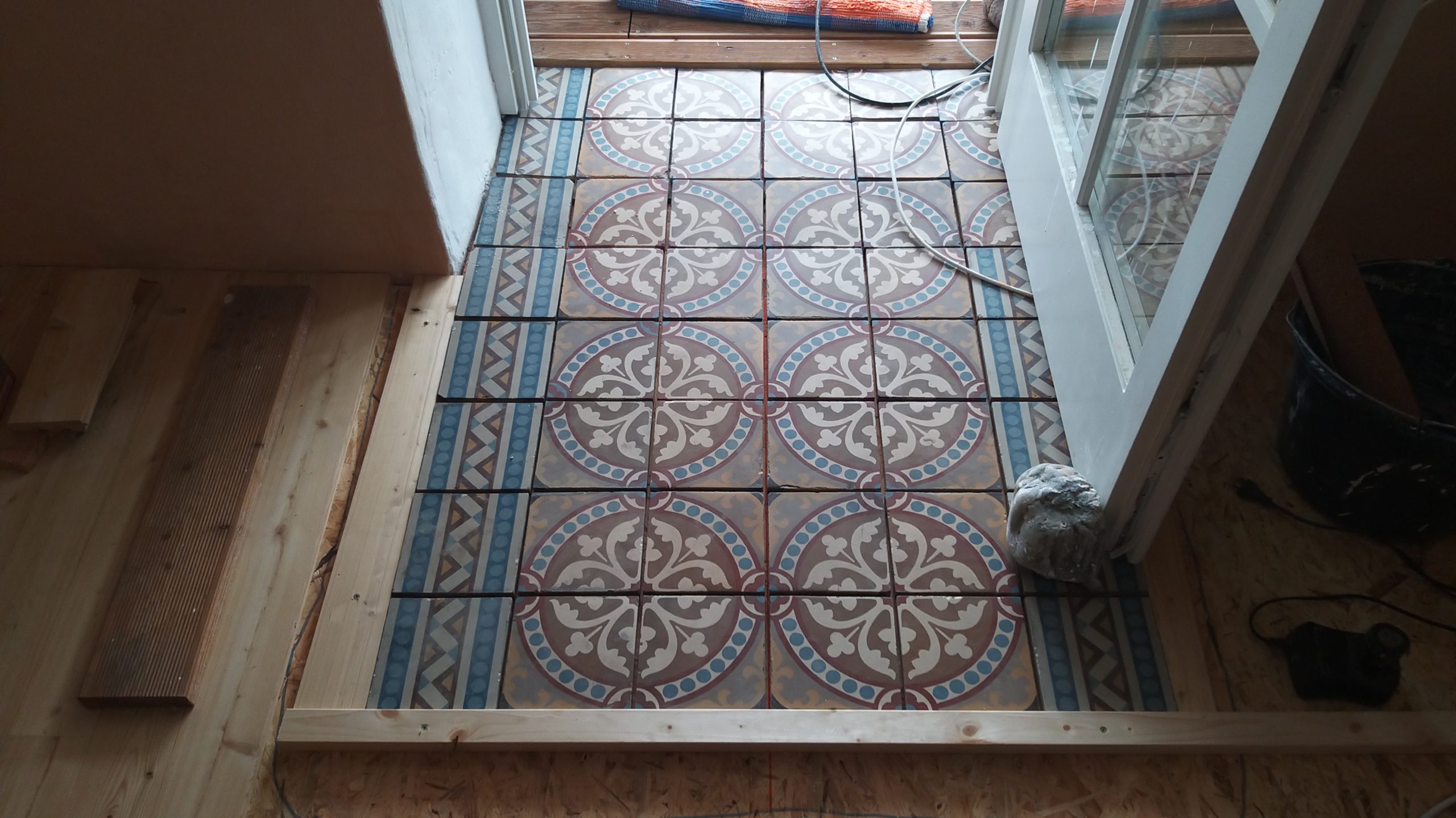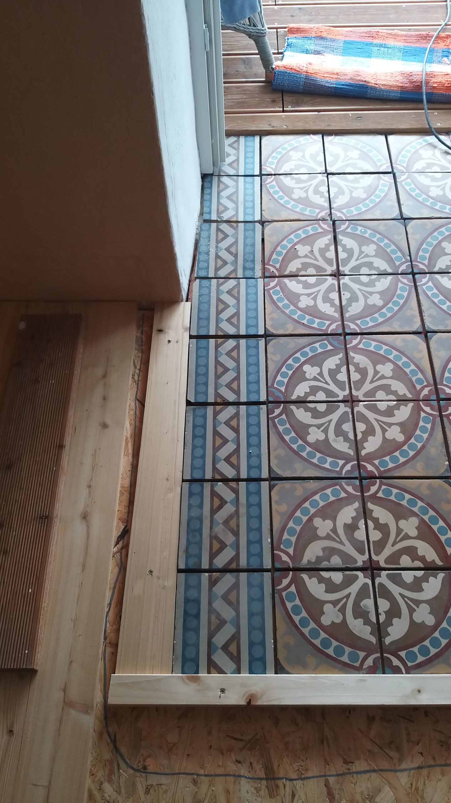 An der Stelle zur Tür sollte ein Stück mit alten Zementfliesen verlegt werden als Übergang zur Veranda. Die Fliesen mussten erst an der Unterseite und an den Rändern von alter Fugenmasse und altem Kleber befreit werden. Das staubt ziemlich. Damit man die Fliesen direkt auf die OSB-Platte verlegen kann, muss grundiert werden. Die Fliesen habe ich zunächst aufgelegt, dann wurden die Randstücke mit Diamantscheibe und Winkelschleifer passend zugeschnitten. Damit der Fliesenkleber und später die Fugenmasse nicht auslaufen, habe ich rund um die künftigen Fliesen einfach Leisten direkt auf die OSB-Platten geschraubt. Danach Fliesenkleber anrühren und die Fliesen eindrücken und ausrichten. Die äußeren Fliesen werden dabei direkt an das Richtholz gelegt. Mit der Fugenmasse lassen sich auch leichte Differenzen im Boden ausgleichen. Am nächsten Tag habe ich dann verfugt. Für Zementfliesen muss man doppelt so viel Fugenmasse wie für normale Fliesen rechnen, weil sie rund 2 cm stark sind. Wichtig beim Verfugen: Sofort sauber nachwischen. Die Fugenmasse habe ich einen vollen Tag antrocknen lassen, dann konnten die Richthölzer entfernt werden. Die Korkunterlage, die auf den Fotos zu sehen ist, habe ich dafür verwendet, rund um die Fliesen die Höhe der Dielen exakt an die Höhe der Fliesen anzugleichen.