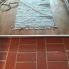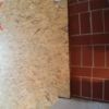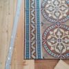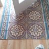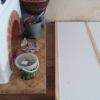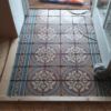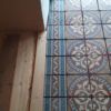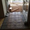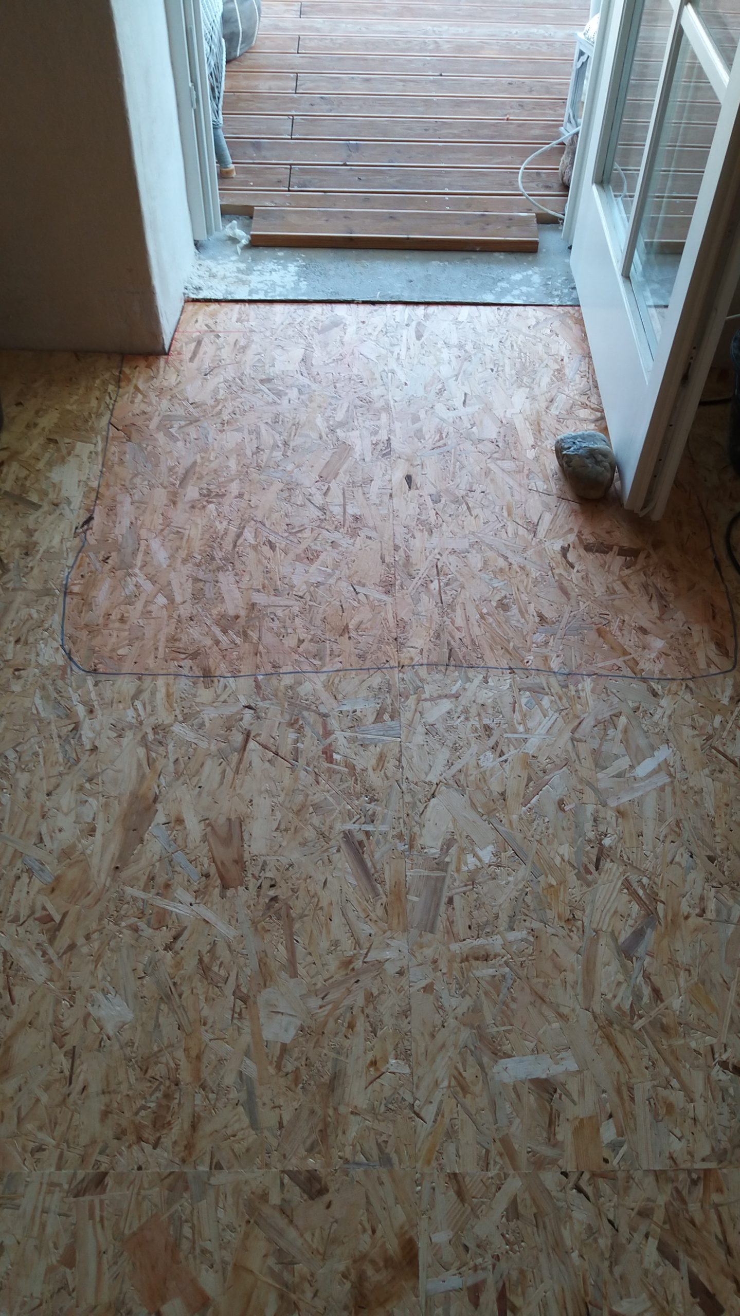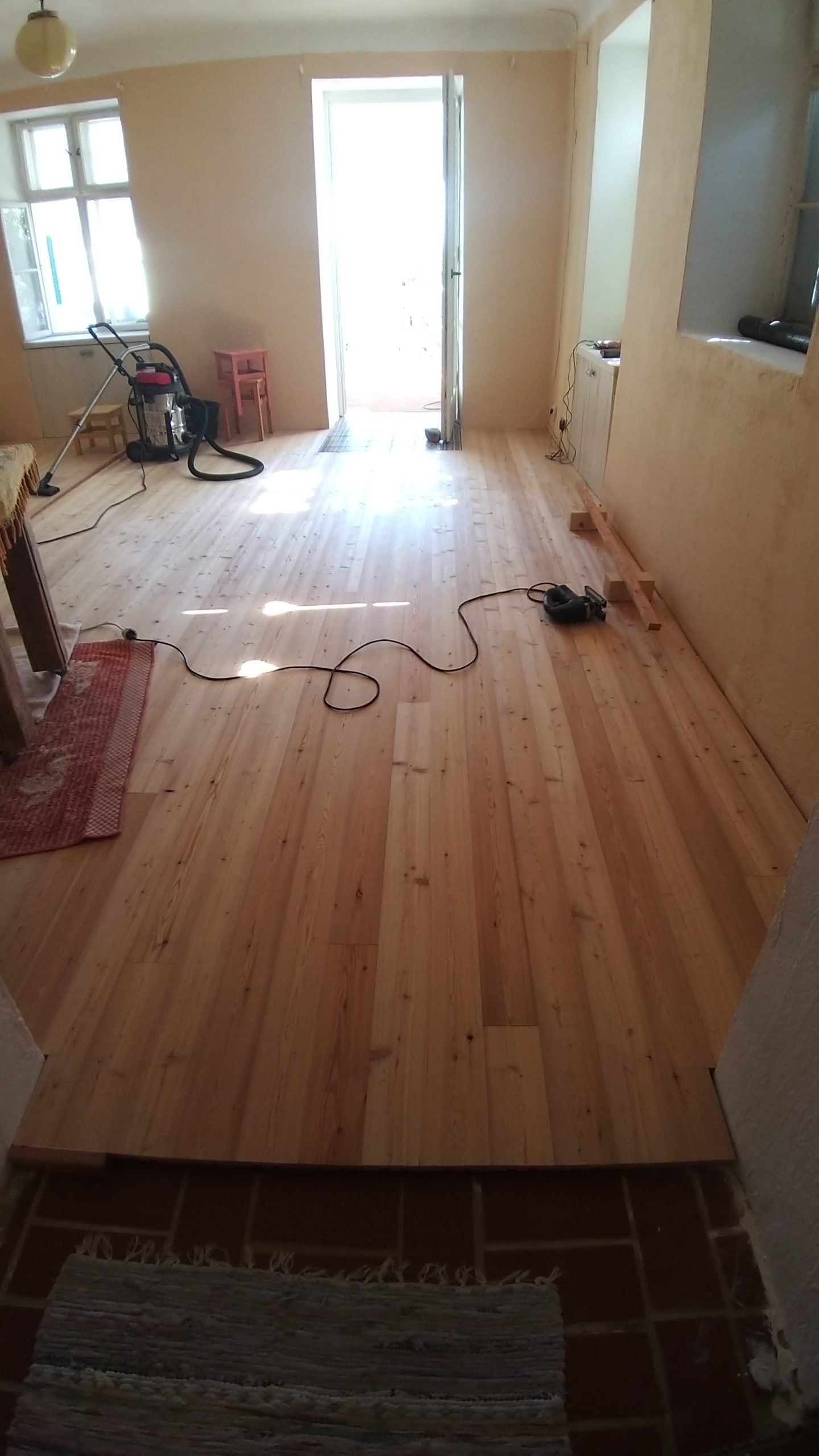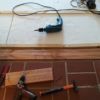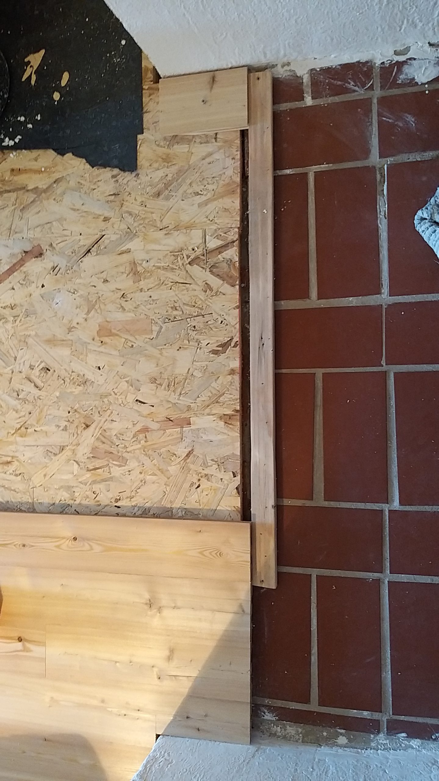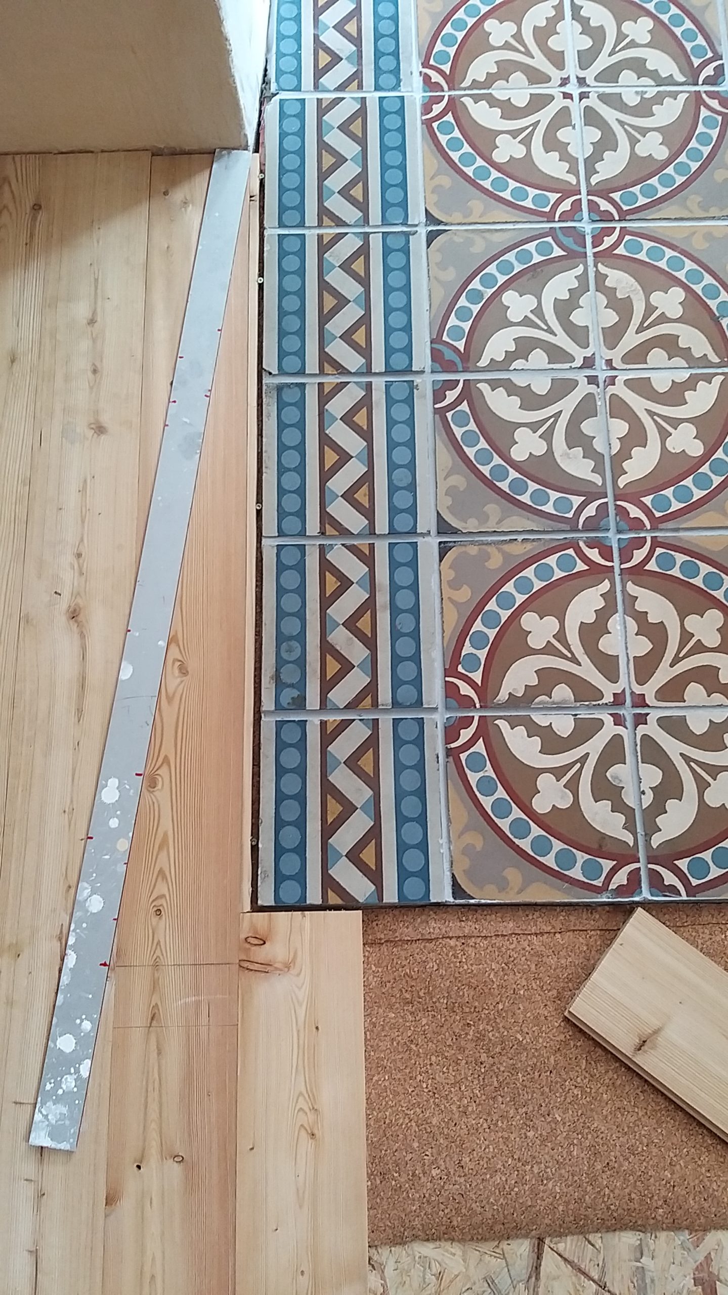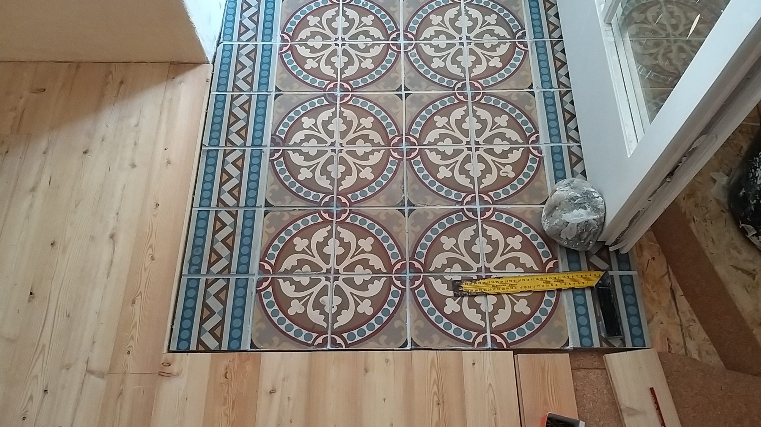 An der Stelle zur Tür sollte ein Stück mit alten Zementfliesen verlegt werden als Übergang zur Veranda. Die Fliesen mussten erst an der Unterseite und an den Rändern von alter Fugenmasse und altem Kleber befreit werden. Das staubt ziemlich. Damit man die Fliesen direkt auf die OSB-Platte verlegen kann, muss grundiert werden. Die Fliesen habe ich zunächst aufgelegt, dann wurden die Randstücke mit Diamantscheibe und Winkelschleifer passend zugeschnitten. Damit der Fliesenkleber und später die Fugenmasse nicht auslaufen, habe ich rund um die künftigen Fliesen einfach Leisten direkt auf die OSB-Platten geschraubt. Danach Fliesenkleber anrühren und die Fliesen eindrücken und ausrichten. Die äußeren Fliesen werden dabei direkt an das Richtholz gelegt. Mit der Fugenmasse lassen sich auch leichte Differenzen im Boden ausgleichen. Am nächsten Tag habe ich dann verfugt. Für Zementfliesen muss man doppelt so viel Fugenmasse wie für normale Fliesen rechnen, weil sie rund 2 cm stark sind. Wichtig beim Verfugen: Sofort sauber nachwischen. Die Fugenmasse habe ich einen vollen Tag antrocknen lassen, dann konnten die Richthölzer entfernt werden. Die Korkunterlage, die auf den Fotos zu sehen ist, habe ich dafür verwendet, rund um die Fliesen die Höhe der Dielen exakt an die Höhe der Fliesen anzugleichen.