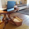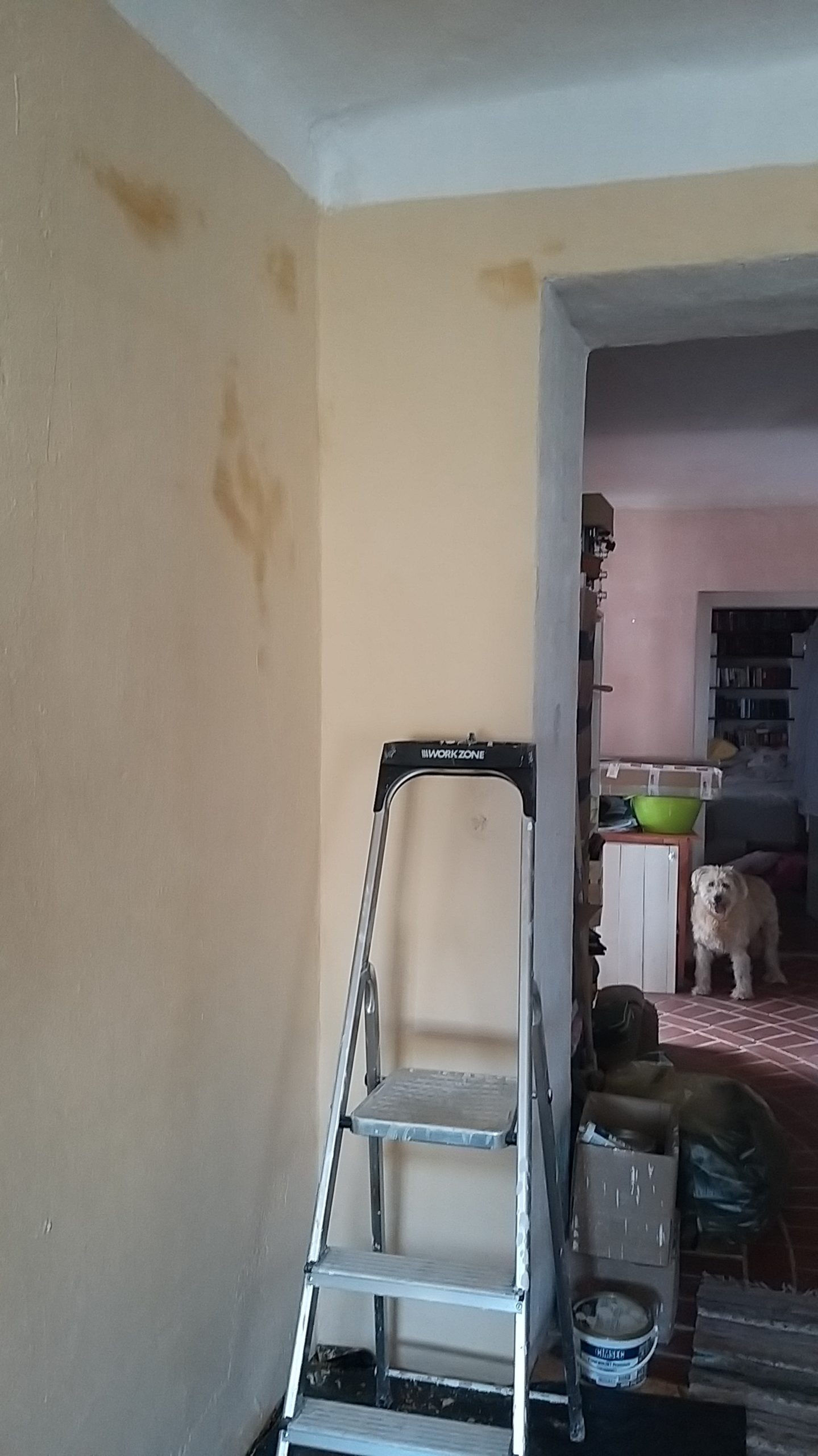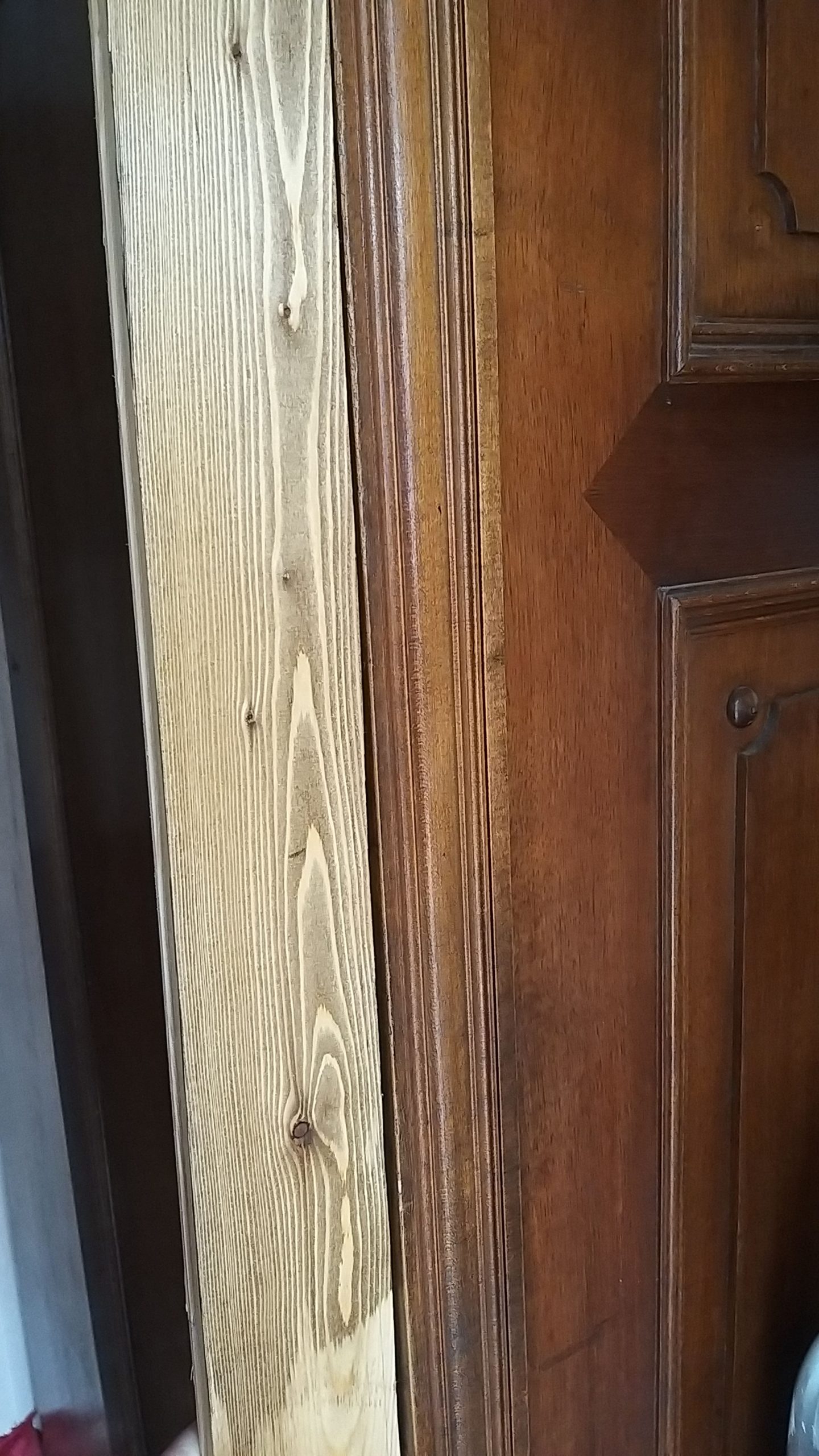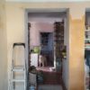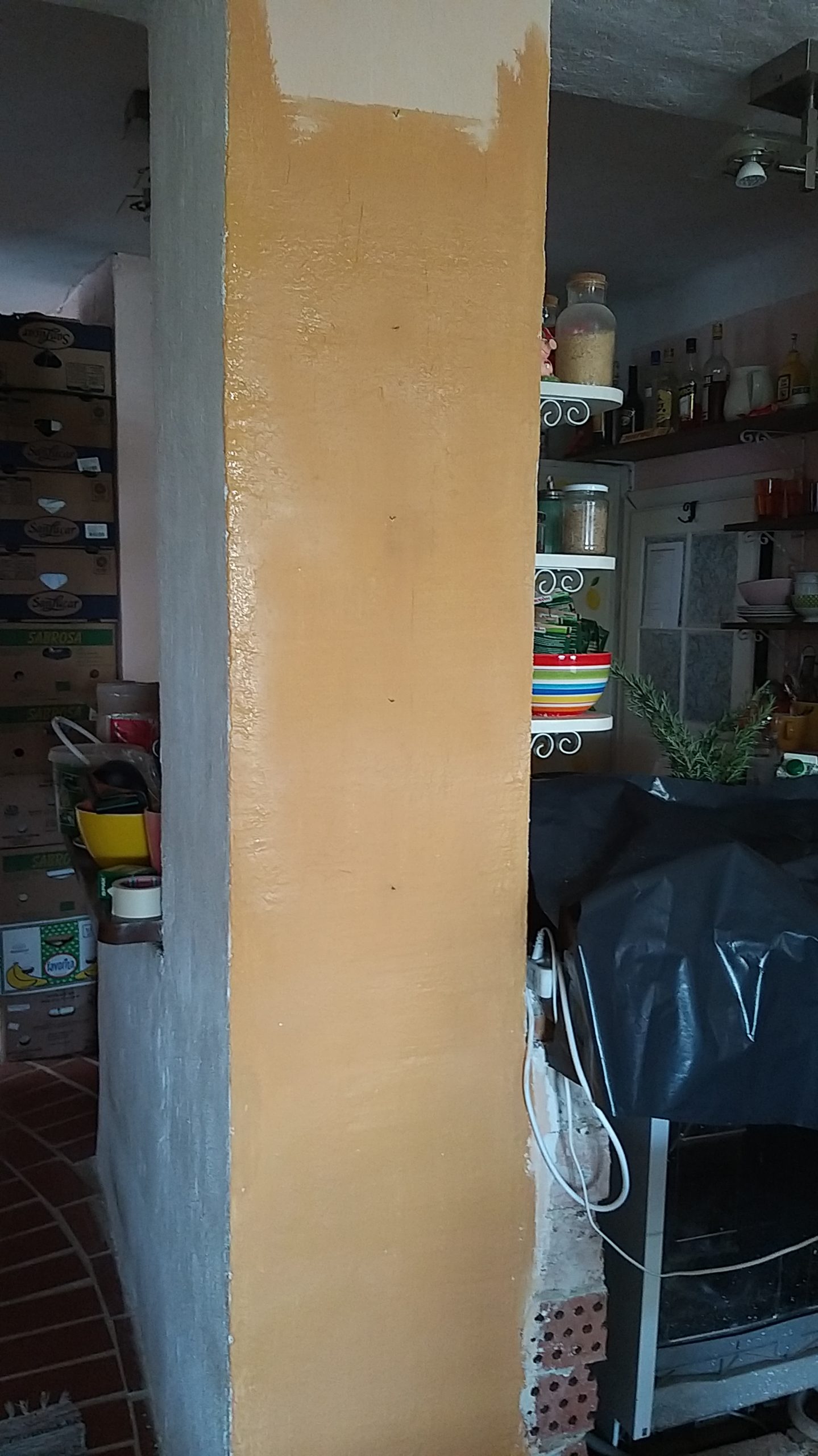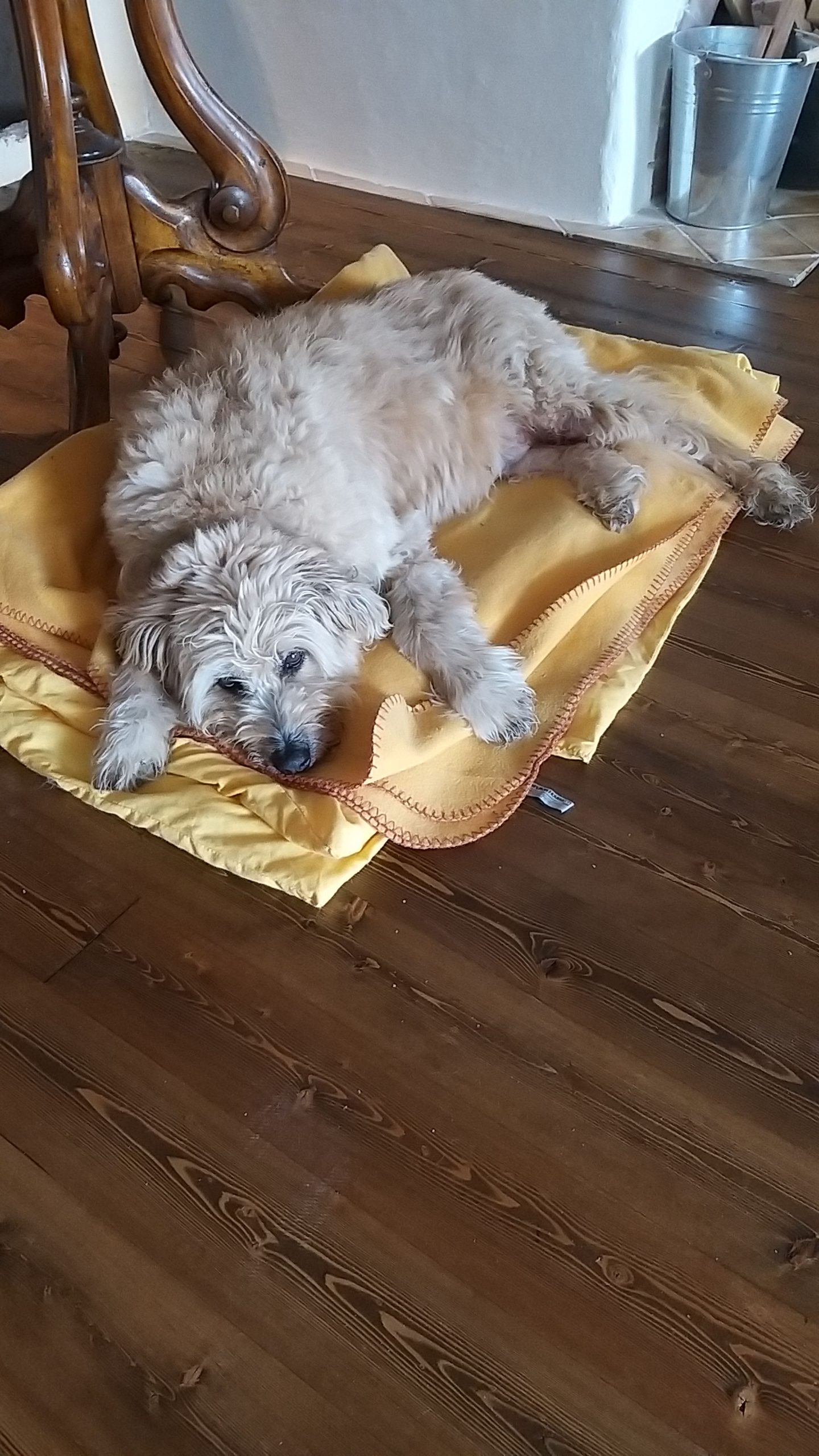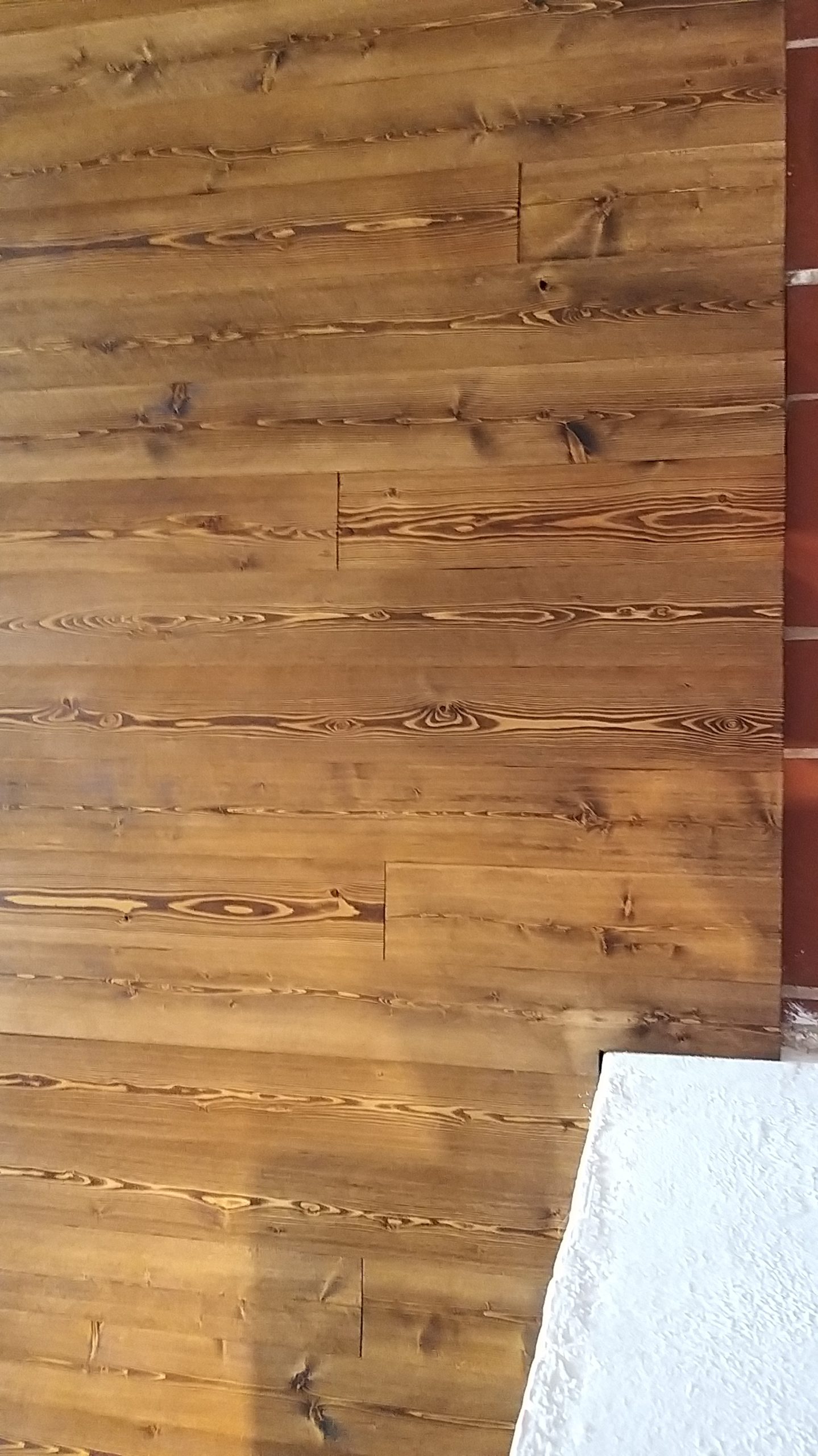 Zwischendurch wurden die Wände neu gekalkt. Für den Holzwagen habe ich neue, spezielle Gummiräder erstanden, die für hochempfindliche Böden geeignet sind. Der Vollständiger halber erwähne ich noch, dass ich auch die Verkleidung der Küche, die zum Wohnzimmer zeigt, mit den Lärchendielen verblendet habe. Diese Bretter wurden nicht geölt, sie sollen später noch weiß lackiert werden.