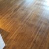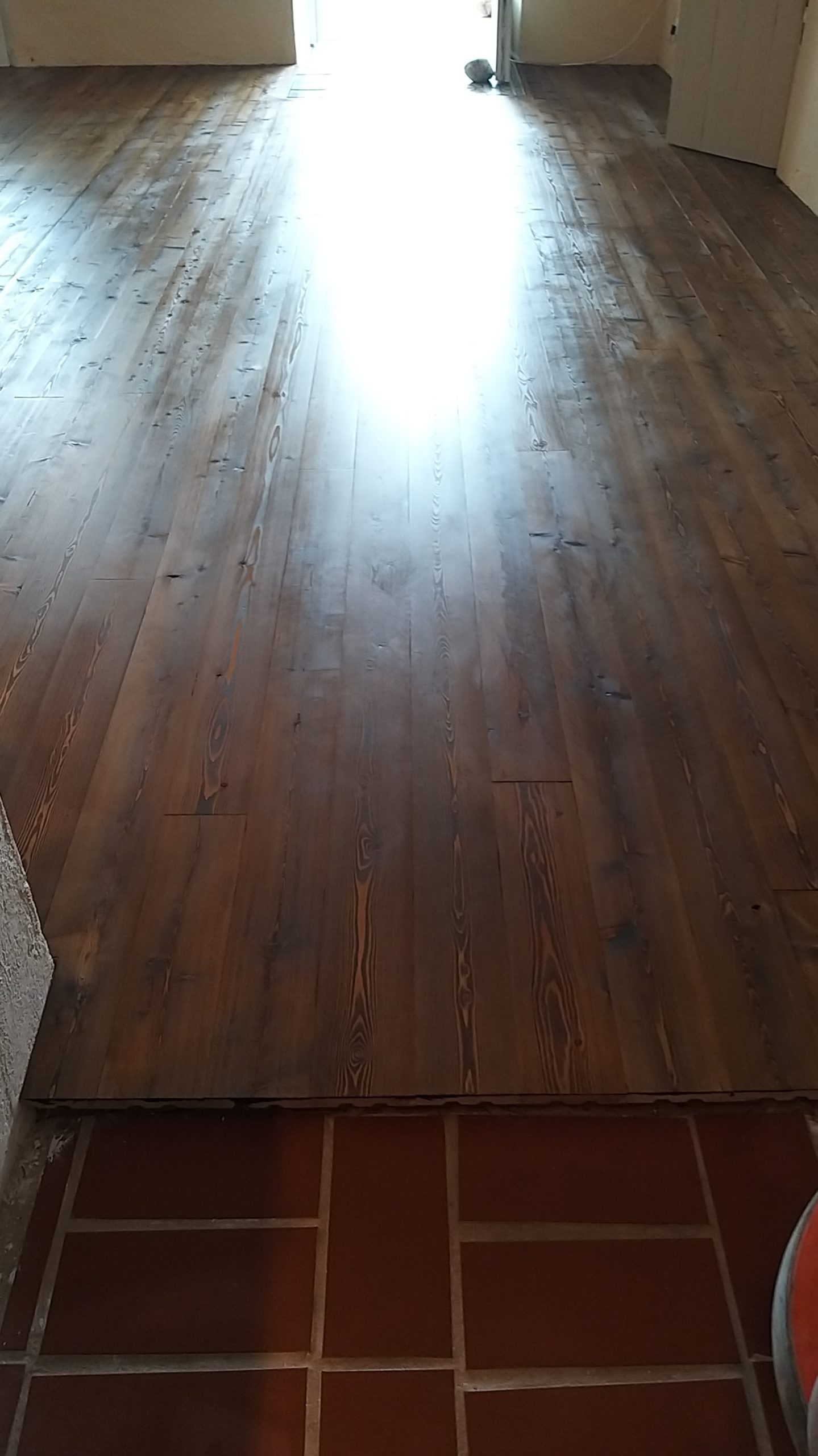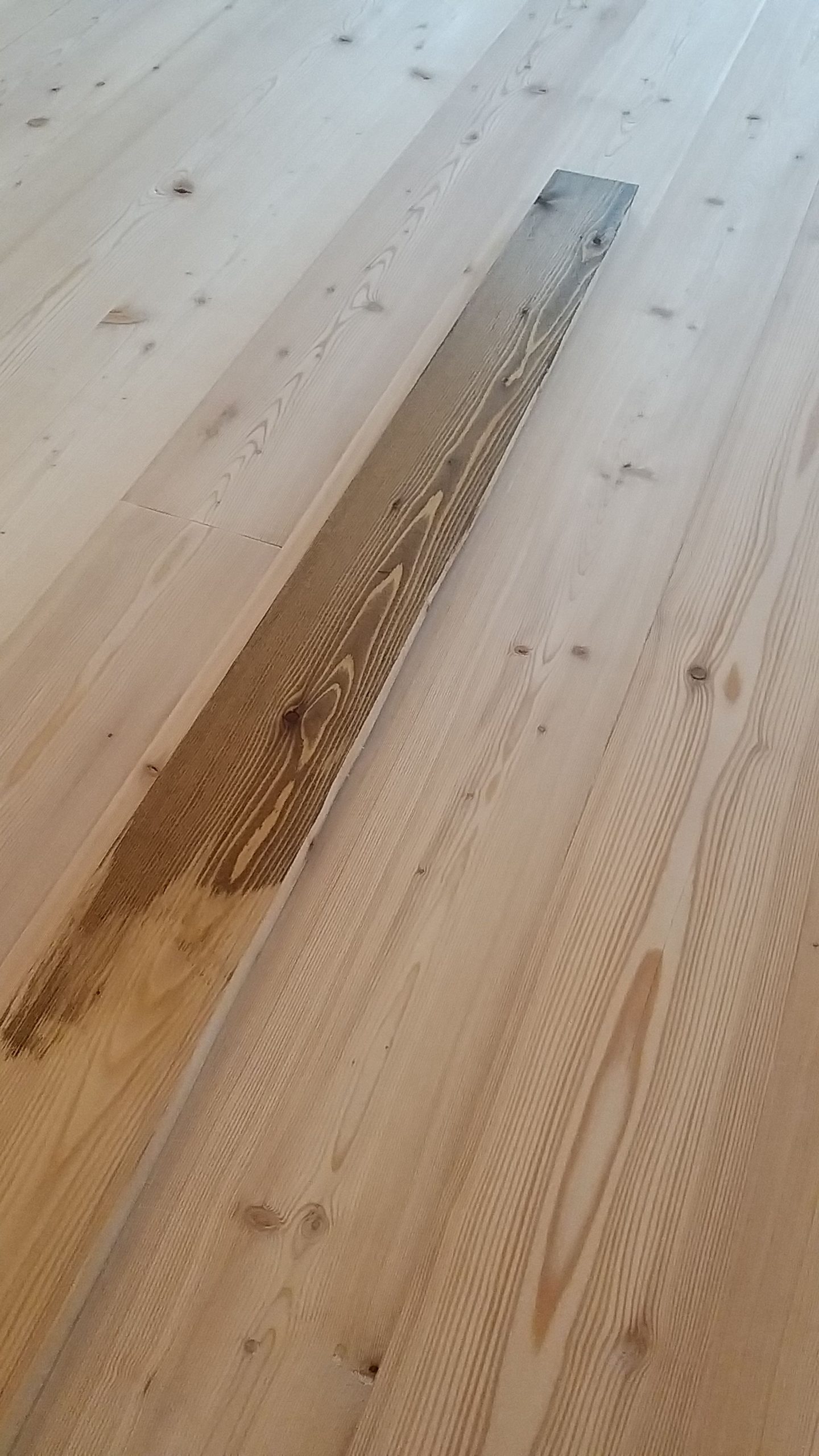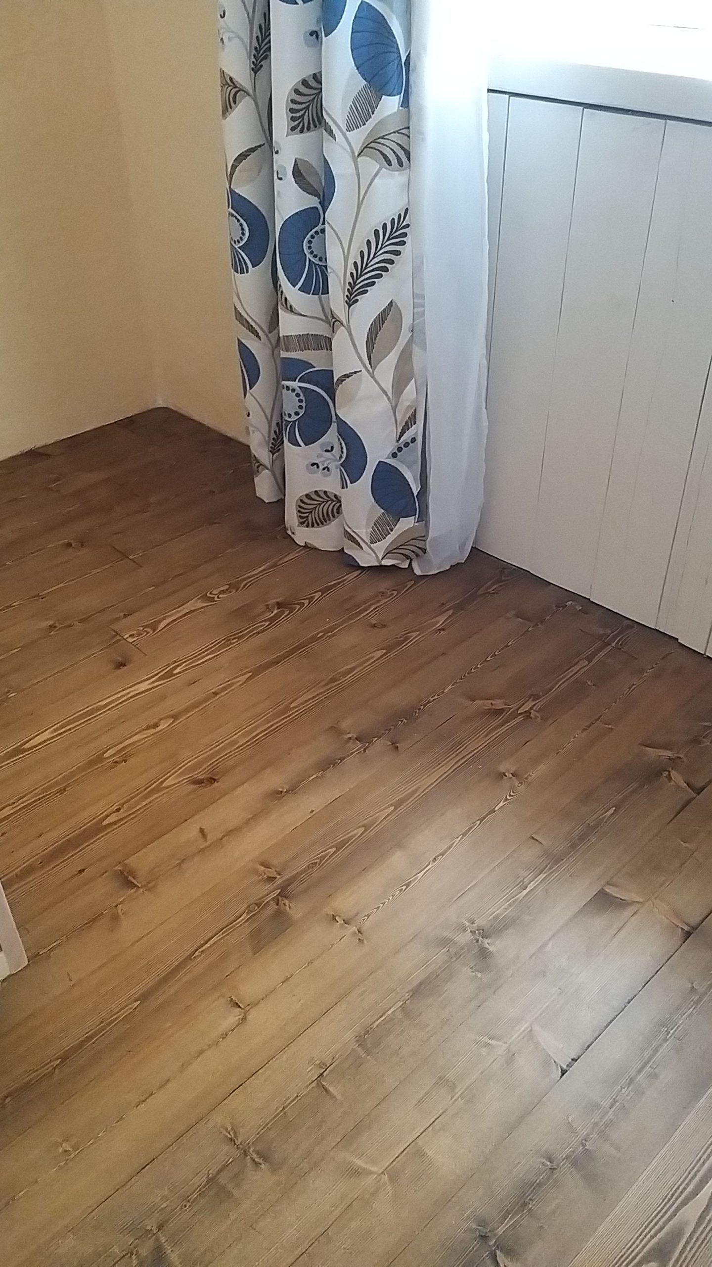 Ich habe den Farbton erst auf Dielenresten getestet. Ich habe zweimal geölt und dann endbeschichtet. Natürlich ist hier nicht alles glatt gegangen. Nach der zweiten Farbölschicht habe ich wohl an einigen Stellen nicht gut genug abgewischt, dort wurde das Öl klebrig. Das lässt sich nur wieder richten, wenn man wenige Farbspritzer Öl aufbringt und die erneut einpoliert. Der Boden ist nach dem Ölen superglänzend, trocknet aber wunderschön seidenmatt auf. Keine leichte Arbeit und eine, bei der einiges schiefgehen kann. Aber der Leinos-Kundendienst ist super und stand mit gutem Rat zur Seite.