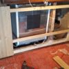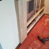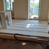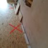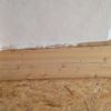 Der neue Boden wurde direkt auf den vorhanden Boden verlegt. Der alte Boden wies zur Wand hin größere „Löcher“ auf, das heißt das alte Holz ging nicht ganz bis zur Wand. Durch die Spalte sind in den letzten Jahren des Öfteren Mäuse in den Raum gekommen. Hier habe ich rundherum überall engmaschigen Hasenzaun an den alten Boden getackert und zur Wand hin aufgebogen. Beim Schneiden des Zaunes muss man vorsichtig sein, man kann sich daran leicht verletzen. Die größten Löcher wurden zusätzlich mit rasch abbindender Spachtelmasse gefüllt.