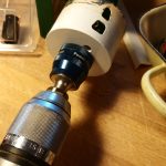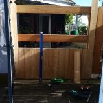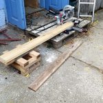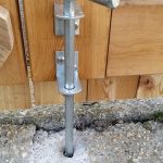Die Kloben wurden direkt mit dem Mauerwerk verbunden. Dafür haben wir die beiden Flügel auf ein langes Brett gestellt, so dass sie exakt gleich hoch waren und haben sie dann in der gewünschten Höhe eingerichtet. Danach haben wir den Kloben jeweils in das Ladenband gesteckt und die Bohrlöcher angezeichnet. Es war nicht bekannt, ob das Mauerwerk aus Ziegel (Vollziegel? Hohlziegel?) oder aus gelegten Steinen bestand. Je Kloben waren 6 Löcher zu bohren, die gut ausgesaugt wurden (wichtig!) Siebhülsen und Gewindestange wurden auf die benötigte Länge geflext (Länge war so berechnet, dass die Gewindestanden rund 14 cm tief im Mauerwerk waren). Das Befestigen der Kloben erwies sich als nicht ganz so einfach. Da die Bohrlöcher etwas größer waren als die Gewindestangen, war die Möglichkeit gegeben, dass sie die Gewindestange um 2-3 Millimeter verschoben hat. Fatal, wenn die Stangen hinter durch die Bohrlöcher des Klobens passen sollen. Also dann so: Den Teil des Klobens abschrauben, der später das Tor hält, so dass man nur noch die Platte in der Hand hat. Gewindestangen durch die Platte schieben und außen Muttern anbringen. Dann den Injektionsmörtel rein, etwas warten und dann alle 6 Gewindestangen in die Bohrlöcher schieben, dabei dann die Klobenplatte an die Wand schieben und die Gewindestangen bis zum Anschlag der Mutter reinschieben. Wen sich eine Stange nicht gut schieben lässt, weil das Bohrloch etwas schief ist, mit dem Hammer nachhelfen. Durch die aufgedrehten Muttern beschädigt man die Gewindestange nicht, so dass sich später – man will es ja auch hübsch haben – Hutmuttern aufschrauben lassen. In 10 Minuten ist das ganze fest, in 24 Stunden voll belastbar. Von den Kloben gibts nur fertige Bilder, wer sich für die einzelnen Schritte interessiert, bitte beim Projekt „Südstaaten Veranda“ nachsehen, dort wurde nach dem gleichen Prinzip gearbeitet.