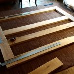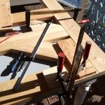 Die Maße des Torrahmens ergaben sich aus der Breite der Einfahrt. Das ursprüngliche Tor hing genau zwischen den gemauerten Torstehern, das neue Tor sollte von innen verschraubt werden, um die volle Breite der Einfahrt nutzen zu können. Maß von Mauersteher zu Mauersteher: 327 cm. Maß eines Torflügels: 175 cm breit, 135 cm hoch. Der Torrahmen wurde bereits für den späteren Beschlag gebaut. Wichtig bei der Konstruktion: Die schrägen Stützbalken. Man macht sie, damit das Gartentor später nicht „hängt“ und der Rahmen stabil bleibt. Ich zitiere: „Tore brauchen Druck, nicht Zug.“ Ich verlinke hier die Seite „Holzwerken„, hier wird das gut erklärt. Ich habe zunächst die Bretter auf die benötigte Länge geschnitten und dann provisorisch auf dem Boden aufgelegt. Auch die Beschläge habe ich gleich testweise mit dazugelegt, man will ja sehen, wie das später aussieht. Zuerst wurde aber der Holzrahmen verschraubt, dabei braucht man nicht nur eine dritte Hand, sondern am besten einen zweiten, der ebenfalls zupackt. Das Verschrauben erwies sich als schwierig, weil die Schrauben sehr lang waren und man von der Seite her nur schlecht exakt gerade schrauben kann. Besonders knifflig waren die schrägen Verbindungen, dafür musste ich letzlich Schrauben kürzen.