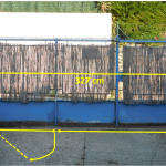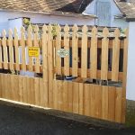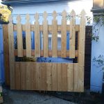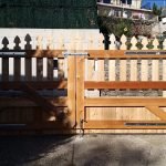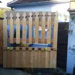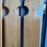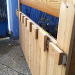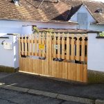 Für den unteren Torbelag wurden die Bretter gesägt und Löcher fürs leichtere Verschrauben gebohrt. 2-3 Schrauben mussten schräg eingebohrt werden, weil wir exakt am Bohrloch auf Schrauben des Rahmens getroffen sind. Der obere Torbelag wurde mit einem Muster verziert, er sollte später in einem leichten Bogen montiert werden. Für die Halbkreise habe ich eine Lochsäge verwendet. Dazu habe ich immer zwei Latten parallel mit Zwingen befestigt, in der Mitte gebohrt, Zwingen auf, beide Bretter umgedreht, dann das gleiche auf der anderen Seite. Für die Montage der Latten habe ich mir eine Hilfslatte gebaut, auf der ich nach Augenmaß gekürzte Latten montiert habe. Augenmaß reicht, muss ja nicht auf den Millimeter exakt sein. Zuletzt wurden dann außen die beiden Schilder montiert.