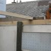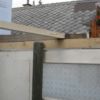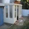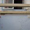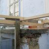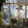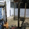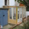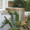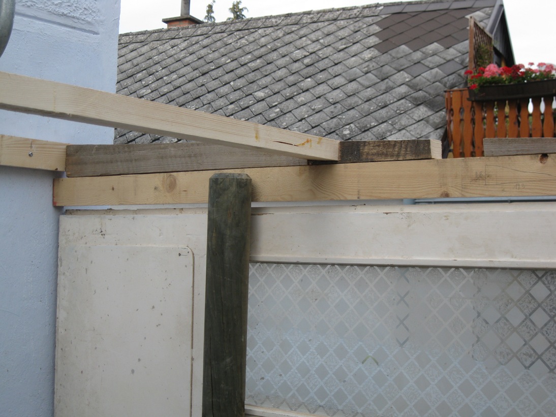 Vier Pfosten haben die Grundform des Gewächshauses vorgegeben, sie wurden mit Querstreben und Wasserwaage verbunden. Im rückwärtigen Teil wurde das Gewächshaus direkt an die äußere Hausmauer geschraubt. Durch die Lage direkt am Haus und das Tieferlegen des Gewächshauses ergab sich im rückwärtigen Teil eine Stufe. Die wurde belassen und später als unterer Teil des Pflanztisches genutzt.