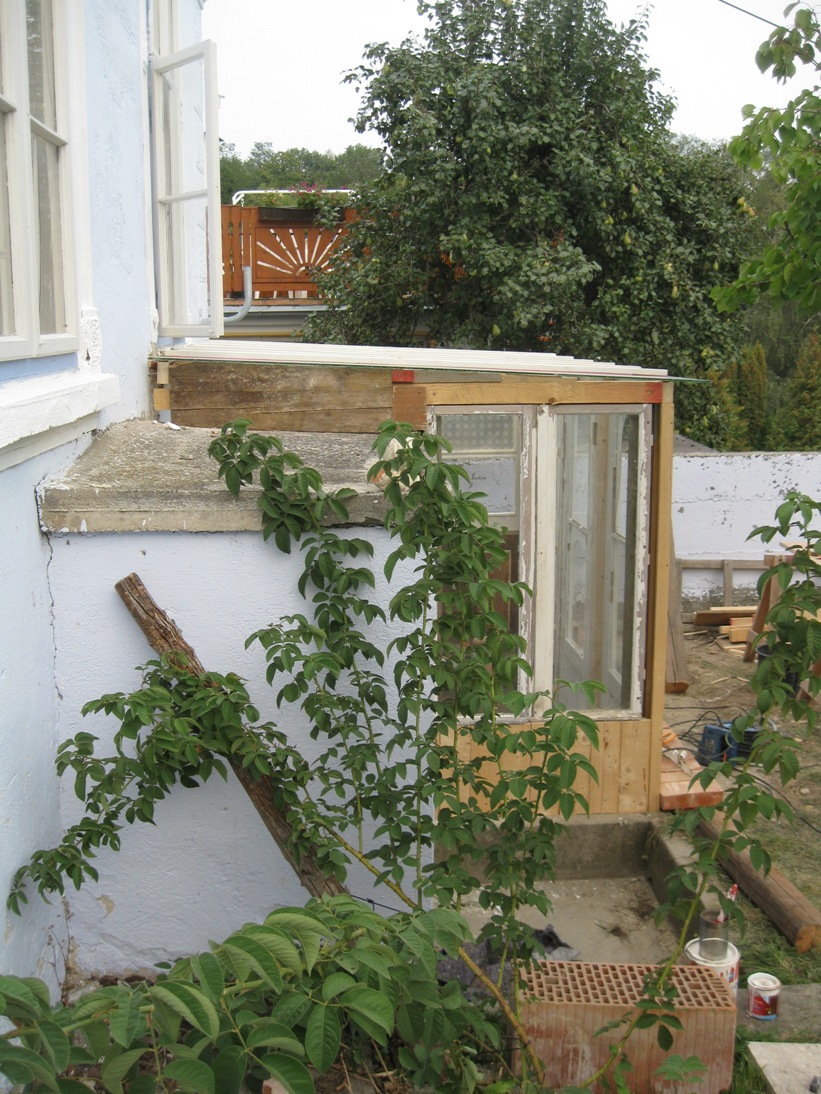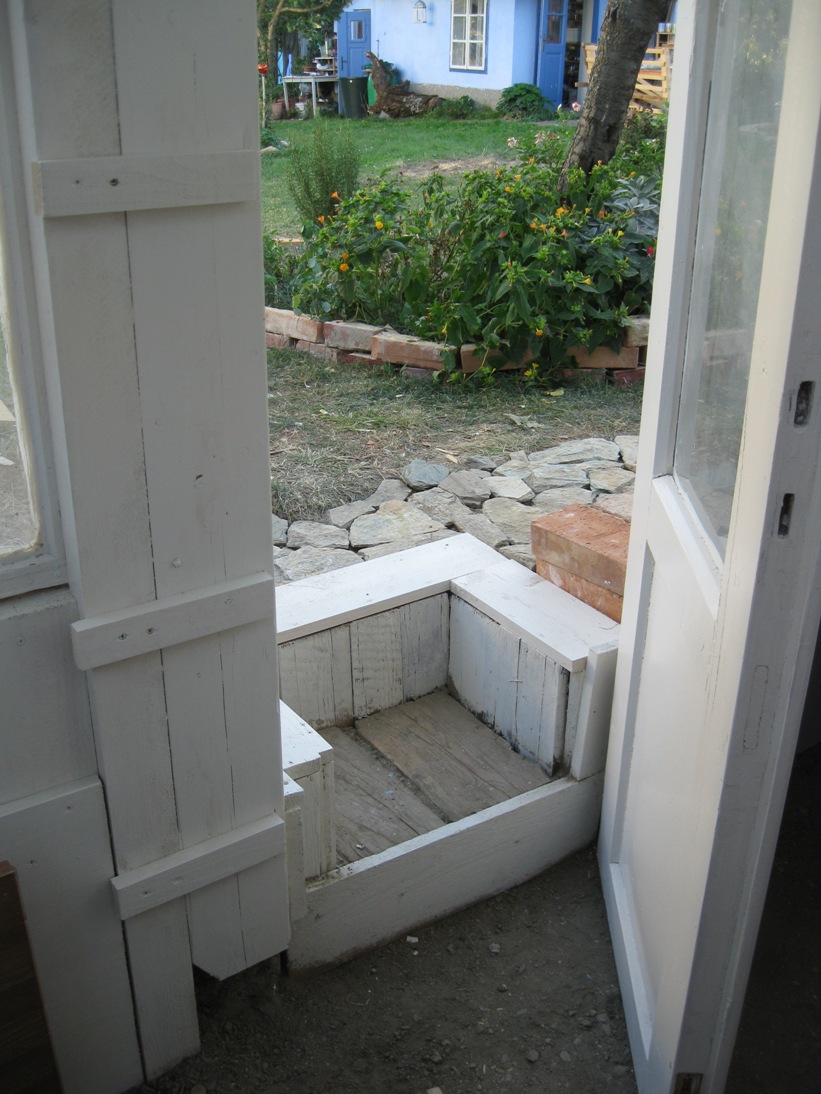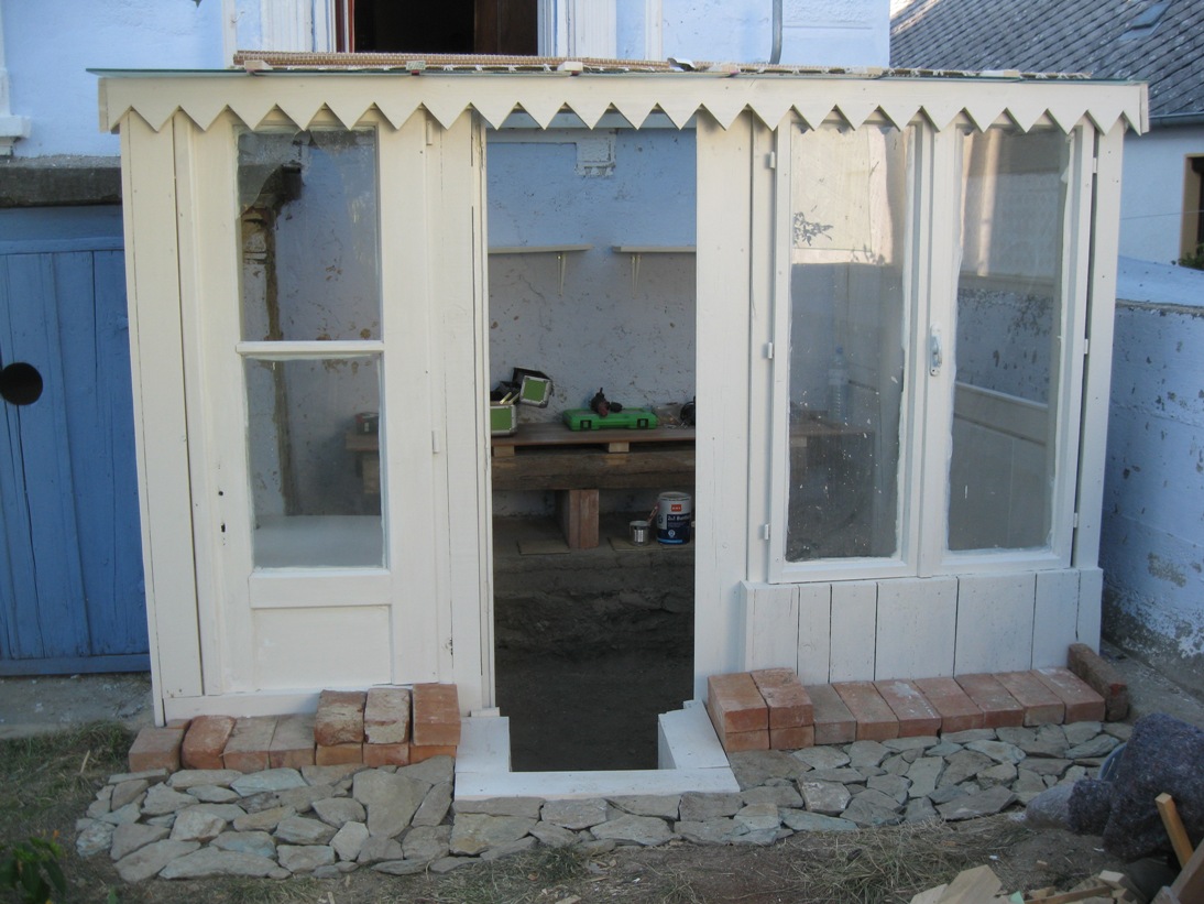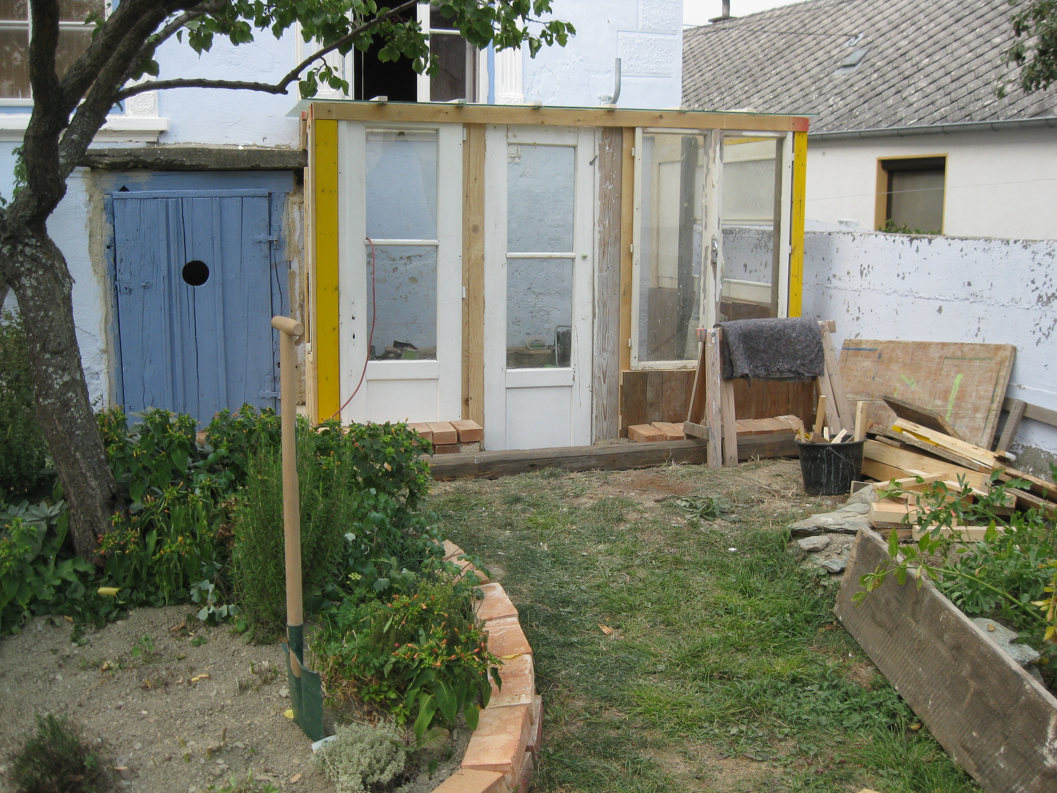 Holzstaffeln habe ich eingekauft, ebenso Schrauben. Das restliche verwendete Holz hatte ich herumliegen, dazu drei alte Fenster, die beim Umbau des Hauses überflüssig wurden sowie eine Tür, die ursprünglich im Haus angebracht war. Aus einem früheren Umzug hatte ich große, schwere Glasplatten mitgebracht, die wollte ich als Glasdach verwenden. Ziegel, Schotter und Parkettreste, Reste einer Yogamatte, mehrere dünne Latten.