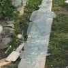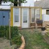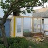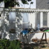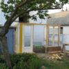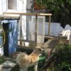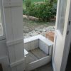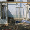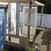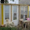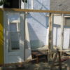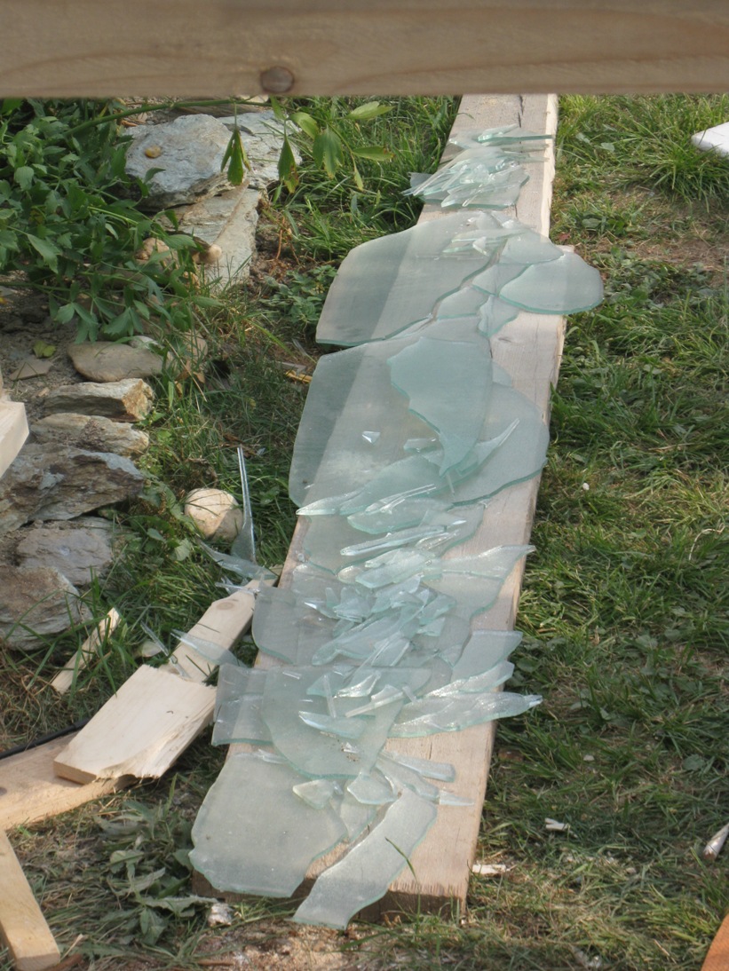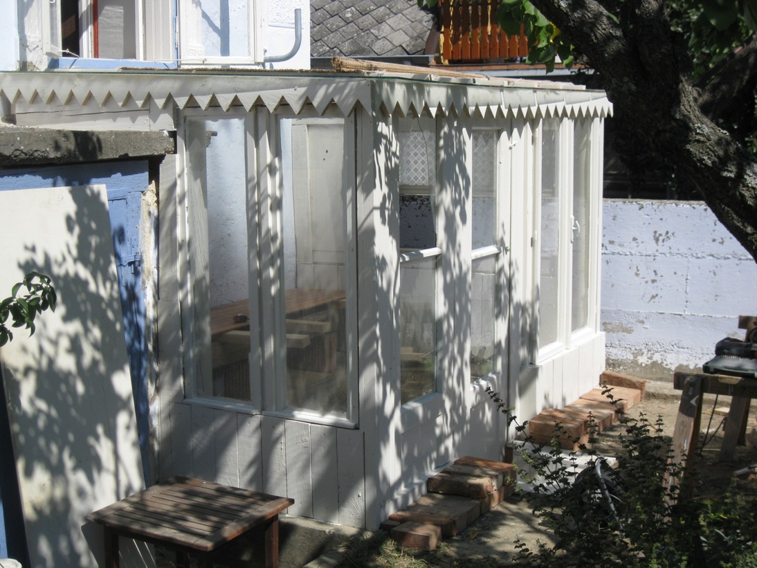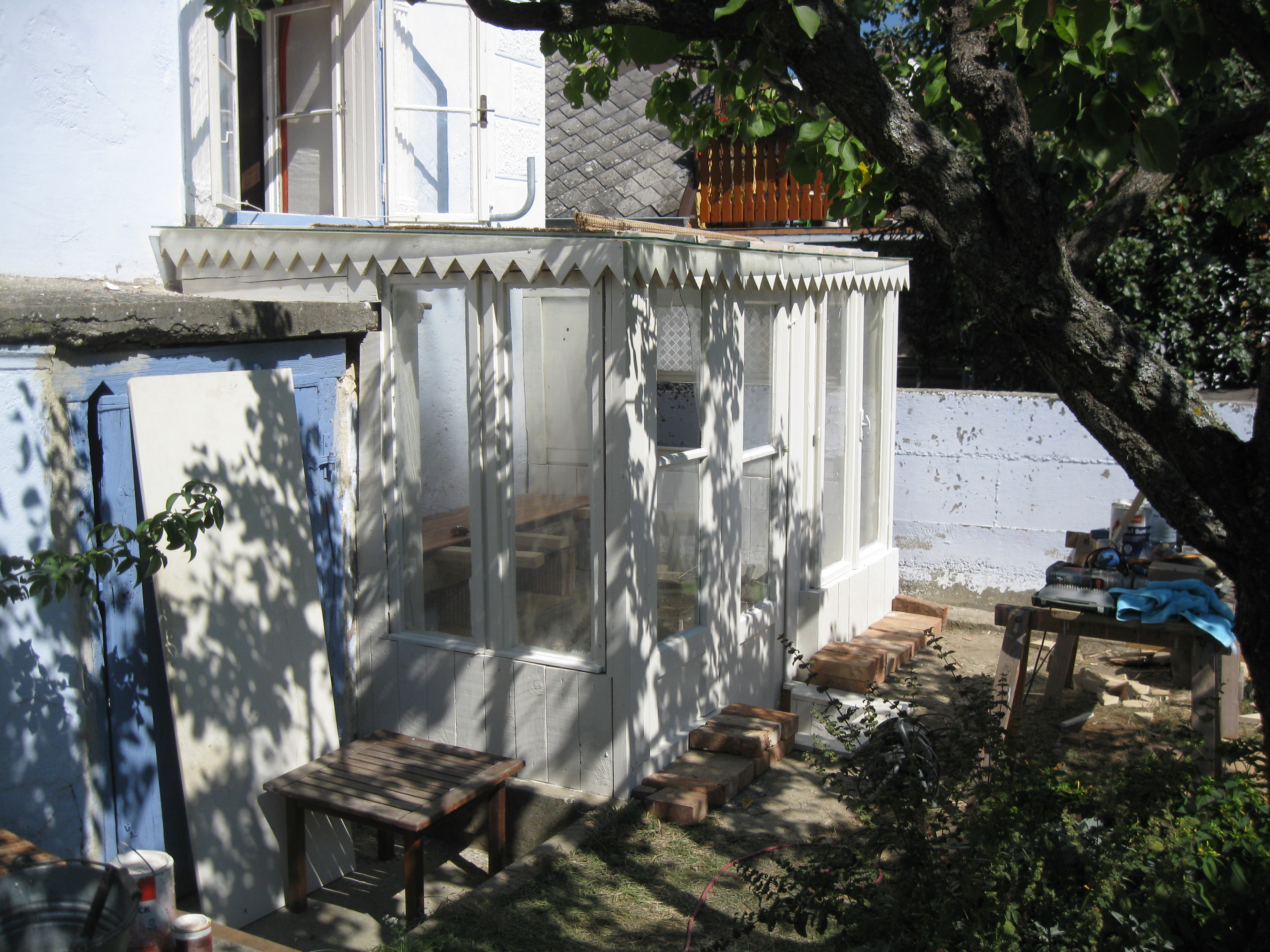 Holzstaffeln habe ich eingekauft, ebenso Schrauben. Das restliche verwendete Holz hatte ich herumliegen, dazu drei alte Fenster, die beim Umbau des Hauses überflüssig wurden sowie eine Tür, die ursprünglich im Haus angebracht war. Aus einem früheren Umzug hatte ich große, schwere Glasplatten mitgebracht, die wollte ich als Glasdach verwenden. Ziegel, Schotter und Parkettreste, Reste einer Yogamatte, mehrere dünne Latten.