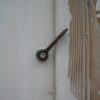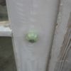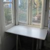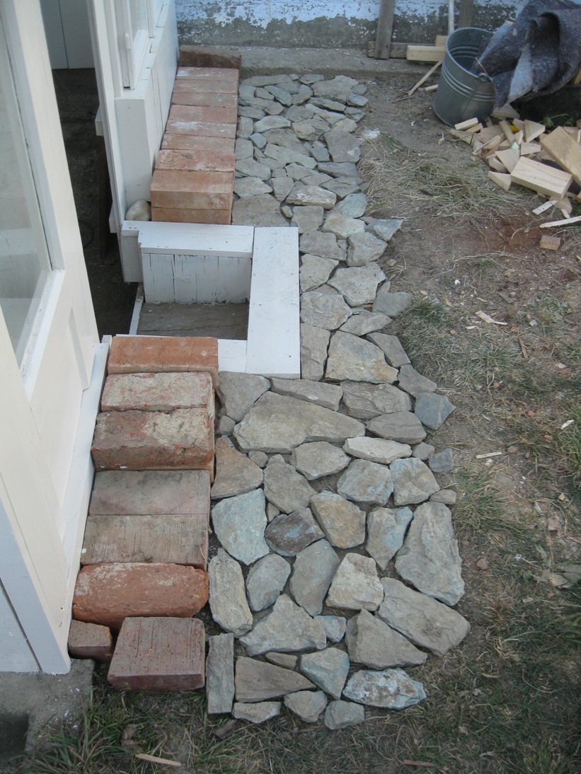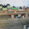 In das Gewächshaus hinein führt eine Stufe, die ich auf allen Seiten mit Holz verkleidet habe. An die Tür wurde ein Möbelknopf angebracht und ein Riegel, mit dem man die Tür sehr einfach auf- und zumachen kann. Den Arbeitstisch habe ich einfach aus übriggebliebenen Ziegeln gemacht, die Arbeitsfläche besteht aus Parkettresten, die ich passend zurechtgeschnitten habe. Auch ein weiterer Pflanztisch direkt am Fenster gehört zum Interieur. An die Hauswand wurden noch Regale geschraubt. Der Boden innen wurde mit groben Schotter ausgelegt, der überall im Garten bei Grabungen anfällt.