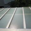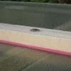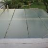 Meine Idee war, die Glasplatten anzubohren und direkt auf das Holzgestellt zu schrauben. Also habe ich mir einen Spezialglasbohrer besorgt. Das Bohren in Glas hat nicht funktioniert, aufgrund der Hitze, die beim Bohren entsteht, ist die gesamte Glasplatte gesprungen. Als Ersatzlösung habe ich auf die Querlatten Korkkreste gelegt und darauf dann die Glasplatten immer mit einigem Abstand zueinander. Auf Kork ruscht so gut wie nichts und die Glasplatten sind sehr schwer und massiv. Befestigt habe ich die Glasplatten von oben mit Latten, die ich in die Holzkonstruktion eingeschraubt habe. Die Unterseite der Latten ist mit einem Rest Yogamatte abgefedert.