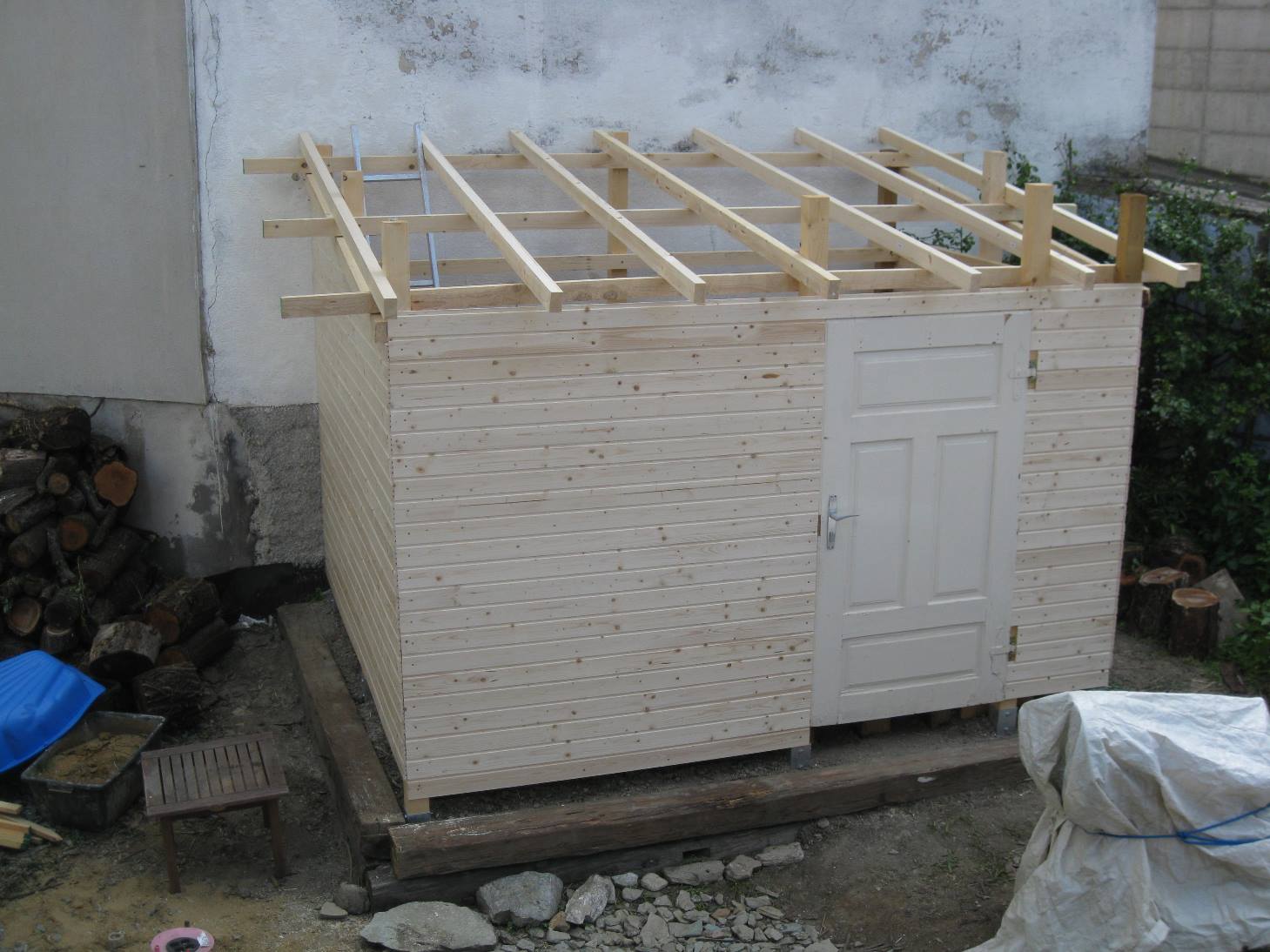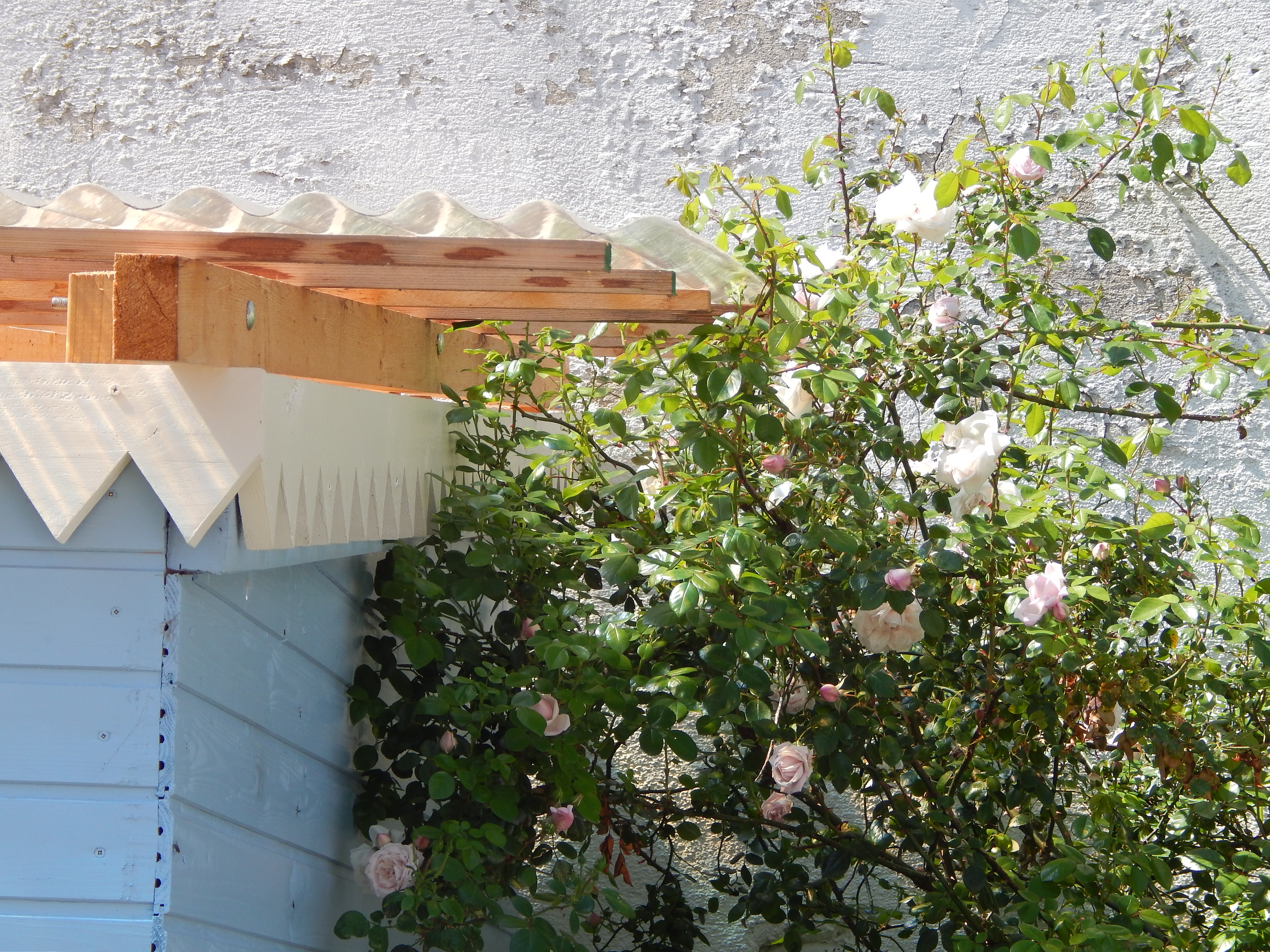 Von Anfang an war klar, dass das Dach schräg sein würde, damit Wasser oder Schnee gut abrutschen können. Die Dachneigung hatte ich vorher berechnet und hier mit der geringstmöglichen Dachneigung gearbeitet, die noch machbar ist. Informationen über Dachneigungen habe ich mir übers Internet besorgt. Ich habe zunächst die Querstaffeln auf die solide Unterkonstruktion (die bereits schräg war) gelegt, danach habe ich die Längsstaffeln aufgelegt. Wichtig dabei: Die Staffeln müssen „hochkant“ stehen, damit sie nicht später durchhängen. Die Pfosten habe ich erst am Ende mit der Motorsäge eingekürzt, als klar war, wie hoch das Dach werden würde. Das Anbringen des Well-Daches gestaltete sich schwierig: Da das Material auf Rolle war und ich nicht unnötigerweise Material durch Überlappungen verschwenden wollte, die es gegeben hätte, hätte ich mit abgeschnittenen Stücken gearbeitet, musste ich die Schrauben auf der Leiter „über-die-Rolle“ anbringen, weil ja „aufgerollte wurde. Die Rolle war zu breit, als dass ich sie hätte ganz ausrollen und von unten befestigen können. Zuletzt habe ich an den Seiten noch Holzlatten unterlegt mit einem Stück alter Yogamatte von oben ans Dach geschraubt, damit der Wind nicht die Schrauben ausreissen kann (das ist mir bei einem anderen, kleineren Dach passiert).