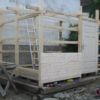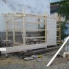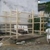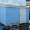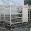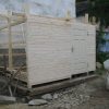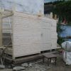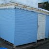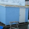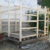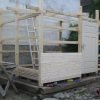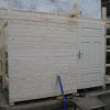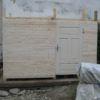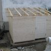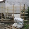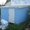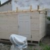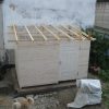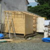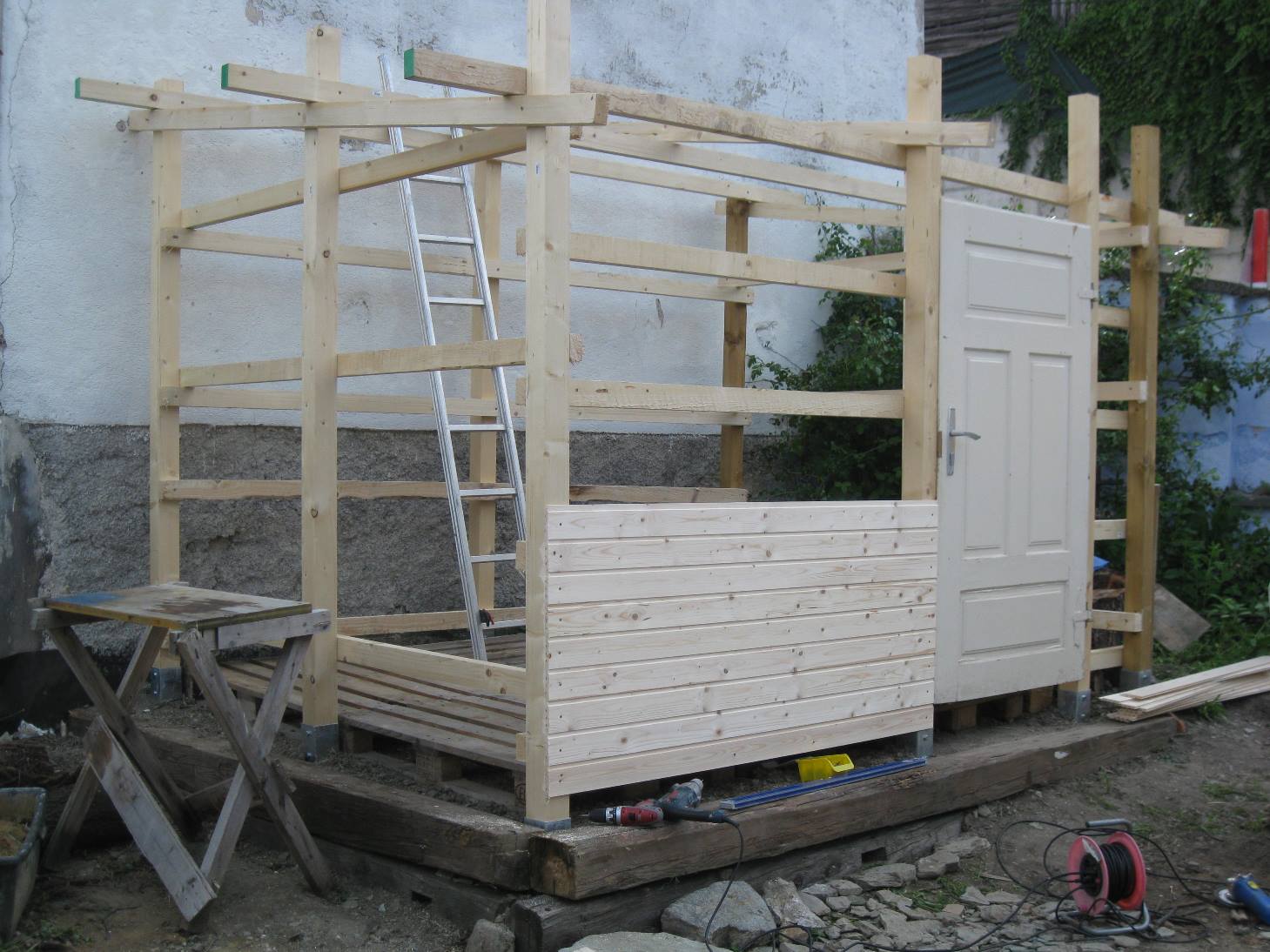 Baustaffeln, Nut- und Federbretter, kürzere und längere Schrauben, Dübel für die Wand, Tram, Bodenhüsen, Pfosten, genügend lange Sechskantschrauben mit Muttern. Eine alte Holztür vom Bauhof, die glücklicherweise bereits Türbänder hatte, dazu Gegenstücke für die Türbänder. Für das Dach habe ich Polyesterwellbahn auf Meterrolle genommen, die kann man sich im Baumarkt passend abschneiden lassen. Acryllack für die Lackierung, Bretter für die Verzierung, Paletten für den Boden.