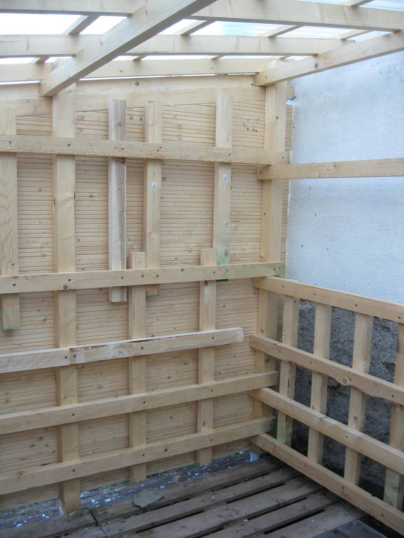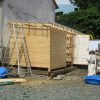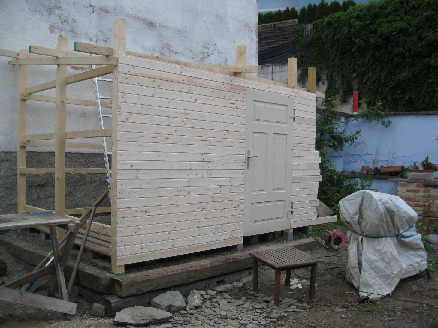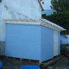 Bei den Wänden habe ich mit Nut- und Federbrettern verkleidet und mich hier wirklich für die Billigvariante entschieden. Es sollte ja nur ein Regenschutz sein, es kam also nicht darauf an, dass hier gedämmt wird oder an den Wänden etwas befestigt werden sollte. Ich habe zur Sicherheit mit bereits eingehängter Tür gearbeitet. Die Bretter wurden von unten nach oben angeschraubt, das unterste Brett wurde mit Hilfe der Wasserwaage ins Lot gebracht. Die Bretter bei den Schrägen waren eine Fizzlerei, und die Schräge selbst habe ich nach Augenmaß gezeichnet und abgesägt.
