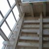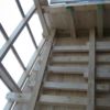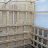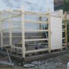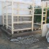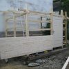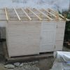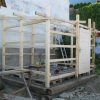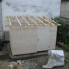 Konstruiert habe ich die Hütte „out-of-the-box“, d.h. einfach nach Gefühl. Wichtig waren zunächst die starken Pfosten, die das Grundgerüst der Hütte bilden. Die habe ich mit Hilfe von Pfostenhülsen, die ich in den Boden geschlagen habe und mit zusätzlichen Sechskantschrauben, befestigt. Das Einschlagen der Pfostenhülsen geht nur mit einem 10-Kilo-Hammer und mit Hilfe eines abgeschnittenen Pfostenstückes, das man in die Hülse einlegt und zum Draufschlagen nutzt. „Gerade“ wurden die einzelnen Pfosten erst im Verbund, hier habe ich beim Anbringen der Querstaffeln viel mit drei Wasserwaagen gearbeitet – und mit einem gesunden Augenmaß. Nachdem die Querstaffeln angebracht waren, habe ich auch noch, dort wo es nötig war, mit weiteren Staffeln vertikal verstärkt. Insgesamt habe ich die Hütte rund 15 cm entfernt von der Hauswand des Nachbarn gebaut und nur die Verkleidung dann ganz zur Hauswand gerückt. Die Staffeln habe ich hier ausnahmsweise nicht geschliffen, sondern gleich sägerauh verarbeitet.