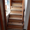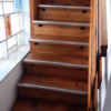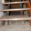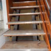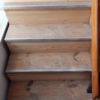 Die Holztreppe dieses Hauses war unter Linoleum und Teppich verborgen, beides wurde im Zuge der Renovierung herausgerissen. Die Treppenstufen sind auf einem Eisengestell montiert. Dabei ist bei der Renovierung aufgefallen, dass jede Treppenstufe unterschiedlich hoch ist und auch die Höhen links und rechts gemessen nicht immer gleich hoch waren – man war also etwas „Freestyle“ beim Schweißen. Nachdem der alte Teppich entfernt war, gabs das optische Problem, dass man durch die Konstruktion durchsehen konnte, dahinter war alles sehr staubig und schmutzig. Also wurde entschieden, die Treppenstufen zu verblenden.
