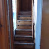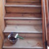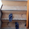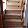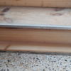 Jeweils zwei Bretter wurden übereinandergesteckt, dann wurde das obere Brett auf die richtige Länge gesägt und schließlich wurden beide Bretter mit den Fichtenstaffeln verschraubt. Um die Verblendung an der Treppe befestigen zu können, wurde auf der Treppe ebenfalls eine Staffel angeschraubt – genau dort wurde die Verblendung dann von außen festgeschraubt. Für die Eisenkonstruktion mussten kleine Ecken ausgesägt werden. Im ersten Versuch wurden die Verblendungen sehr weit außen angebracht. Nach einem „Gehversuch“ (siehe Bilder mit Flip-Flops) kam dann alles nochmal runter, und die Verblendung wurde so weit wie möglich zurückgesetzt, um mehr Platz für das Aufsetzen der Füße zu haben. Die Treppe ist eben alt und sehr schmal gebaut mit sehr engen Stufen. Zuletzt wurden die gesamte Treppe lasiert und mit Parkettlack versiegelt.
