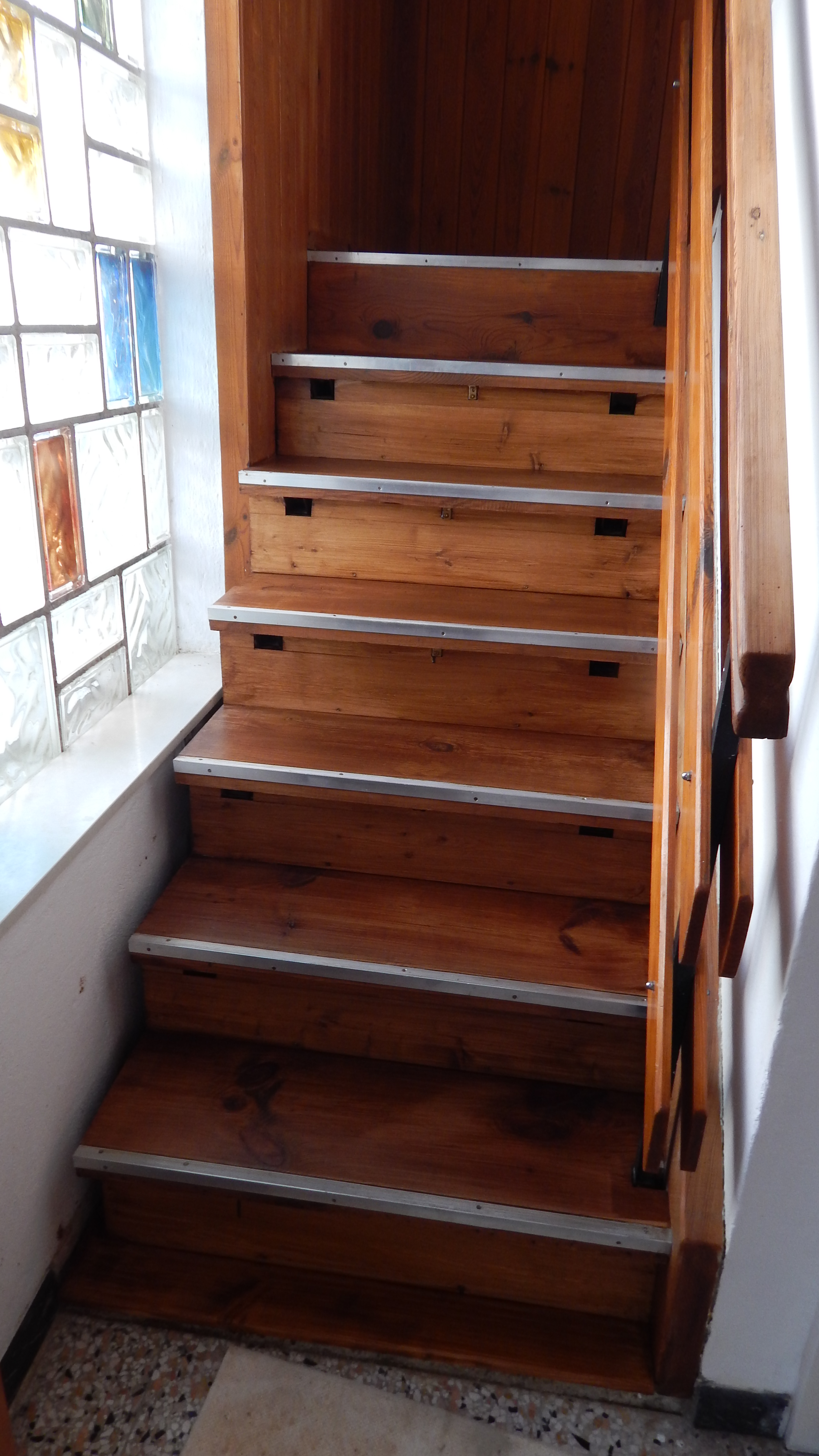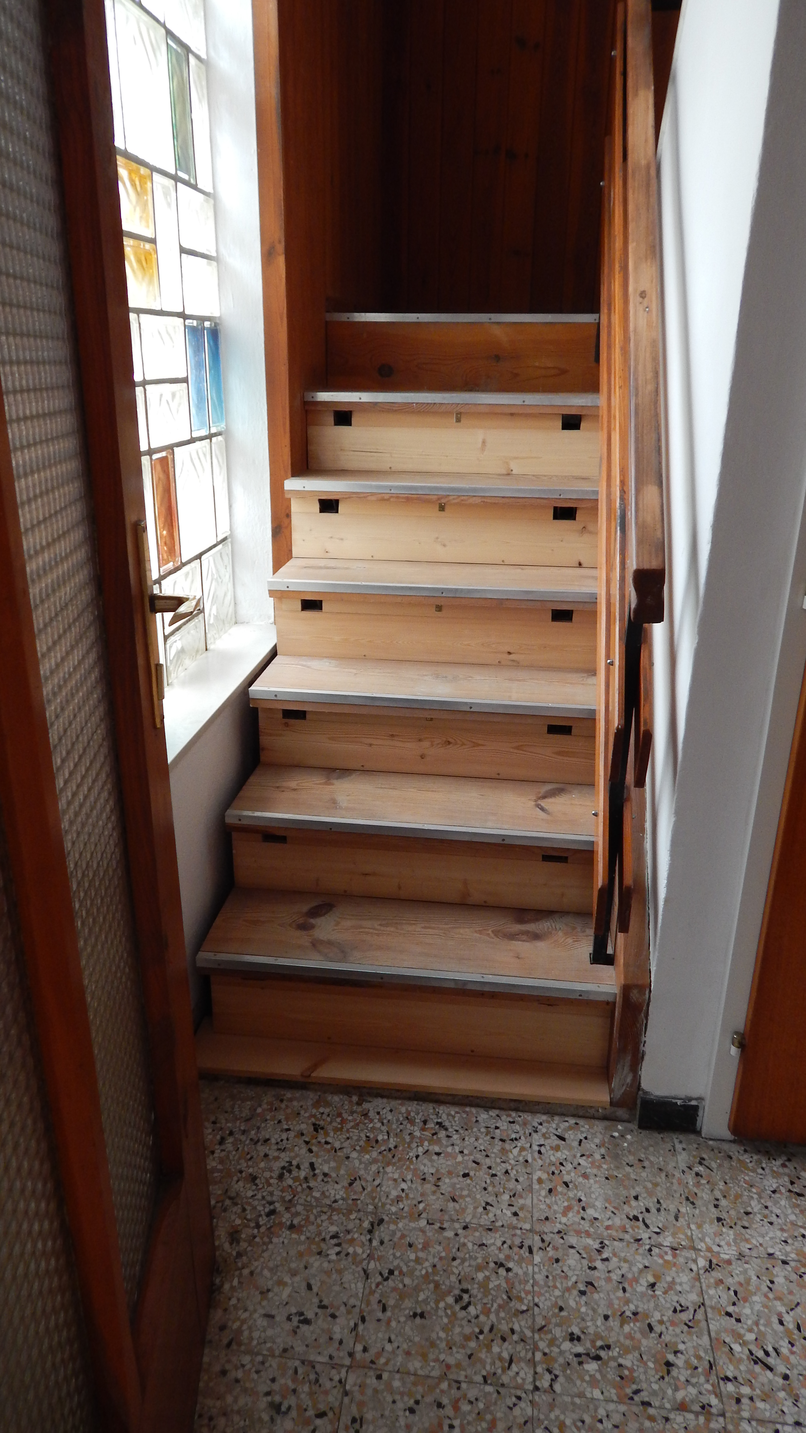 Jeweils zwei Bretter wurden übereinandergesteckt, dann wurde das obere Brett auf die richtige Länge gesägt und schließlich wurden beide Bretter mit den Fichtenstaffeln verschraubt. Um die Verblendung an der Treppe befestigen zu können, wurde auf der Treppe ebenfalls eine Staffel angeschraubt – genau dort wurde die Verblendung dann von außen festgeschraubt. Für die Eisenkonstruktion mussten kleine Ecken ausgesägt werden. Im ersten Versuch wurden die Verblendungen sehr weit außen angebracht. Nach einem „Gehversuch“ (siehe Bilder mit Flip-Flops) kam dann alles nochmal runter, und die Verblendung wurde so weit wie möglich zurückgesetzt, um mehr Platz für das Aufsetzen der Füße zu haben. Die Treppe ist eben alt und sehr schmal gebaut mit sehr engen Stufen. Zuletzt wurden die gesamte Treppe lasiert und mit Parkettlack versiegelt.