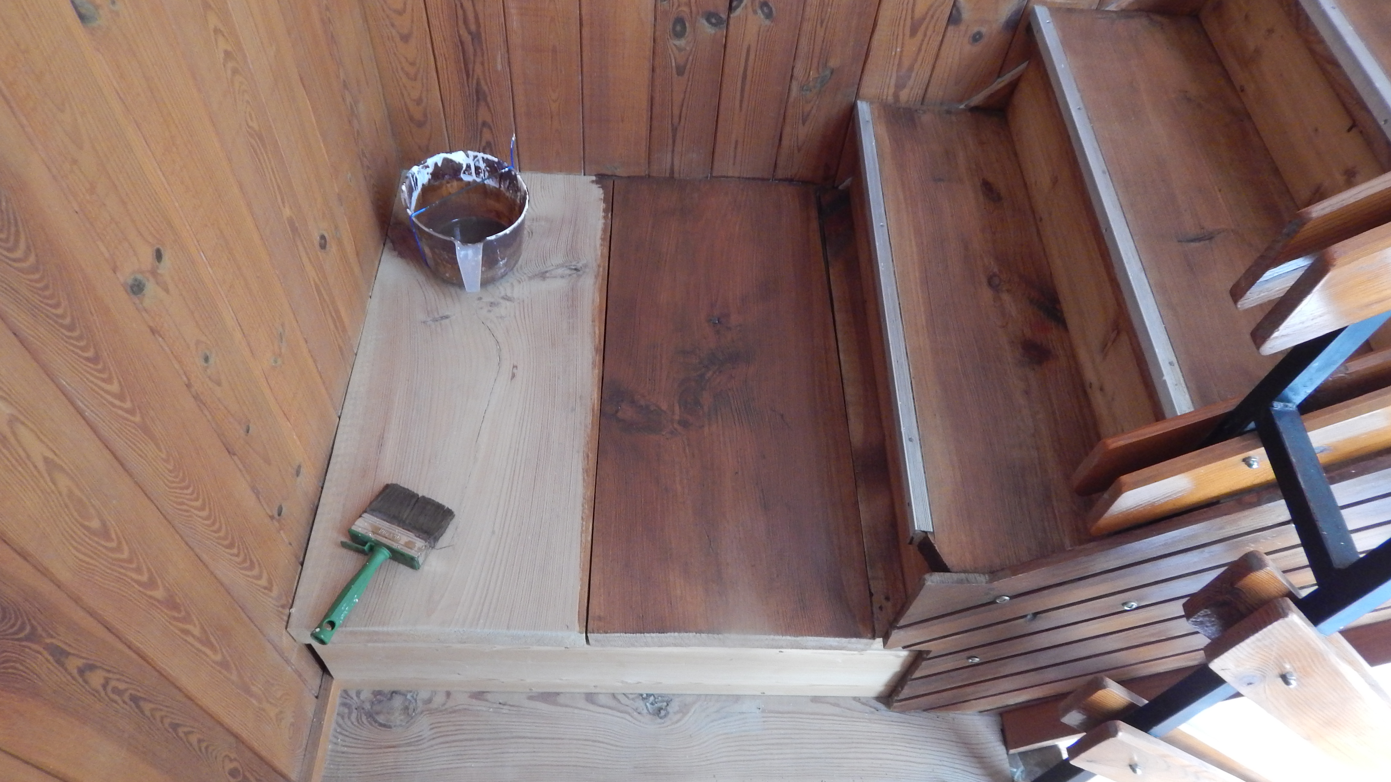 Als Material wurden Nut- und Federbretter verwendet, die vom Legen des Bodens übrig waren, sowie einfache Fichtenstaffeln zur Verstärkung.