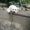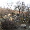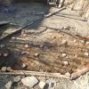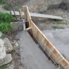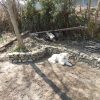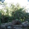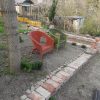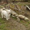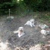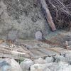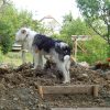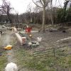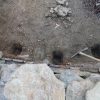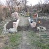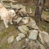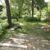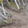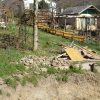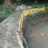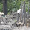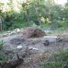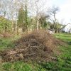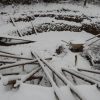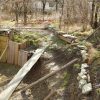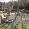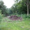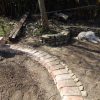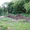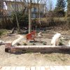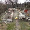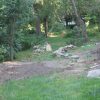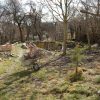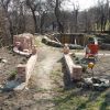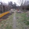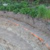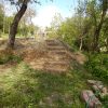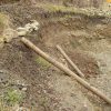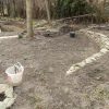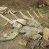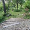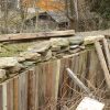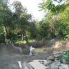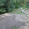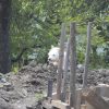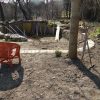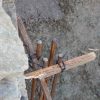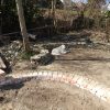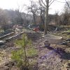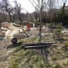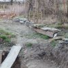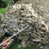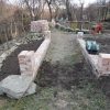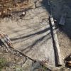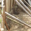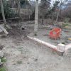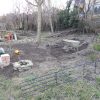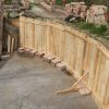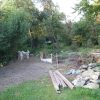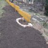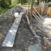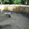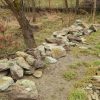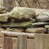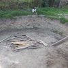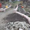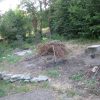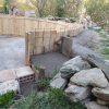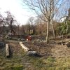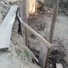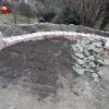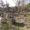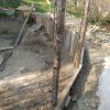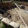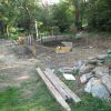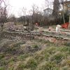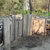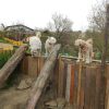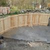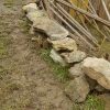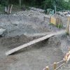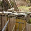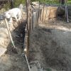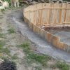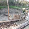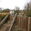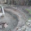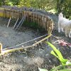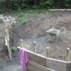 Im März war die erste Arbeit, den Schaden aus dem Einbruch zu beseitigen. Material wegschaffen, Abstützmauer neu und besser errichten. Dazu habe ich Rundholz verwendet, das ich so tief es nur möglich war, in den Boden hineingegraben habe (ca. 60 cm). Dazu habe ich mit Baustaffeln dann im Halbkreis alle Pfosten mit Hilfe von Schlossschrauben miteinander verbunden, so dass der feste Halbkreis nicht mehr in sich zusammensacken konnte. Weiter Material aus der Grube abgebaut.