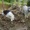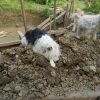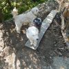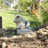 Eisengitter und Ziegel wurden an den Pool transportiert, die Mischmaschine wurde oben am Haus beim Wasseranschluss aufgestellt. Letzte Arbeiten an der Baugrube wurden gemacht. Nachdem ich über den Winter Schnittgut in den Pool geworfen hatte, haben wir das verheizt. Der erste Schritt für das Betonieren des Pools war das Graben von Gruben, in die ich jeweils vier starke Eisenstangen gesteckt habe. So sollten dann ein Teil der Betonpfeiler „unter“ dem Pool im Boden verankert werden. Die Eisengitter wurden in den Pool geschafft und mit der Flex in passende Stücke gesägt.