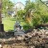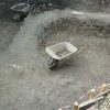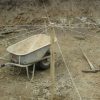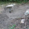 Im September konnte ich nur noch eine Ausfahrt aus der Baugrube nutzen, da ich am anderen Ende weiter den Aushub mit einem Verbau verstärkt habe. Die eine Auffahrt habe ich fast bis zum Ende des Grabens nutzen können. Ich habe immer mit zwei Scheibtruhen gearbeitet: In eine kam die abgetragene Erde, in die andere der grobe Schotter. Ich habe Unmengen an Steinen ausgegraben, kleine, aber auch richtig Große. Gegen Ende des Monats habe ich provisorisch mit Bauabsperrband eine mögliche künftige Höhe des Pools abgesteckt, damit ich abschätzen konnte, wie hoch Material aufgeschüttet werden musste. Um zu sehen, wie hoch rundherum der künftige Pool werden sollte, habe ich dann in der Mitte einen Pflock eingeschlagen und ziemlich umständlich mit Seilen, die ich gespannt habe und mittels Wasserwaage eine erste Wasserlinie rundherum angezeichnet. Zwei Jahre später hatte ich dann eine Laserwaage, mit der geht das deutlich einfacher.