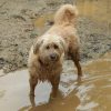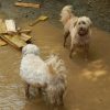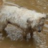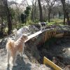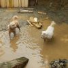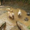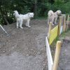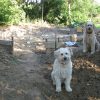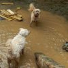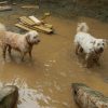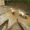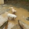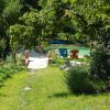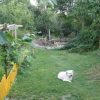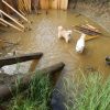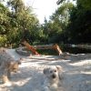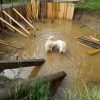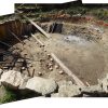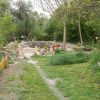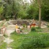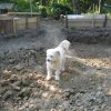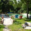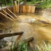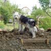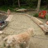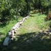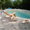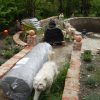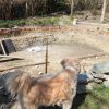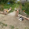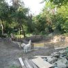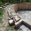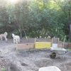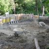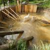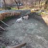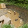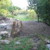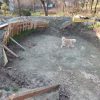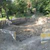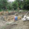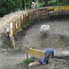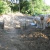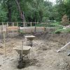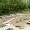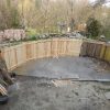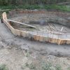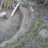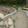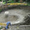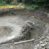 Im Mai hat es weitergeregnet, das Wasser in der Baugrube wurde noch mehr und ich habe die Stützwände sukzessive alle 30 cm im Schlamm abgestützt. Nochmal ist ein Teil des Materials gesackt und musste ergänzt werden. Im Nachhinein bin ich über die lange Bauzeit froh, weil das Material drei Jahre Zeit hatte, sich zu setzen. Im Juni habe ich noch weiter Material aus der Grube abgebaut. Dabei habe ich begonnen, die Umgebung aktiv zu gestalten, indem ich mit Tram eine weitere kleine Stützmauer gebaut habe, die ich mit genügend Pflöcken abgestützt habe. Entgegen meinem ursprünglichen Plan, den Pool ganz rund zu bauen, habe ich mich dann für eine kleine Flachwasserzone entschieden, die später als Aus- und Einstieg für die Hunde dienen sollte.