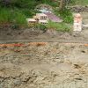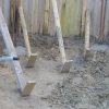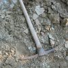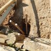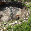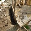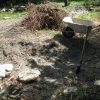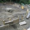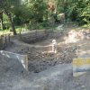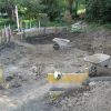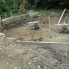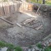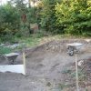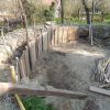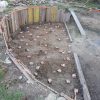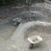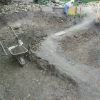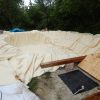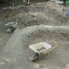 Im August habe ich dann zwei Ausfahrten zur Baugrube angelegt, auf jeder Seite habe ich Aushubmaterial hinausgeschaft. Ich habe zum Hinauskarren das Erdreich selbst genutzt, es teilweise sogar aufgeschüttet und dazwischen tiefer gegraben. Schnell wurde es nötig, das Erdreich abzustützen, das ich rund um den künftigen Pool aufgeschüttet habe. Das habe ich mit Hilfe von Pflöcken und einfachen Brettern gemacht. Nur die oberste Schicht von rund 40 – 50 cm hat sich mit dem Spaten gut aufgraben lassen. Alles, was tiefer lag, musste erst mit dem Krampen aufgehackt werden. Das Erdereich war sehr steinig-felsig: Schlecht zum Abgraben, aber super, wenns ums Anschütten geht, weil das in Verbindung mit Lehm einfach bombenfest hält.
