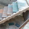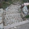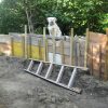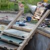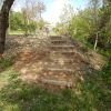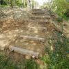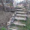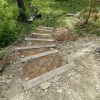 Im April hat es praktisch vier Wochen durchgeschüttet. Die Baugrube ist mit Wasser vollgelaufen und ein Teil der neu aufgeschütteten Abstützen ist erneut eingebrochen und musste daher wieder saniert werden. War aber zum Glück nicht mehr so schlimm und schnell erledigt. Provisorisch habe ich dann dort, wo künftig die Treppe sein sollte, zwei dicke Tram hineingelegt – als Stütze für meine Phantasie. Zusätzlich habe ich begonnen, eine Treppe in den unteren Teil des Gartens zu bauen. Da die Erdauffahrt nicht mehr nutzbar war, weil auch auf dieser Seite aufgeschüttet wurde, habe ich für den Rest der Bauzeit ein lange, sehr dickes Eichenbrett benutzt, um Material zu verräumen. Ohne dieses Eichenbrett hätte ich die Baugrube nicht leerbekommen, es hält mich samt voller Scheibtruhe locker aus. Weiter Material aus der Grube abgebaut.