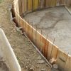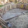 Eine neuralgische Stelle beim Betonieren war die Poolmauer direkt neben dem künftigen Einstieg. Dort habe ich aus Brettern eine spezielle Verschalung „über Luft“ gebaut und mit Hilfe von Eisenstreben dann auch „über Luft“ betoniert. Hat gut geklappt.