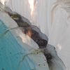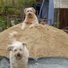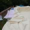 Die Folie maß 144 m² und wog rund 280 Kilogramm. In jedem Teichhandbuch ist zu lesen, dass fürs Verlegen einer Folie dieser Größe mindestens zwei, besser aber drei Personen vorhanden sein müssen. Ich kann berichten: Es geht auch allein, sogar als Frau, aber man muss wirklich mit Köpfchen arbeiten und jeden erdenklichen Hebel einsetzen, wie immer, wenn die Kraft fehlt. Ich habe zunächst auf der Seite, wo die Folie über den Poolrand gewuppt werden sollte, Matratzen und Decken und Teppiche gelegt, auch über die Poolmauer, um eine Beschädigung der Folie zu verhindern. Dann habe ich die Folie zuerst längs ausgerollte, hernach in den Pool hinein und auf der anderen Seite wieder hochgezogen. Das Ganze hat ungefährt eine dreiviertel Stunde gedauert, bis es fertig war. Einfach wars nicht, aber es hat funktioniert.