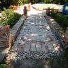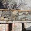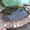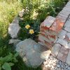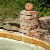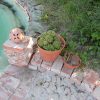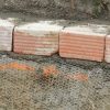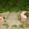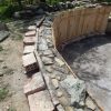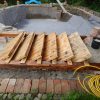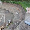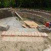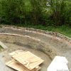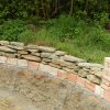 Überall, wo es Schalung gab, wurde eine Poolmauer mit Steinen gemacht, die mit Beton ausgegossen wurde. Nach rund zwei – drei Wochen habe ich dann die Schalung wieder entfernt. Die Teile der Umrandung, auf der später schwere Steine den Rand befestigen sollten, wurden ebenfalls mit Eisengittern versehen und mit Beton gegossen, so dass auf diesen Art ein kompletter Eisenbetonring rund um den Pool entstanden ist. Auf diesen Betonring wurden dann Ziegel betoniert, dazwischen wurde ein Hasengitter (auf Rolle) fixiert. Das Hasengitter ist wichtig, weil auf der oberen Höhe des Pools sonst die Gefahr besteht, dass Wühlmäuse sich durch das Vlies und die Poolfolie fressen, um zum Wasser zu gelangen. Der künftige Einstieg wurde mit Steinen ausgelegt und ebenfalls betoniert.