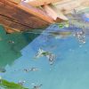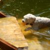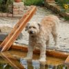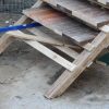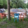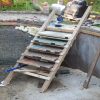 Dann wurde eine Einstiegstreppe gebaut aus vorhandenem Material: Tram und von Parkbänken übrig gebliebene Eichenbretter. Die Holztreppe wurden ebenfalls dreimal mit Bootslack gestrichen, sie ist so schwer, dass es mindestens zwei, besser drei Leute braucht, um sie dann auch zu heben. Gebaut habe ich die Treppe IM Pool um mir sicher zu sein, dass die Neigung und Treppenstufen passen.