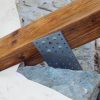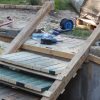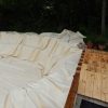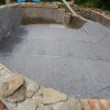 Das Vlies zu verlegen, war nicht schwer. Ich habe Bahn für Bahn abgewickelt und in den Pool gelegt. Befestigt habe ich das Vlies mit Hilfe von Nägeln, die ich in die vorher aufgeschraubten Holzbretter geschlagen habe. Die Vliesbahnen habe ich mit Klebeband verbunden, um ein Auseinanderrutschen beim späteren Anbringen der Folie zu verhindern. Kaum war das Vlies drin, hat es gschüttet wie aus Kübeln und alles war patschnass. Das ist aber egal, man kann die Folie trotzdem aufs Vlies legen, auch wenn es nass ist.
