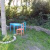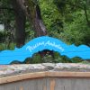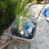 Endlich, Anfang Juni hiess es dann: „Wasser marsch!“ Als Knackpunkt erwies sich die Holztreppe, denn ich hatte eine simple Tatsache nicht bedacht: Holz schwimmt. So schwer die Treppe an Land war, so leicht war sie dann im Wasser. Für die Füße der Treppe hatte ich wattiert Stützen gebaut, die aber mehrfach weggeschwommen sind, weil der Druck auf die Treppe fehlte. Ich habe also an den Seiten der Treppe schwere Steine angebracht. Und weil sich auch das noch als zu leicht erwies, habe ich eine Gabione mit Hilfe von Gurtbändern und die Treppe gehängt, die ich bis zum Rand mit Steinen gefüllt habe. Das hat dann letztlich gehalten. Erst nachdem der Pool vollständig voll war, habe ich die Folie passend abgeschnitten. Mit weiteren Brettern, die ebenfalls mit Bootslack behandelt waren, habe ich dann Folie und Vlies zusammengeklemmt und zusammengeschraubt. Dann wurde beide knapp über dem Brett abgeschnitten. Später soll hier noch eine verdeckende Verkleidung kommen: Nächster Jahr. Auch die Pool-Umgebung wurde weiter gestaltet und erste Pflanzen wurden eingesetzt. Eine kurze Schrecksekunde gab es, weil ich die Poolfolie während des Einlassens nicht genügend befestigt hatte. Ich stand im Pool und in Zeitlupe senke sich plötzlich im Halbkreis die Poolfolie ins Wasser. Da hiess es: Nerven bewahlten und schnell arbeiten, die Folie wieder herausziehen, bevor das Wasser zwischen Poolfolie und Vlies dringt: Denn dann hätte ich die Folie nicht mehr herausbekommen, sie wäre zu schwer gewesen.