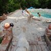 Im April wurde die Hälfte des Pools am Boden mit Eisengitter belegt. Darunter habe ich Ziegelstücke gelegt, die das Gitter auf Höhe gehalten haben, so dass es später mitten im Beton sein würde. Dann wurde der Boden betoniert, die vorher gefertigten Eisen, die im Boden eingelassen waren, wurden mit betoniert. Den Beton habe ich teilweise von oben in die Grube gekippt und dann unten glattgemacht, teilweise aber auch mit der Scheibtruhe direkt in die Grube geführt und dort geschüttet.
