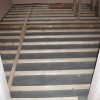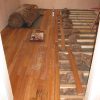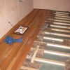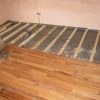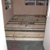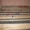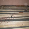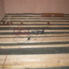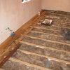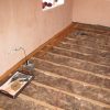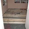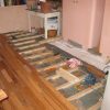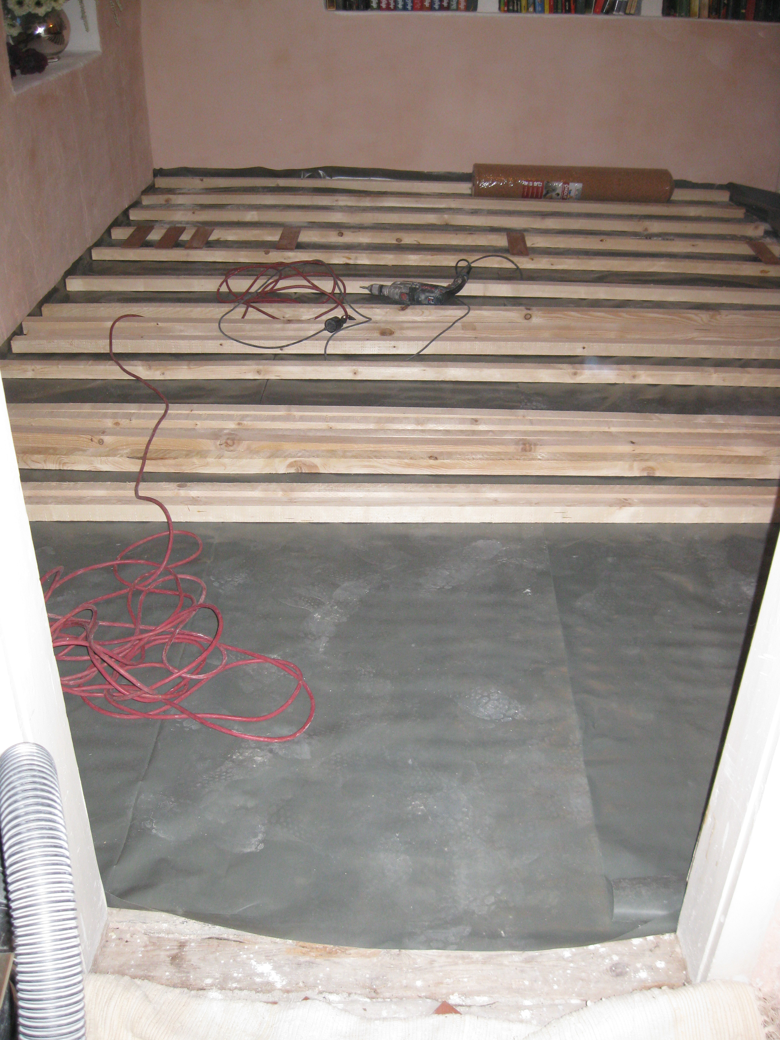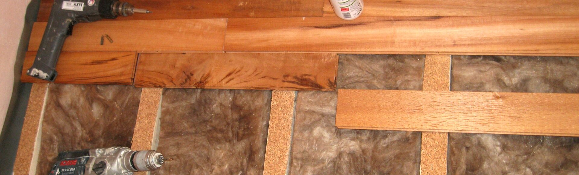 Als Unterbau für den Parkettboden habe ich zuerst eine Folie als Dampfsperre aufgelegt. Auf die Folie habe ich dann die Baustaffeln in 30 cm Abstand gelegt. Diese Baustaffeln wurde durchgebohrt und ich habe mit passenden Schrauben und Dübeln die Baustaffeln am Boden fest verankert. Auf die Baustaffeln habe ich Korkfolie getackert, die ich vorher in Streifen passend zugeschnitten habe. Ein wenig erschwerend war, dass die Schränke während des Bodenlegens im Zimmer bleiben mussten. Die Holzwolle als Dämmung wurden einfach hineingelegt.