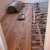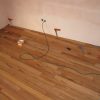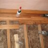 Das Schlafzimmer ist nicht rechtwinkelig, alle vier Wände stehen irgendwie schräg zueinander. Also habe ich mir einfach die Seite näher am Fenster ausgesucht, um mit dem Legen des Parkettboden zu beginnen. Gleich zu Beginn erwies sich die Befestigung des Parkettholzes als schwierig: Dadurch, dass das Holz sehr dünn, aber maximal spröde war, war es nicht möglich, einfach schräg durch das Holz in die Staffeln zu schrauben. Jede einzelne Schraube (es gab deren mehr als 600) musste daher vorgebohrt werden. Ich habe darauf geachtet, neues Holz entweder so abzuschneiden, dass der Übergang direkt auf einer Staffel war oder aber maximal 2 – 3 Zentimeter daneben. Die Übergänge in der Länge habe ich mit Holzleim verstärkt, der ist beim Auftragen weiss, wird aber später durchsichtigt. Überschüssigen Leim muss man sofort entfernen.