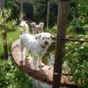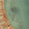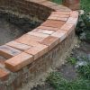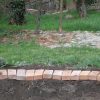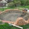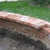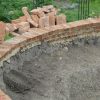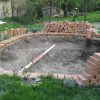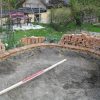 Beim Mauerbau war klar: An der oberen Hangseite sollte die Mauer deutlich niedriger sein als an der unteren Hangseite. Nur: Um wieviel? Ich habe, mangels einer Laserwaage (die ich inzwischen besitze), mit allen Mitteln versucht, irgendwie von einem zum anderen Ende eine Holzlatte zu bekommen, um einigermaßen zu wissen, wie ich mich mauertechnisch fortbewegen sollte. Erstaunlich, dass ich das letzlich mittels Augenmaß und improvisierter Wasserwaagenmessung auch tatsächlich hinbekommen habe. Aber manchmal braucht man beim Handwerken auch einfach Glück. Bevor ich die erste Schar Ziegel gelegt habe, habe ich das Erdreich mit Schotter verdichtet. Beim Mauern habe ich so gemauert, dass die erste Schar nur ein Drittel um den Teich ging. Jede weitere Schar ging dann auf beiden Seiten weiter, bis dann in der letzten Schar der Mauerring rundherum gelegt wurde. Dadurch habe ich einen „geraden Teich auf abschüssigem Hang“ erreicht. Die letzte Reihe der Ziegel sollte ins Wasser hineinragen und so die Folien einigermaßen verdecken. Das heisst, dass die letzte Schar erst gemauert wurde, als die Folie schon im Teich war. Wichtig ist, dass man mit einer Bürste die Mauer bearbeitet, bevor der Mörtel komplett trocken ist, so kann man die Ziegel von heruntergronnenem Mörtel freihalten.