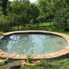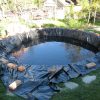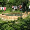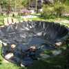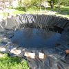 Nachdem die Mauer um den Teich fertig war, habe ich alles zusammengetragen, was ich an alten Decken, Handtüchern, Vorlegern und Co herumliegen hatte und schon längst wegwerfen wollte. Damit habe ich mangels genügend Vlies dann eine Vliesschicht gelegt. Anschliessend kam die Folie in den Teich. Folie verlegen funktioniert nur bei schönem Wetter und Sonnenschein, denn die Wärme macht die Folie weich und geschmeidig und sie lässt sich sehr schön falten, das ist natürlich besonders bei einem runden Becken wichtig. Dann wurde das Wasser eingelassen. Ein herrliches Gefühl! Nachdem das Wasser drin war, habe ich über Nacht die Folie sacken lassen. Am nächsten Tag habe ich dann die überschüssigen Ränder der Folie abgeschnitten und mit Ziegeln beschwert. Dann habe ich den oberen Rand gemauert. Es hat sich nicht vermeiden lassen, dass dabei etwas Mörtel ins frische Wasser getropft ist. Aber man muss das Wasser vor dem Mauern einlassen, damit die Folie die richtige Länge hat und man sie nicht etwa zu knapp einmauert. Aber das milchige Wasser verschwindet bald von allein.