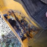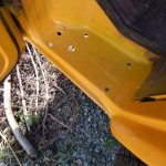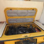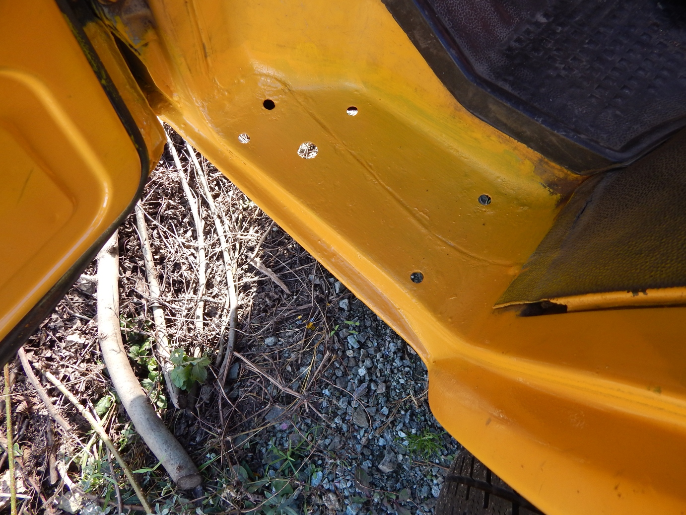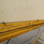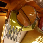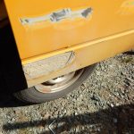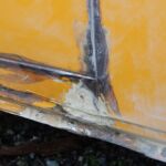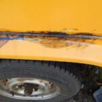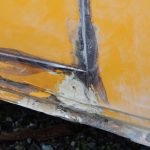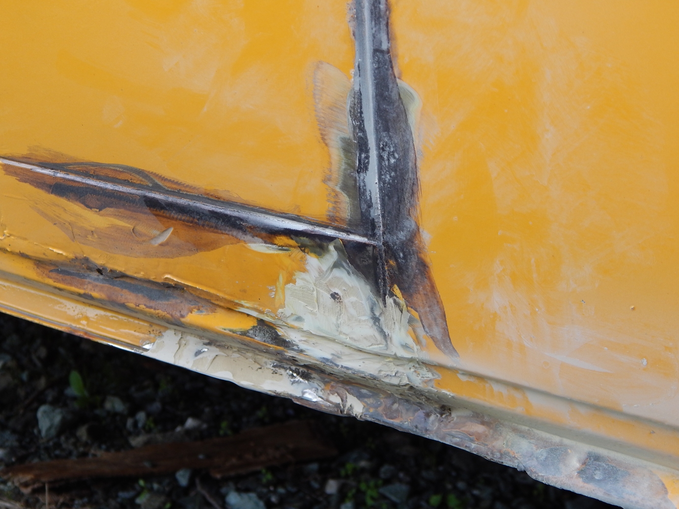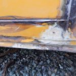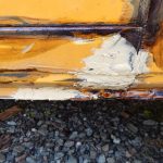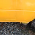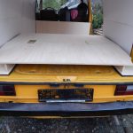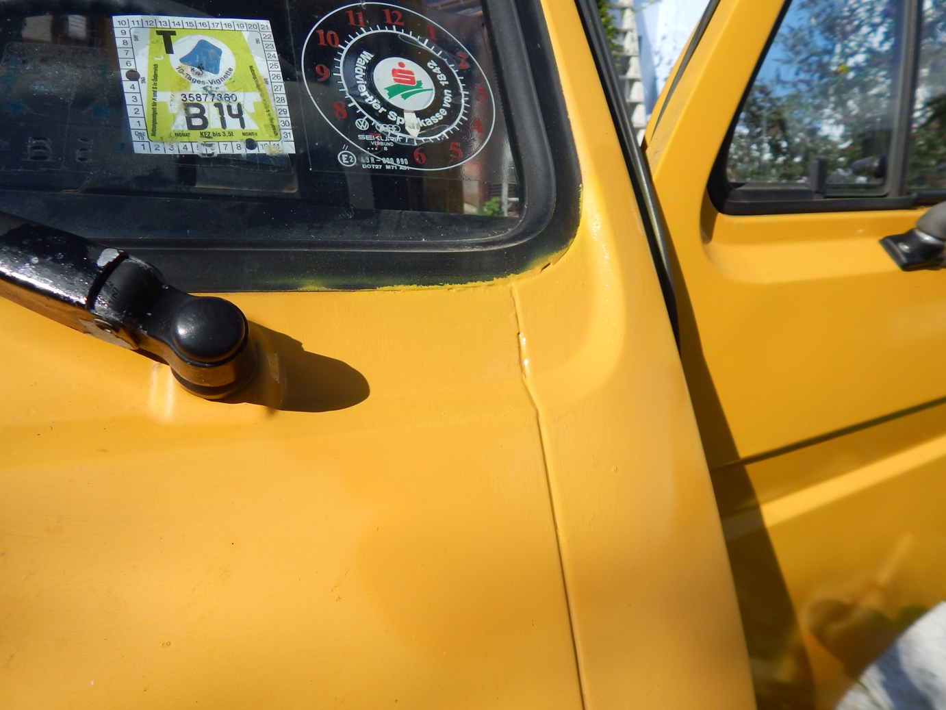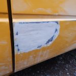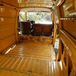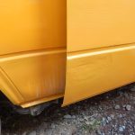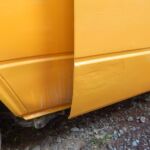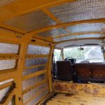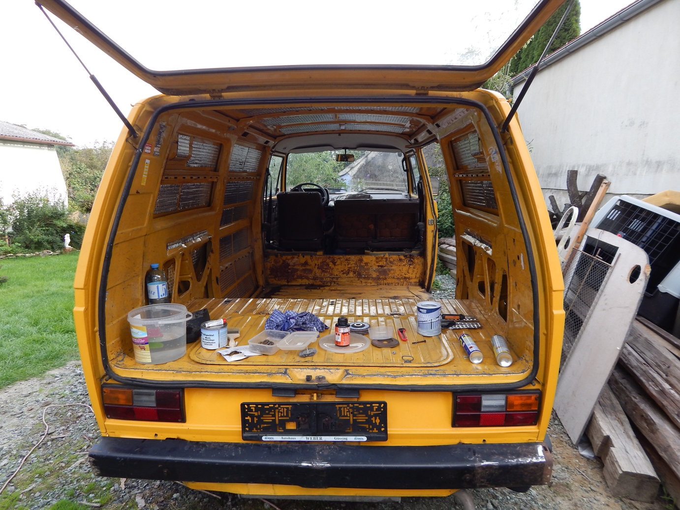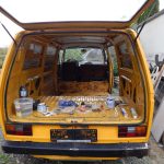 Zunächst habe ich den Bus vollkommen leergeräumt. Die bestehende Trennwand zum Fahrerraum wurde abgeschraubt, dort waren vorher die Lautsprecher verschraubt. Dann wurde der Bus grundgereinigt. Innen und außen wurde dann auf vorhandene kleine Roststellen Rostumwandler aufgetragen. Im Außenbereich kam auch die Schleifmaschine zum Einsatz, da gabs ein paar Stellen, die einer etwas intensiveren Behandlung bedurften. Nachdem der Rostumwandler trocken war, wurde an zwei kleinen Stellen Spachtelmasse eingesetzt, die wurde dann glattgeschliffen. Zum Schluss wurde alles mit Sprühlack aus der Dose neu lackiert. Die Stossstangen wurden in schwarzer Farbe neu lackiert. Nicht perfekt, man sieht natürlich, dass da etwas gemacht wurde, aber für mich war wichtig, dass der Rost erstmal in Schach gehalten wurde. Für eine professionelle Lackierung hatte ich kein Budget.