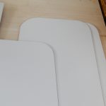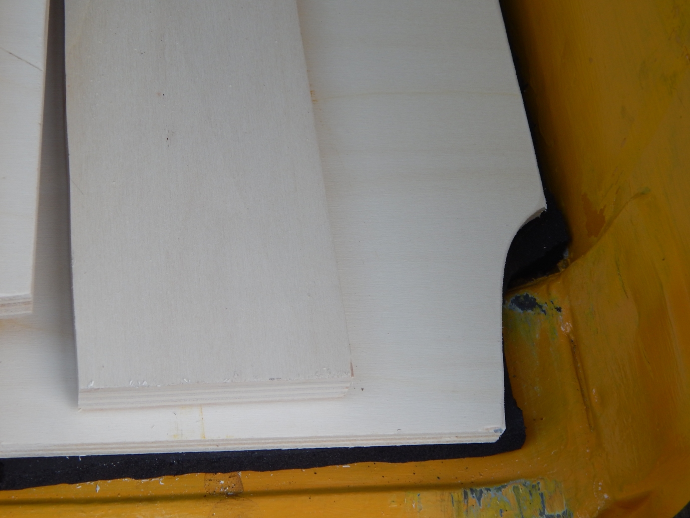 Nach Plan wurden nun zunächst die Leimplatten, später auch die HDM-Platten zugeschnitten, die Kanten wurden mit der Schleifmaschine sorgfältig abgeschliffen. Beides lässt sich prima mit einer Stichsäge erledigen. Je feiner die Säge, desto weniger „zerreisst“ es die Ränder, das ist vor allem bei den HDM-Platten wichtig. Dann habe ich probeweise das Holz ausgelegt, hat wunderbar gepasst. Nicht bedacht hatte ich zu dem Zeitpunkt, dass die Wände des Busses ja auch noch oben schräg sind und daher die Platten entsprechend kleiner geschnitten werden müssen, damit man sie hochklappen kann. Hat mich später x-mal Nachschneiden und nachschleifen gekostet. Andererseits: Besser, man hat zuviel Material als zu wenig.
