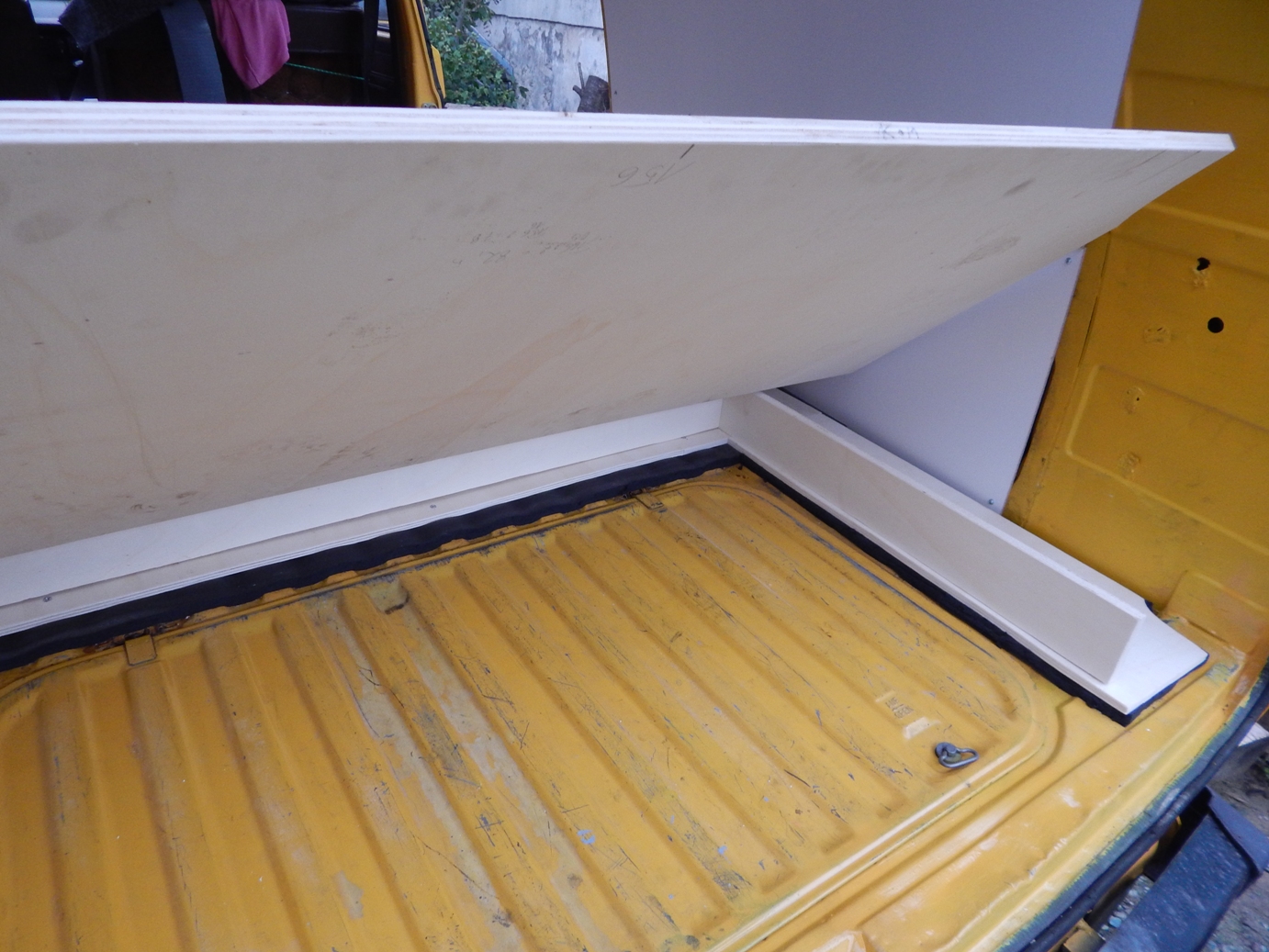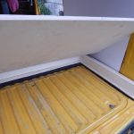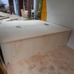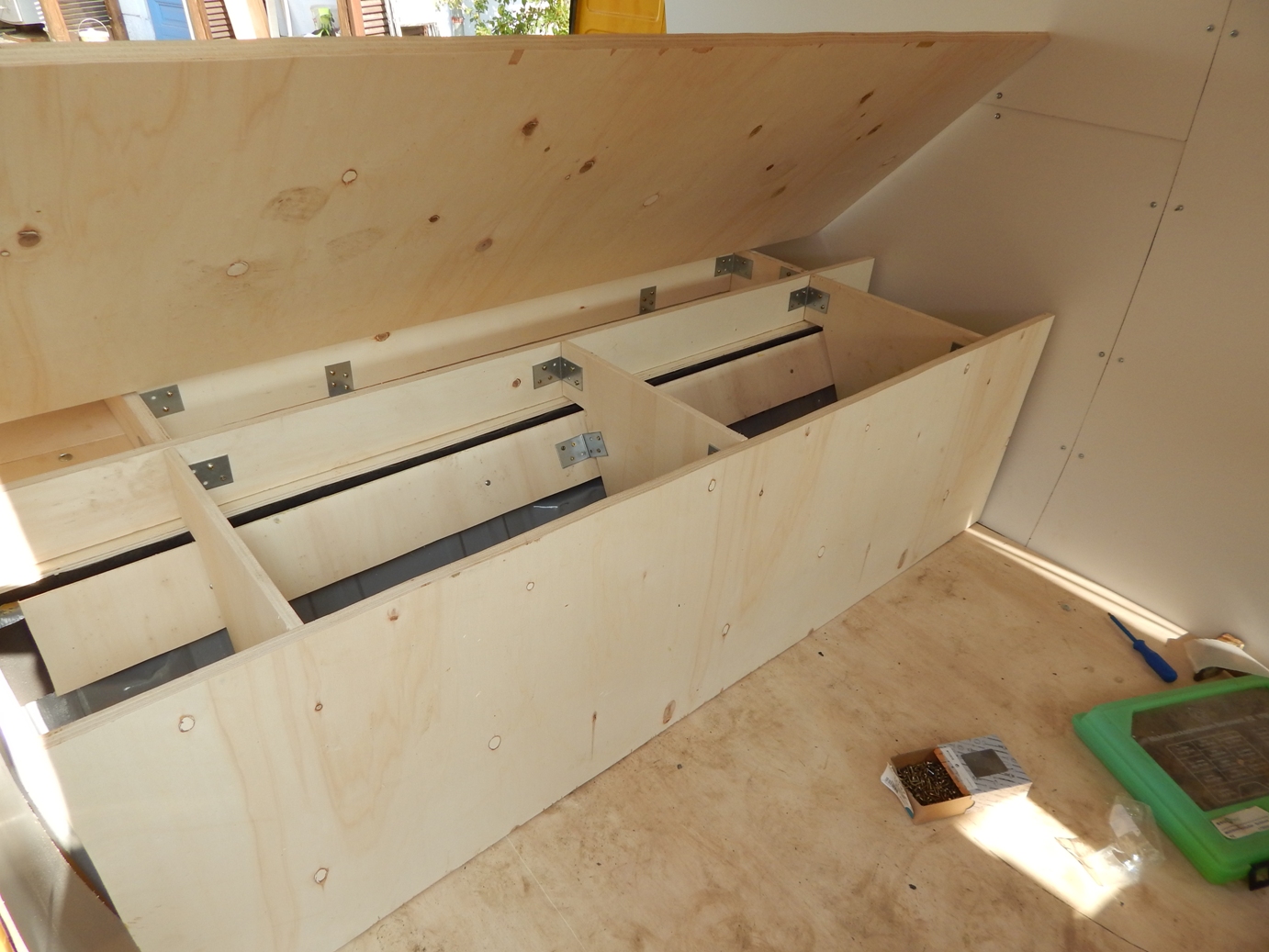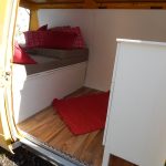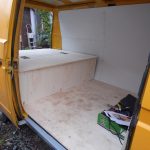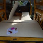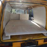 Zunächst wurden laut Plan die zugeschnittenen Platten mit dem Busboden verschraubt. Ich musste anfangs meinen Mut zusammennehmen, um mit der Bohrmaschine durch Holz und Bus zu bohren. Aber das war dann doch leichter als gedacht, weil in den Bereichen, auf die es ankommt, außer Busboden sonst nichts ist, d.h. die Gefahr, etwas anzubohren, gibts eigentlich garnicht. Im nächsten Schritt wurden der Aufbau über dem Motorraumdeckel (hier spezieller Dank an Herrn Bernd für seine wertvollen Tipps) sowie der Aufbau über den Schrägen gemacht. Hier war die Verarbeitung recht einfach, ich habe viel mit Winkeln gearbeitet. Als Abtrennung zum Fahrerraum wurde ebenfalls eine Leimplatte verbaut. Als Abstützung des Klappbettes in aufgeklapptem Zustand dienen zwei einfache Hocker. Für den letzten aufklappbaren Teil wurde die Platte in der Mitte geteilt, so dass man bei Bedarf auch nur ein Bett aufklappen kann.