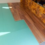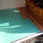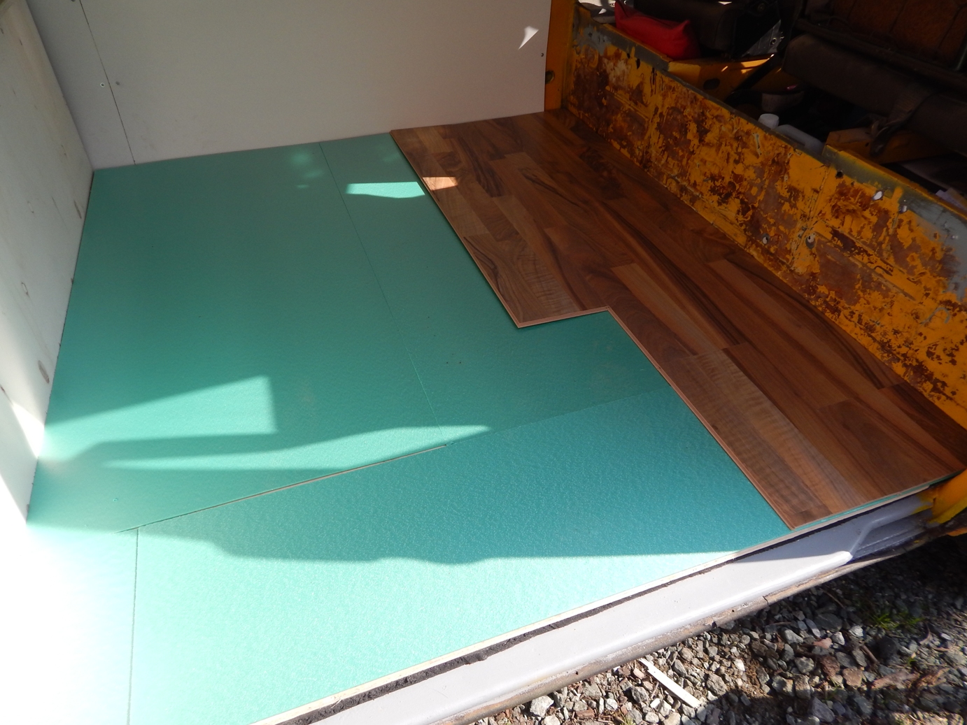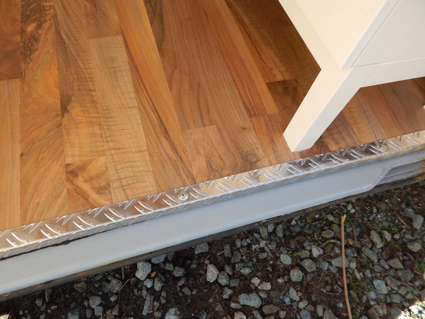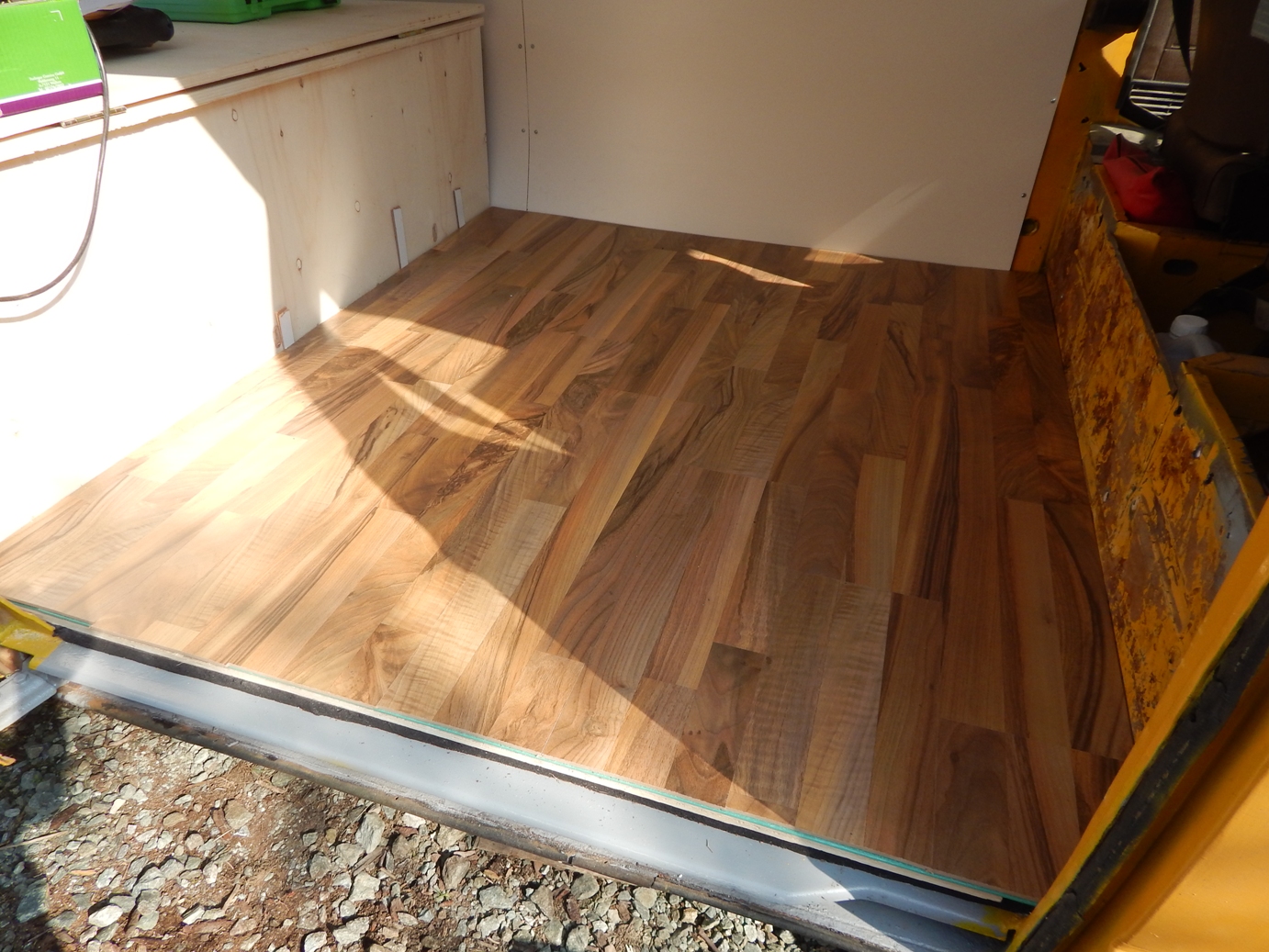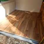 Als Fußboden wollte ich etwas, das einen wohnlichen Charakter verleiht und habe mich deshalb für Klick-Parkett entschieden. Direkt auf die aufgeschraubte Holzplatte wurde ein dünnes Parketflies gelegt, das sollte Unebenheiten ausgleichen. Darüber wurde dann das Klick-Parkett gelegt, es wurde für jede zu legende Lage individuell zugeschnitten. Das Parkett wurde nur gelegt, nicht verklebt oder verschraubt. Die Befestigung erfolgte dann mittels einer Aluleiste, die auf der Einstiegsseite des Busses fest verschraubt wurde und die Parkettbahnen fest nach unten drückt.
